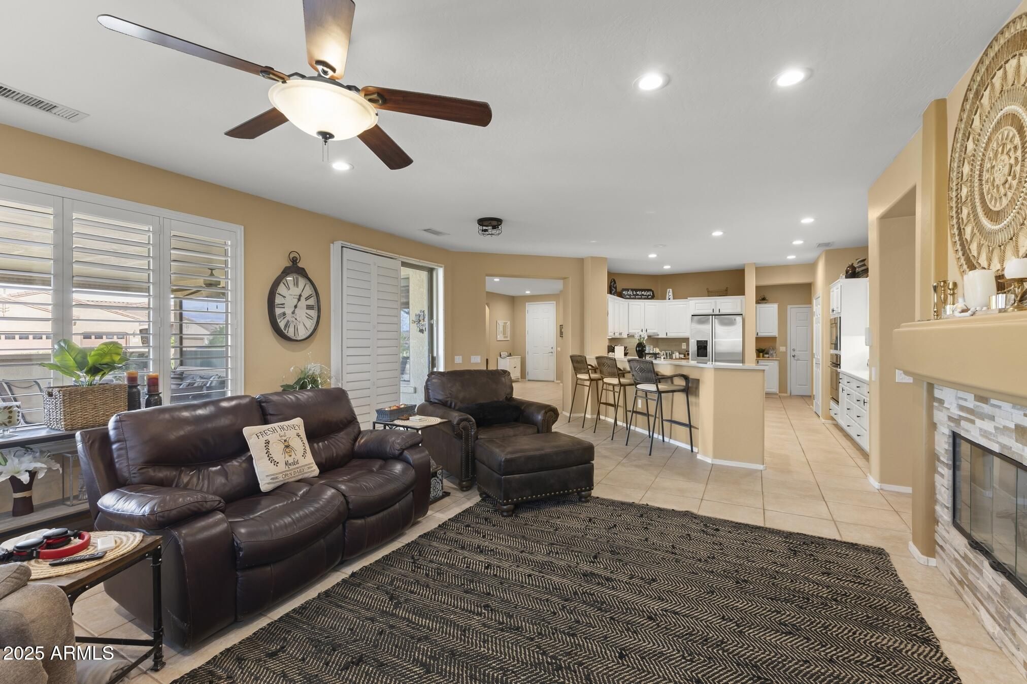 Updated 3-bedroom plus den Hacienda floor plan in Sun City Grand! Featuring plantation shutters, all-tile flooring, raised-panel doors, and a cozy fireplace. The refreshed kitchen offers solid-surface counters, stainless appliances, gas cooking, and a convection oven. Enjoy an extended backyard patio and a fully fenced yard—ideal for entertaining, privacy and pets. The full 3-car garage provides abundant space for extended trucks, vehicles, and golf carts. 2025 New Roof Underlayment. A beautifully maintained home ready for its next owner.