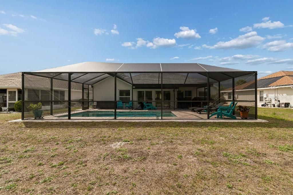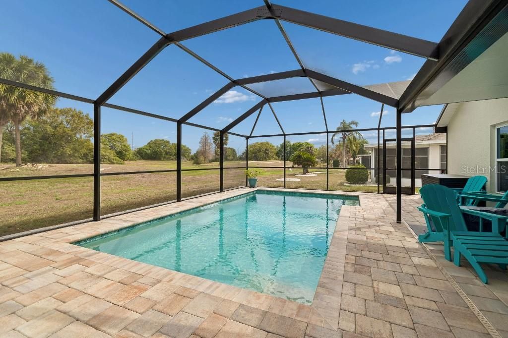 Welcome to this beautiful Nassau Model two bedroom/two bath POOL home with a conservation view. This Coloosa neighborhood home has a split plan, vaulted ceilings, living/dining combination. The master ensuite includes two walk-in closets, double sinks, walk-in shower and linen closet. The guest bedroom also has a walk-in closet. Flooring is luxury vinyl plank throughout with tile in the wet areas. Enjoy relaxing in the Florida Room as you look out onto your fully screened in new heated salt water pool and pavers built in 2024 which includes a beautiful view of a conservation area and a side view of the peaceful pond. The outdoor area includes a Weber Grill, utensil storage, new refrigerator and storage for pool floats and accessories. The laundry room includes a sink and the newer washer and dryer (12/2022). Out in the two-car garage you will find a pull down ladder for storage along with storage cabinets and shelving. Outside the home is an irrigation system as well as gutters around the home. The screened front porch provides a view of your neighbors as they walk their dogs or just relax and take in the fresh air. Some furnishings are available for purchase. This golf cart community is near I75 and within an hour of three international airports, major league sporting events, amusement parks and best of all--beautiful beaches. The amenities of Sun City Center include indoor and outdoor pools, fitness center, tennis and pickle ball courts and over 200 clubs/activities. Don't miss the opportunity to live in he best and most economical 55+ community in Florida.
