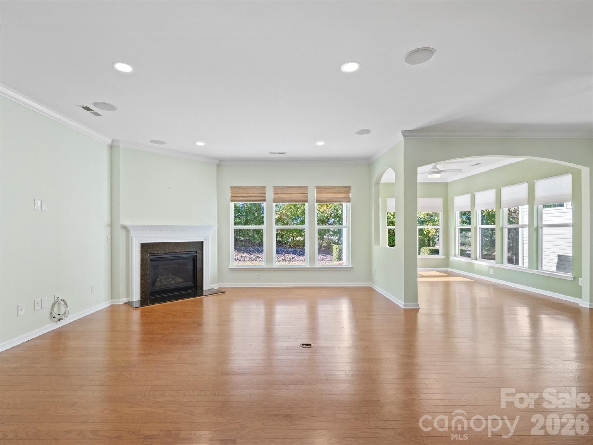 Welcome to Sun City Carolina Lakes, where easy living meets refined comfort in one of the region’s most desirable active adult communities. This move-in-ready Copper Ridge model is tucked away on a quiet cul-de-sac, offering a rare sense of privacy with mature trees behind the home and no direct rear neighbors. The backyard backs to the community’s golf course, providing seasonal natural views and a peaceful, open backdrop. Inside, timeless finishes and thoughtful updates make this home truly turn-key. Rich wood flooring, crown molding throughout, and plantation shutters in the office and bedrooms create a warm, classic atmosphere. The dedicated home office - which could also serve as a third bedroom - features custom built-in shelving. The kitchen blends charm and functionality with white cabinetry, pull-out drawers, and an updated backsplash, flowing seamlessly into the light-filled living area anchored by a cozy gas fireplace - perfect for relaxed evenings at home. The living and dining spaces extend into a bright sunroom that opens to a spacious patio with an adjustable awning, ideal for morning coffee, quiet afternoons, or entertaining while enjoying the tranquil tree-lined setting. Both bathrooms have been tastefully refreshed with new vanities, updated lighting, and modern shower finishes. The primary suite offers a generous bedroom, a spa-inspired bath with soaking tub, a separate tiled shower, and a large walk-in closet. A second bedroom provides the perfect space for guests, while the laundry room is equipped with built-in cabinetry for added storage and everyday convenience. An epoxy-finished garage with a utility sink provides a polished, practical finish to this thoughtfully designed home. Sun City Carolina Lakes residents enjoy resort-style amenities including two amenity centers, indoor and outdoor pools, fitness facilities, pickleball and tennis courts, walking trails, social clubs, and a full calendar of activities - plus a beautifully maintained golf course woven throughout the community.