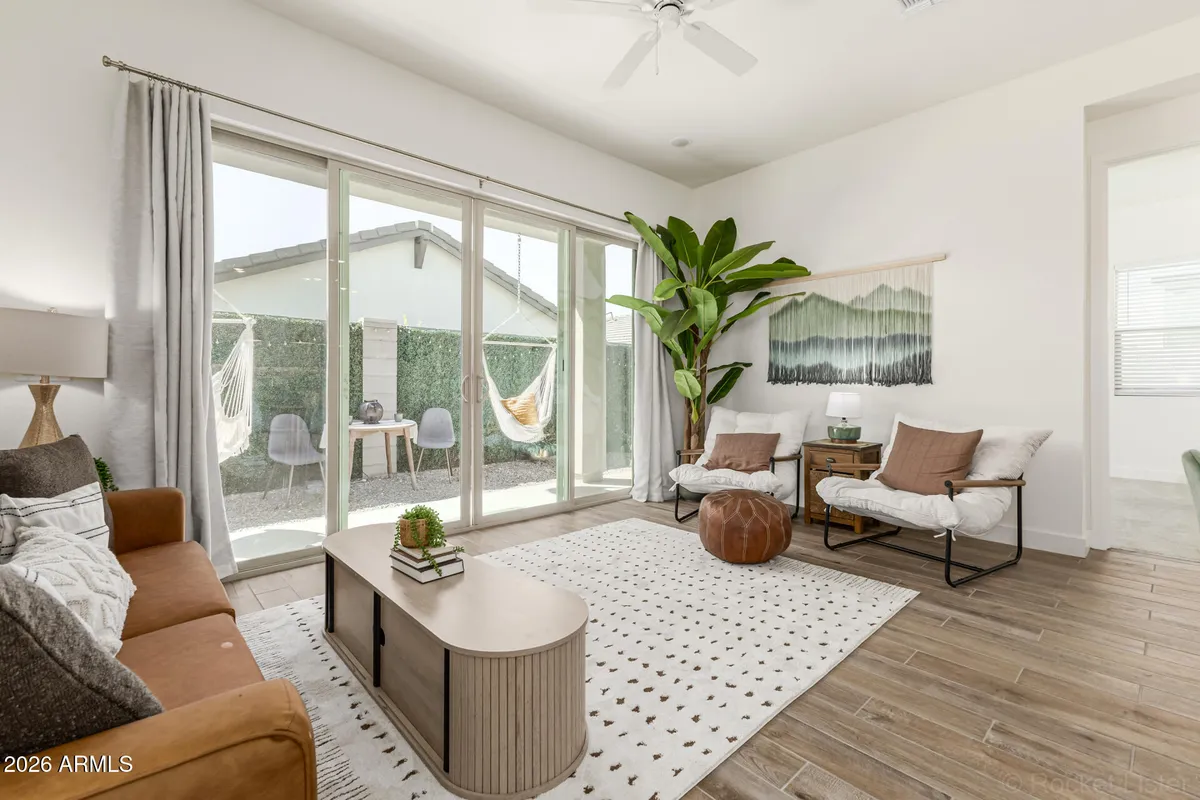 Experience active living without excess upkeep in Victory at Verrado- Buckeye's premier 55+ resort community. Designed for a lock-and-leave lifestyle, this move-in-ready home offers 3 bedrooms and 2 baths with flexible space for guests, hobbies, or dedicated offices-ideal for full-time or seasonal living. Step into a home where upgrades are already complete, including window coverings, RO system, pendant lighting, under-cabinet lighting, laundry cabinetry, and all appliances convey. Expansive 12' sliding glass doors open to a private south-facing patio with hanging chairs and a paver dining area-ready for outdoor living from day one. Energy Star cooling, heating, and windows support lower utility costs, while established landscaping with automated irrigation creates a low-maintenance second home perfect for travel and easy ownership. The efficient floor plan includes a garage designed to accommodate a vehicle plus golf cart or e-bikes with additional storage or workshop space. Take in White Tank Mountain views with morning coffee or evening sunsets from the south-facing patio, extending indoor-outdoor living. Enjoy all the perks of Verrado plus Victory amenities including 4 pools, spa, pickleball courts, and a full fitness center with exercise studio. Located in the Roma neighborhood just moments from Victory's golf, dining, fitness, and social events, this home is ideal for seasonal residents, downsizers, remote workers, or retirees. Quiet cul-de-sac location with a nearly identical home available next door-perfect for friends or family seeking independence with proximity.