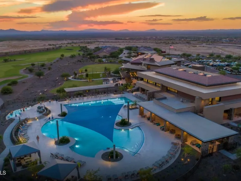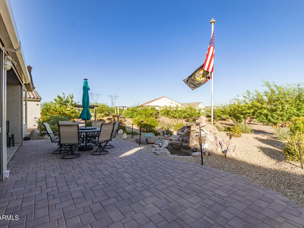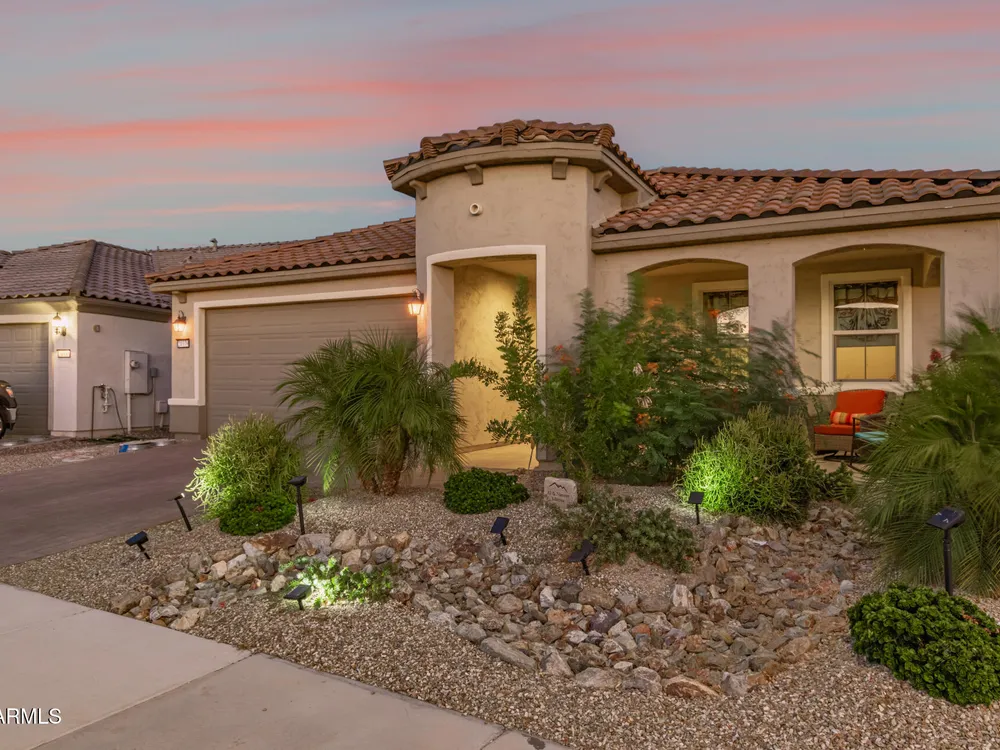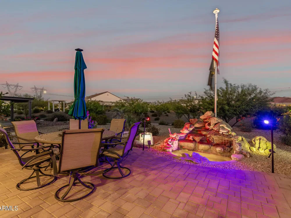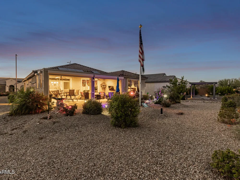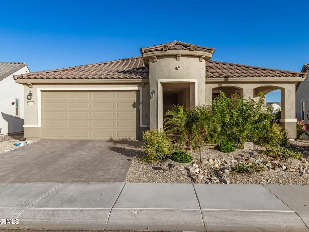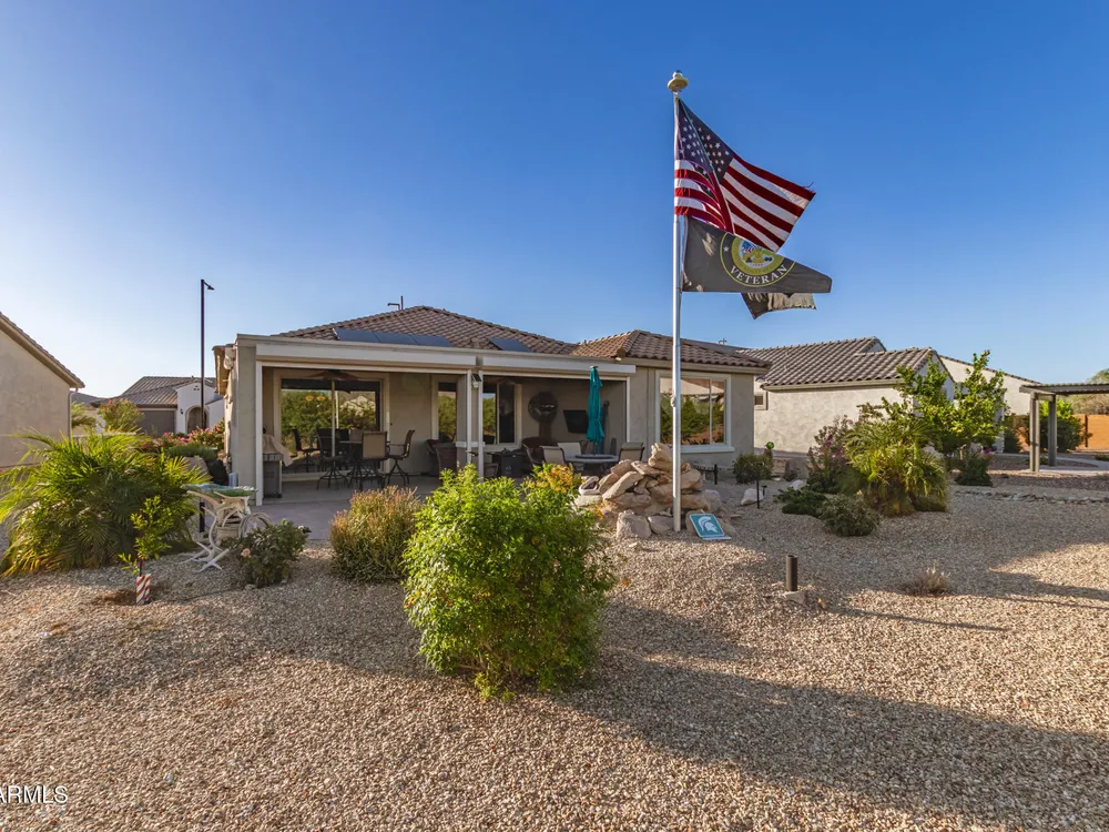 Built in 2023 and better than new, this home in the 55+ Del Webb resort style community is ready for you to enjoy right now—no construction delays, no waiting for landscaping, appliances, or window coverings. Everything has already been done for you, and furniture is included—just bring your suitcase! From the moment you step onto the extended front porch with its oversized 9-ft entry door, you'll notice the thoughtful upgrades throughout. Inside, the kitchen shines with LG top-of-the-line appliances. A spacious corner pantry offers abundant storage, and the open layout makes it perfect for entertaining. Out back, enjoy your own private oasis with a professionally installed 12x30 ft roller-shielded patio, giving you flexible space to relax either enclosed or open to the elements. The patio leads to a beautifully landscaped yard with no homes behind, just peaceful views. A custom stone waterfall, sourced from Arizona's vibrant landscape, adds a tranquil touch, while over 50 plants and 3 mature trees on a drip system make outdoor living low-maintenance and lush year-round. This home includes a solar panel system providing energy efficiency and lower utility bills. Enjoy sustainable living and long-term savings with this eco-friendly upgrade. The oversized garage easily fits your vehicles, storage, or workshop space, plus it comes with a like-new Star Deluxe 48V golf cart that converts to a 4-seater. Living in Sun City Festival means you're not just buying a home, you're gaining a lifestyle. Whether you're into golf, fitness, crafts, or community events, you'll love the two full recreation centers, resort-style pools and spas, group fitness studios, indoor walking track, woodshop and crafts studios, and courts for pickleball, bocce, and tennis. The 27-hole championship course managed by Troon Golf® is just the cherry on top. Located just ½ mile from fire and EMT services for peace of mind and backed by a Pulte Home Limited Warranty, this home truly offers resort-style living with all the hard work already done. Skip the wait and the extra cost- current loan is assumable at 4.25%. This is the new build, perfected.