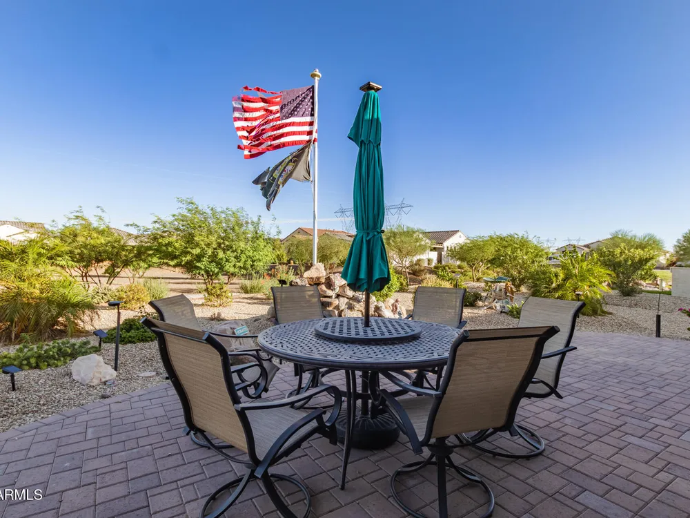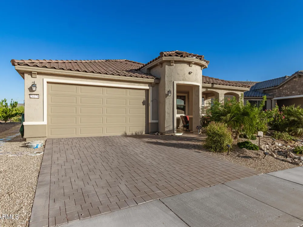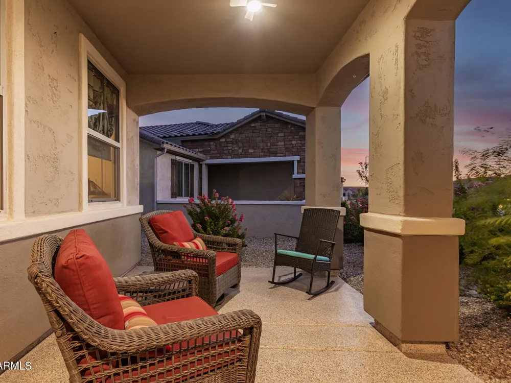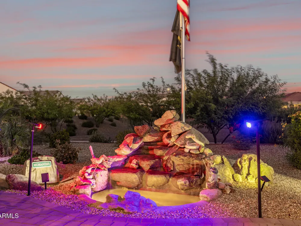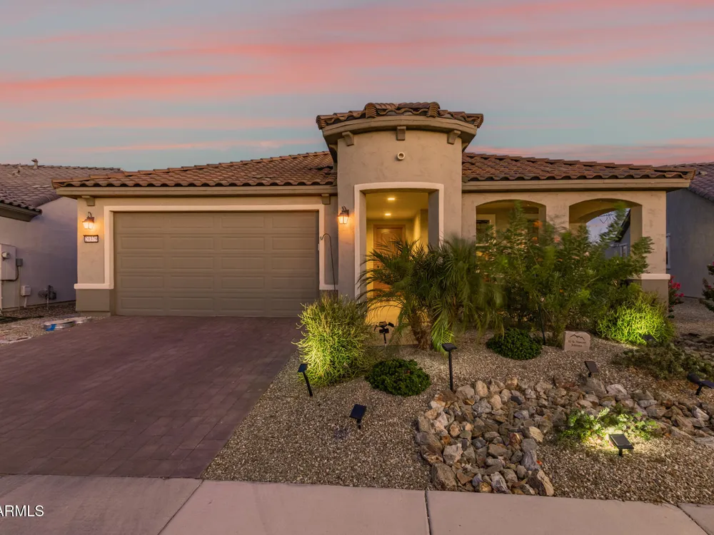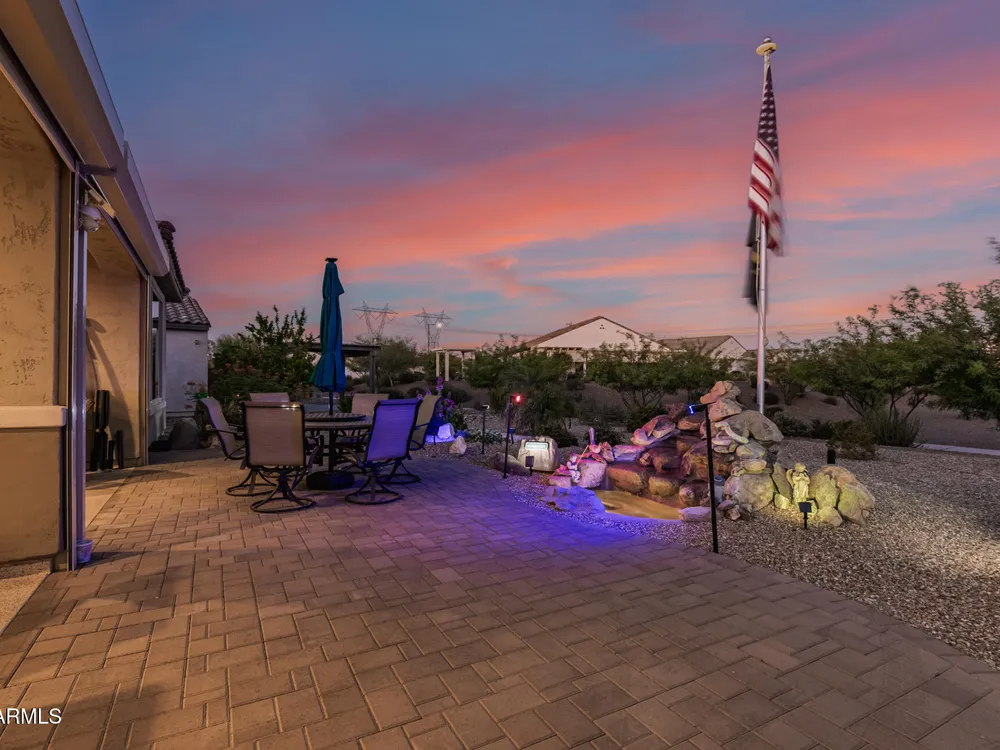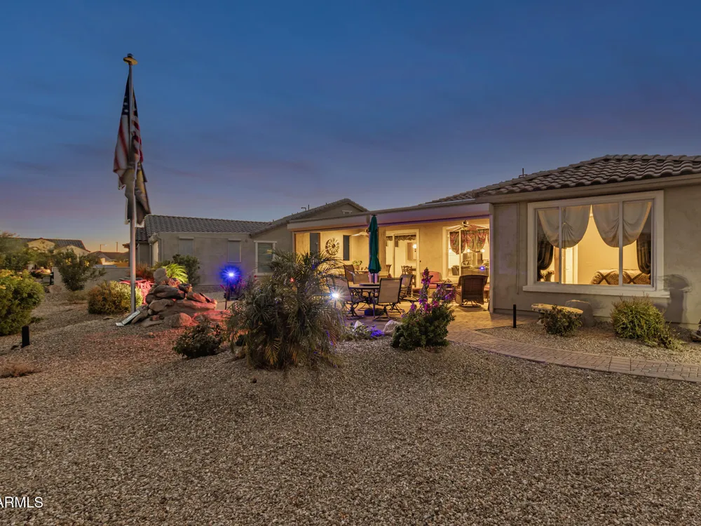 Built in 2023 and better than new, this home in the 55+ Del Webb resort style community is ready for you to enjoy right now—no construction delays, no waiting for landscaping, appliances, or window coverings. Everything has already been done for you, and furniture is included—just bring your suitcase! From the moment you step onto the extended front porch with its oversized 9-ft entry door, you'll notice the thoughtful upgrades throughout. Inside, the kitchen shines with LG top-of-the-line appliances. A spacious corner pantry offers abundant storage, and the open layout makes it perfect for entertaining. Out back, enjoy your own private oasis with a professionally installed 12x30 ft roller-shielded patio, giving you flexible space to relax either enclosed or open to the elements. The patio leads to a beautifully landscaped yard with no homes behind, just peaceful views. A custom stone waterfall, sourced from Arizona's vibrant landscape, adds a tranquil touch, while over 50 plants and 3 mature trees on a drip system make outdoor living low-maintenance and lush year-round. This home includes a solar panel system providing energy efficiency and lower utility bills. Enjoy sustainable living and long-term savings with this eco-friendly upgrade. The oversized garage easily fits your vehicles, storage, or workshop space, plus it comes with a like-new Star Deluxe 48V golf cart that converts to a 4-seater. Living in Sun City Festival means you're not just buying a home, you're gaining a lifestyle. Whether you're into golf, fitness, crafts, or community events, you'll love the two full recreation centers, resort-style pools and spas, group fitness studios, indoor walking track, woodshop and crafts studios, and courts for pickleball, bocce, and tennis. The 27-hole championship course managed by Troon Golf® is just the cherry on top. Located just ½ mile from fire and EMT services for peace of mind and backed by a Pulte Home Limited Warranty, this home truly offers resort-style living with all the hard work already done. Skip the wait and the extra cost- current loan is assumable at 4.25%. This is the new build, perfected.