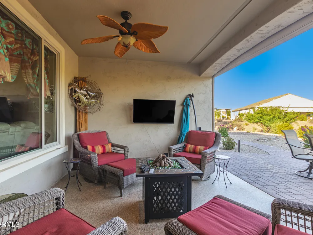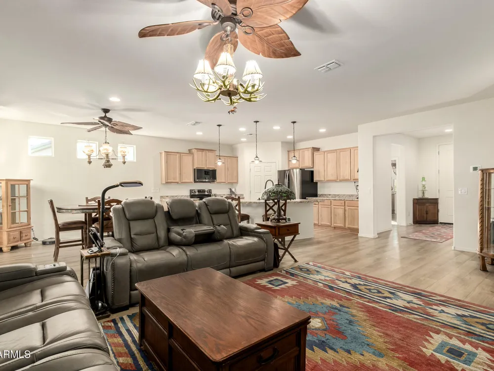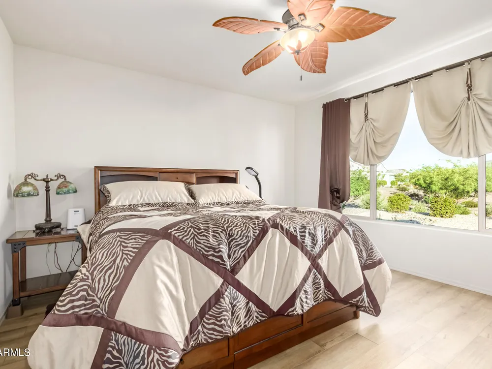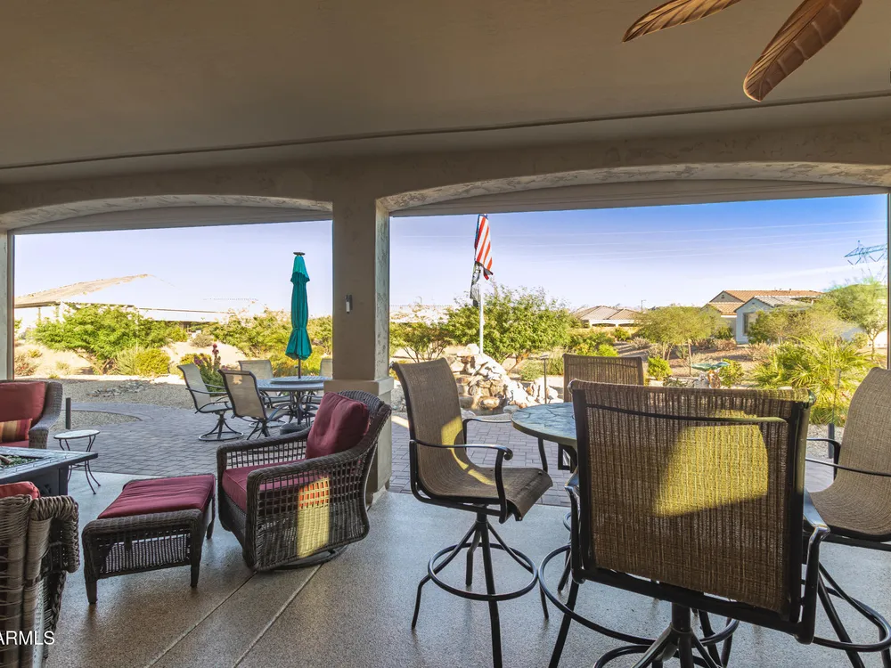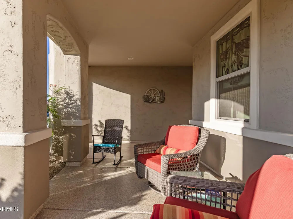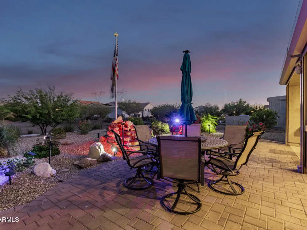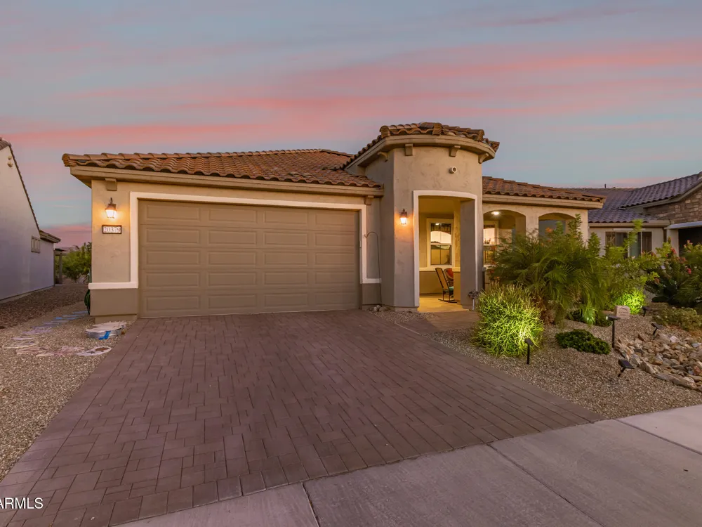 Built in 2023 and better than new, this home in the 55+ Del Webb resort style community is ready for you to enjoy right now—no construction delays, no waiting for landscaping, appliances, or window coverings. Everything has already been done for you, and furniture is included—just bring your suitcase! From the moment you step onto the extended front porch with its oversized 9-ft entry door, you'll notice the thoughtful upgrades throughout. Inside, the kitchen shines with LG top-of-the-line appliances. A spacious corner pantry offers abundant storage, and the open layout makes it perfect for entertaining. Out back, enjoy your own private oasis with a professionally installed 12x30 ft roller-shielded patio, giving you flexible space to relax either enclosed or open to the elements. The patio leads to a beautifully landscaped yard with no homes behind, just peaceful views. A custom stone waterfall, sourced from Arizona's vibrant landscape, adds a tranquil touch, while over 50 plants and 3 mature trees on a drip system make outdoor living low-maintenance and lush year-round. This home includes a solar panel system providing energy efficiency and lower utility bills. Enjoy sustainable living and long-term savings with this eco-friendly upgrade. The oversized garage easily fits your vehicles, storage, or workshop space, plus it comes with a like-new Star Deluxe 48V golf cart that converts to a 4-seater. Living in Sun City Festival means you're not just buying a home, you're gaining a lifestyle. Whether you're into golf, fitness, crafts, or community events, you'll love the two full recreation centers, resort-style pools and spas, group fitness studios, indoor walking track, woodshop and crafts studios, and courts for pickleball, bocce, and tennis. The 27-hole championship course managed by Troon Golf® is just the cherry on top. Located just ½ mile from fire and EMT services for peace of mind and backed by a Pulte Home Limited Warranty, this home truly offers resort-style living with all the hard work already done. Skip the wait and the extra cost- current loan is assumable at 4.25%. This is the new build, perfected.