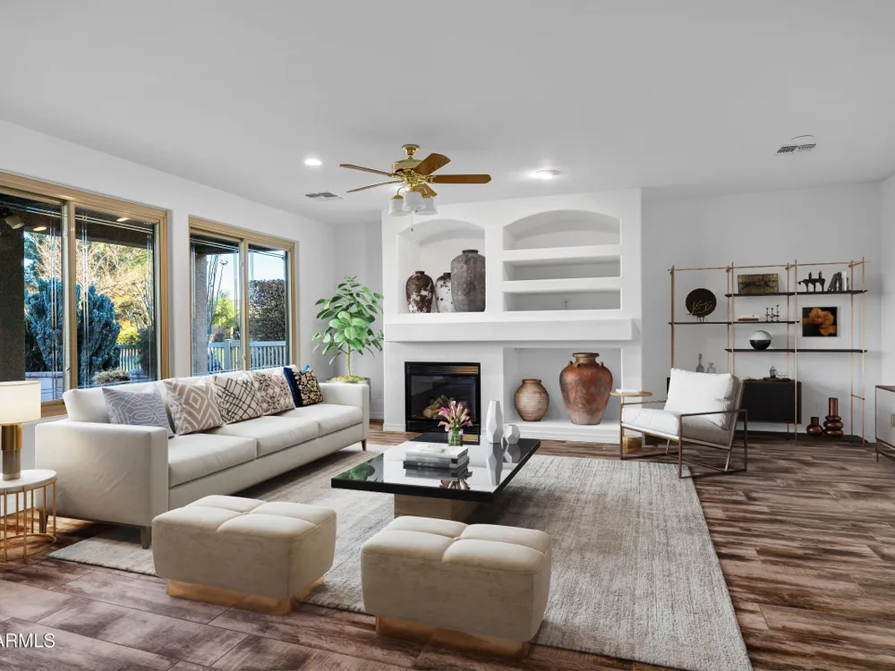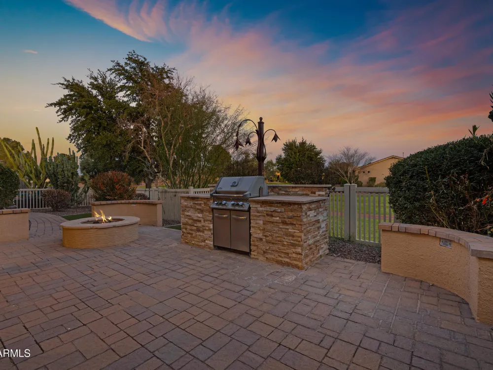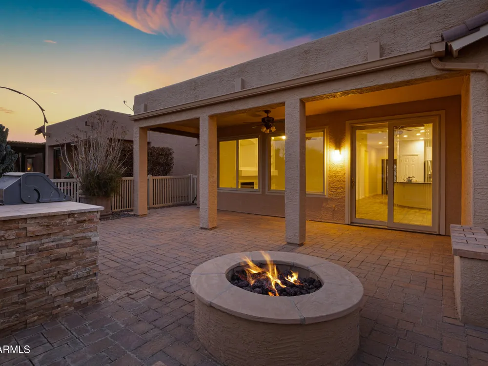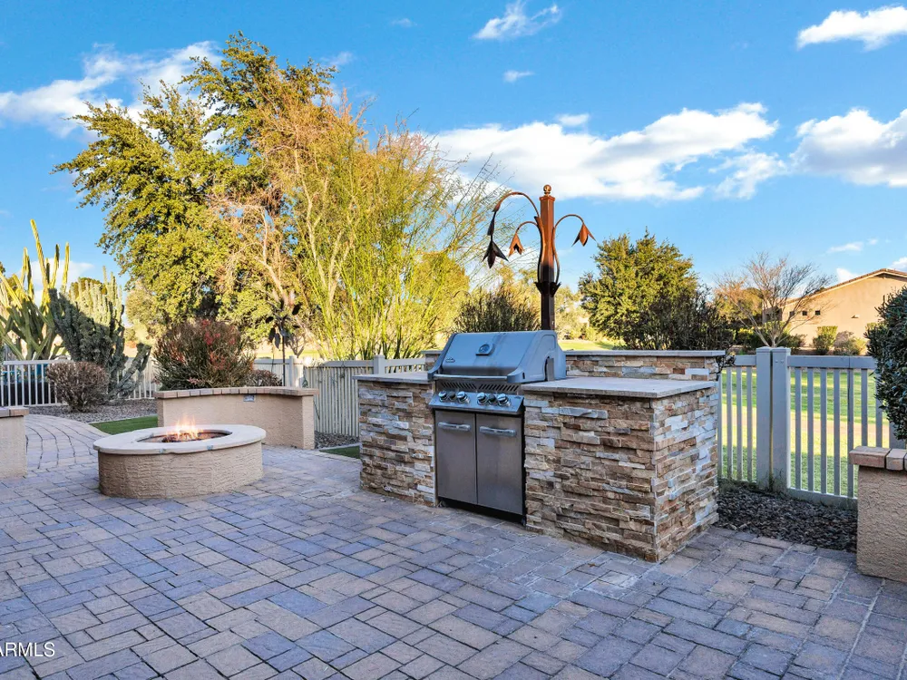 BRAND NEW HVAC JUST INSTALLED! Highly upgraded home on the greenbelt with a spectacular upgraded backyard and front courtyard for enjoying the amazing Arizona weather! The popular Iris floor plan offers two full bedrooms plus two additional flex rooms that could be used as additional bedrooms or a den or hobby room. Huge open great room to kitchen with white cabinets, granite countertops and stainless steel appliances. The entire home has been freshly painted and has all new windows and a gas fireplace in the great room. Beautiful, elegant custom front iron door welcomes you into this well maintained home. The backyard is an entertainer's dream with an extended paver patio with a built in gas bbq and gas fire pit along with mature landscaping and artificial turf.