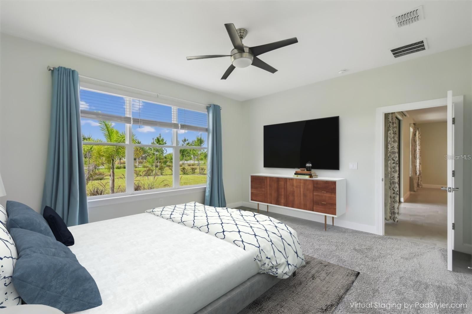 - Ceiling Fan(s), Kitchen/Family Room Combo, Open Floorplan, Main Level Primary, Solid-Wood Cabinets, Split Bedrooms, Stone Counters, Thermostat, Walk-In Closet(s), Window Treatments