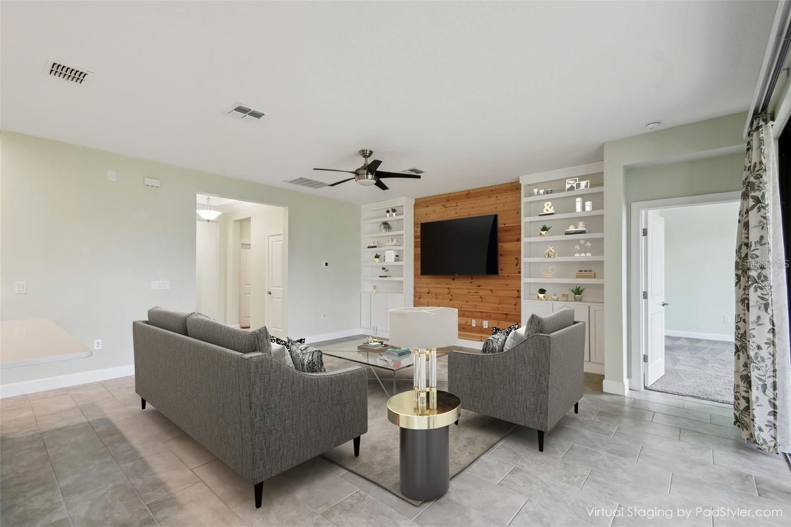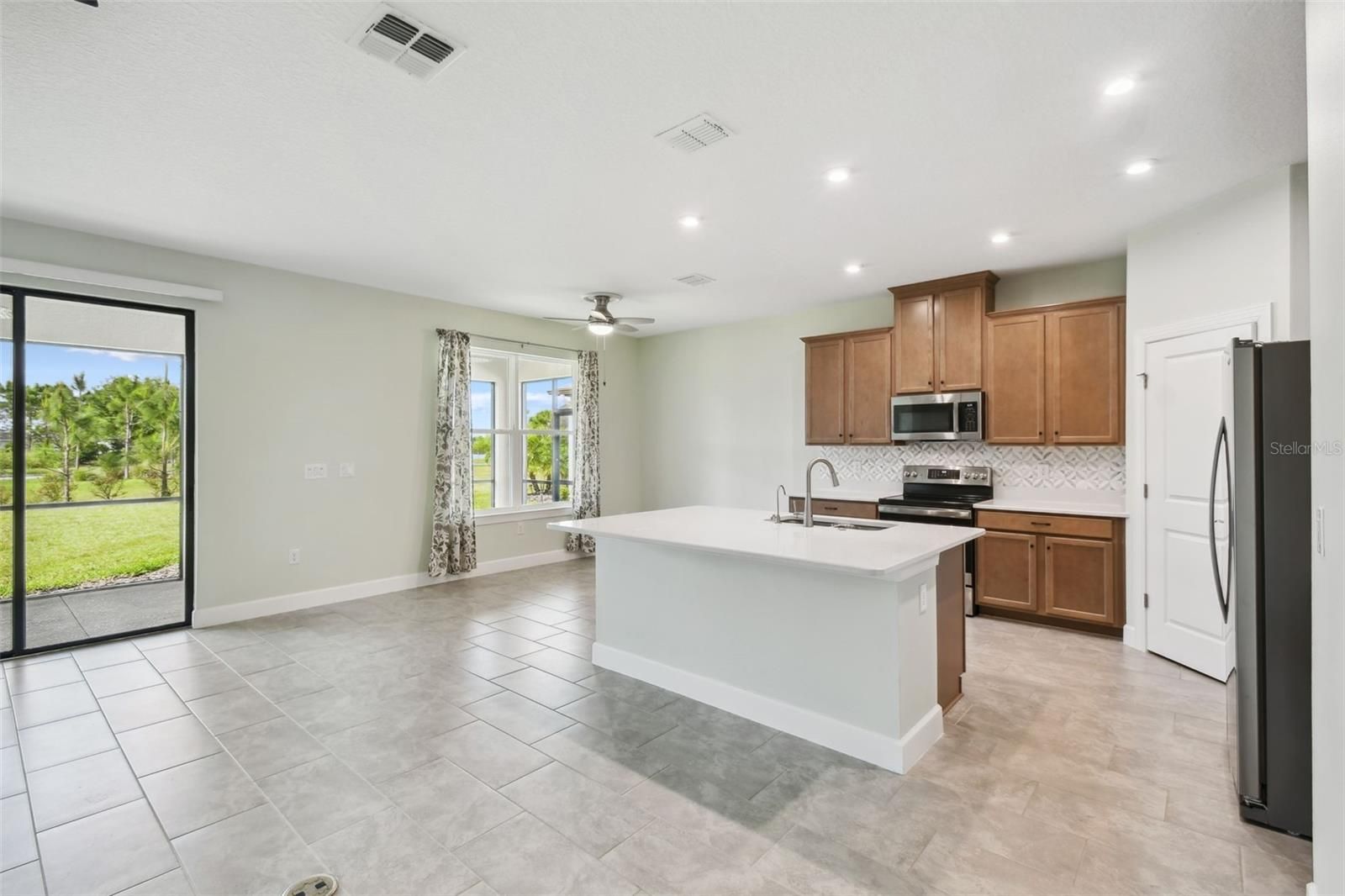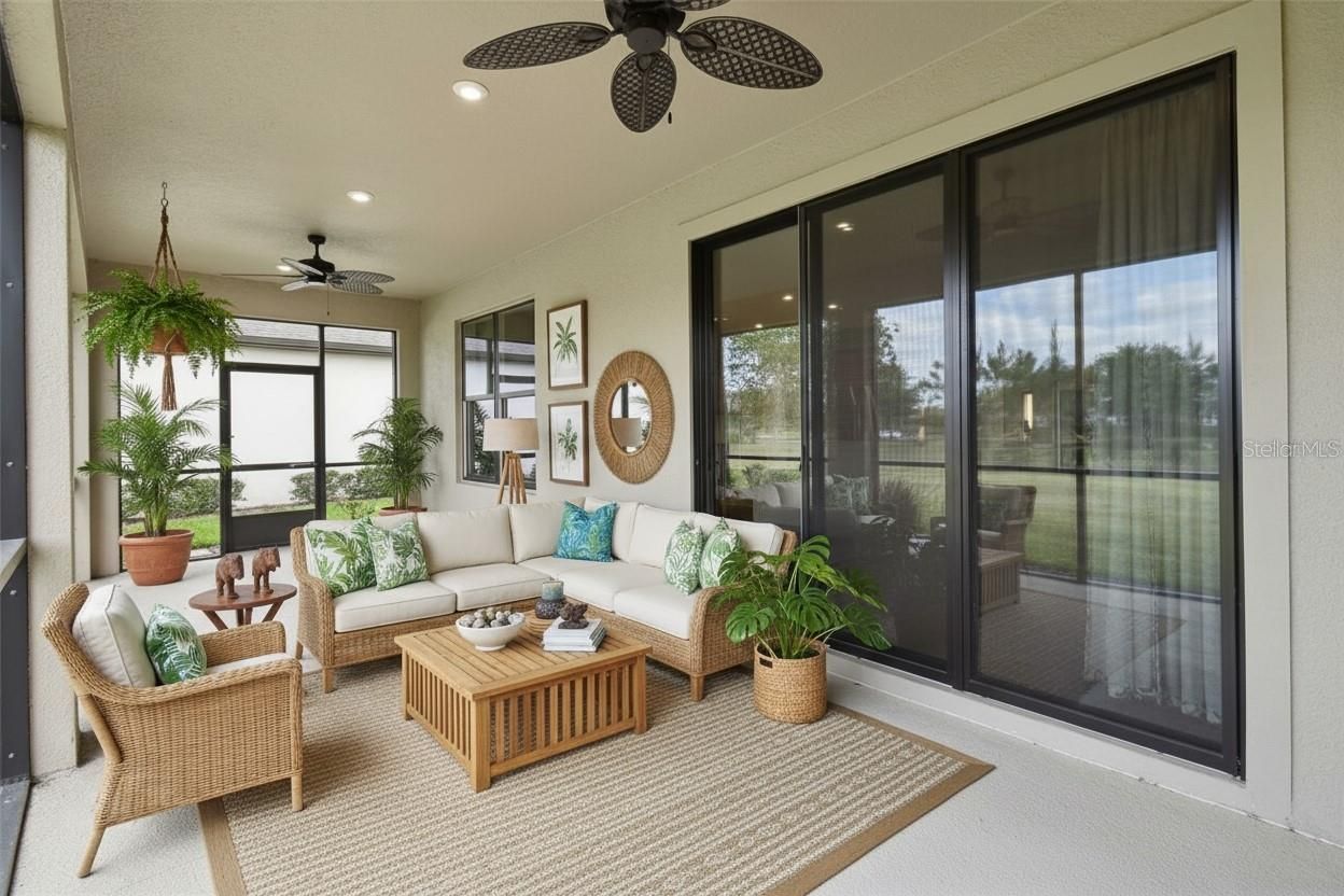 One or more photo(s) has been virtually staged. BACK ON MARKET! Buyers Contingency Fell Through! Your Gain! Welcome to this stunning, like new, 2022 Brava Model, offering 3 bedrooms, 2 bathrooms, and a thoughtfully designed layout in a prime location near the Village Center amenities. The home greets you with custom upgraded landscaping and a charming screened-in front porch, creating a warm and welcoming first impression. Step inside to discover an open-concept great room, complete with a custom accent wall that adds a touch of elegance and personality to the space. The seamless flow between the living, dining, and kitchen areas makes this home ideal for both daily living and entertaining. The kitchen is a true highlight, featuring an eat-at bar, granite countertops, a stylish tile backsplash, and a walk-in pantry for all your storage needs. Whether you’re cooking a gourmet meal or enjoying a quick snack, this space is both functional and beautiful. The primary bedroom is a luxurious retreat, boasting an extra-large walk-in closet and a spa-like en-suite bathroom. The bathroom is equipped with dual sinks, stone counters, and a custom oversized shower with a built-in seat for added comfort. The second bedroom features its own walk-in closet, providing ample storage and privacy for family or guests. The third bedroom, which can also serve as a den or study, has a glass double-door entry, offering versatility to suit your needs. The second bathroom includes a tub/shower combination, ensuring convenience for everyone. The dedicated laundry room is designed with practicality in mind, featuring a sink and custom cabinets to keep everything organized and efficient. The screened lanai offers a distant view of a pond. The backyard offers endless possibilities, with plenty of space to add a pool or create a custom outdoor oasis. It can also be fenced, making it a safe and fun area for your furry family members to enjoy. The 2-car garage provides plenty of storage space, ensuring a clutter-free home while accommodating your vehicles and belongings. This home offers the perfect blend of relaxation and recreation, making it an ideal place to call home. With its like-new condition, custom upgrades, and modern design, this Brava Model is truly move-in ready. Whether you’re looking to unwind in your spacious backyard or explore the vibrant community, this home has it all. All this in one of the top 55+ communities in America. Solivita offers residents access to state of the art amenities and work out facilities, dance and aerobics studios, 14 heated swimming pools, 2 heated spas, tennis courts, pickleball courts, softball, shuffleboard, bocce ball, billiards room, art gallery, 3 restaurants and 2 championship 18-hole golf courses. Schedule your private tour today and experience the beauty and comfort of this incredible home!