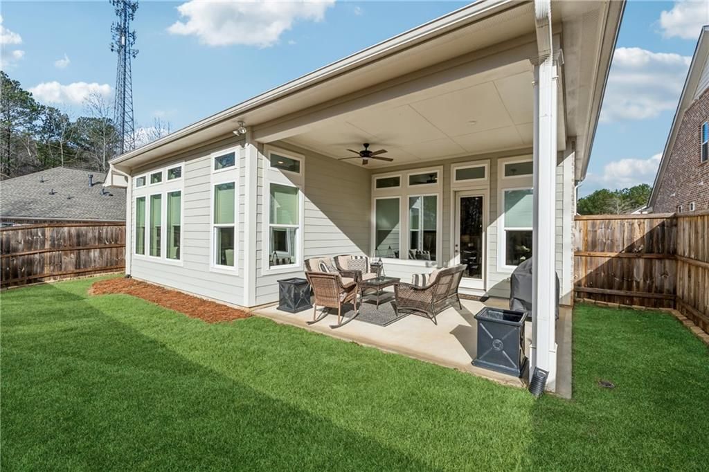 Beautiful craftsman style ranch with many upgrades on PREMIUM OVERSIZED CULDESAC LOT in gated, very active, 55+ community in sought after Woodstock location close to shopping, interstate and downtown Woodstock. BETTER THAN NEW WITH CUSTOM SHADES ON ALL WINDOWS AND CUSTOM BUILT MASTER CLOSET SYSTEM IN OVERSIZED MASTER CLOSET. Stunning open concept living with view of family, and dining area from upgraded kitchen with granite countertops and custom pantry closet. Large, oversized master offers sitting room area with giant windows facing private fenced backyard. Luxurious master bath featuring tile, granite countertops, and oversized zero entry frameless shower. Covered front porch and covered rear porch for outdoor living. Open office located off of entry way that could also be used as a separate formal dining room. LVP throughout home with carpet in bedrooms. This well-planned community offers a GATED ENTRANCE, CLUBHOUSE, FITNESS CENTER, PICKLE BALL COURTS, AND POOL.