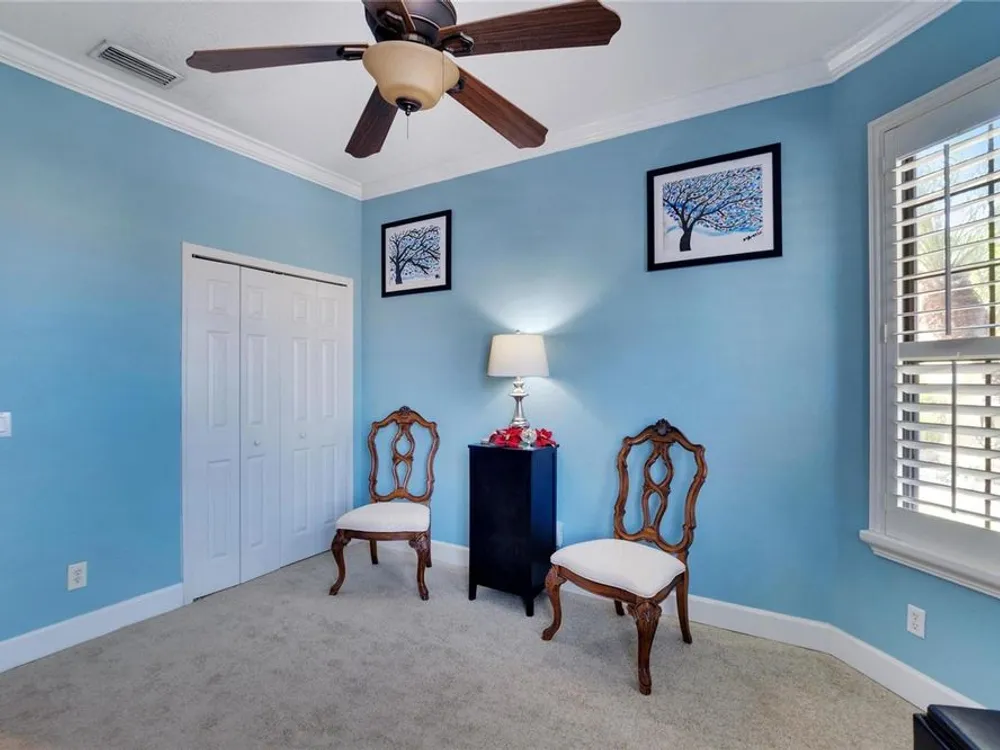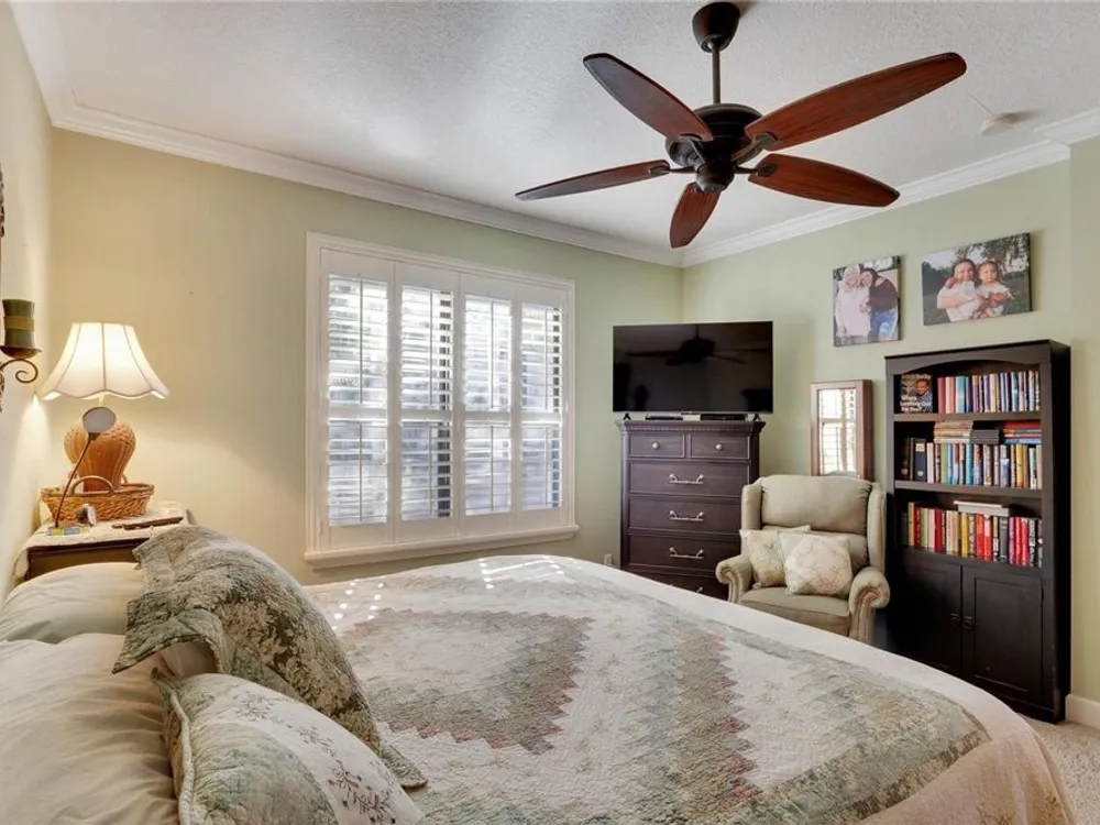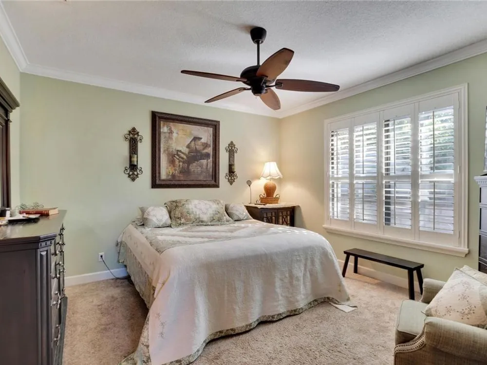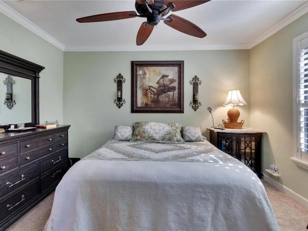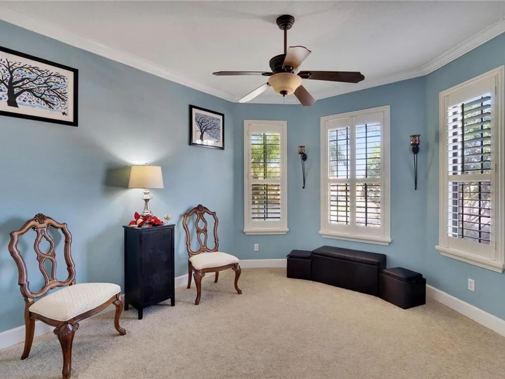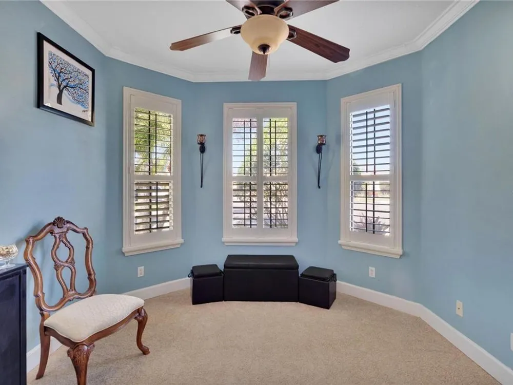 - Ceiling Fan(s), Chair Rail, Crown Molding, Open Floorplan, Main Level Primary, Solid Surface Counters, Solid-Wood Cabinets, Split Bedrooms, Stone Counters, Thermostat, Walk-In Closet(s), Window Treatments