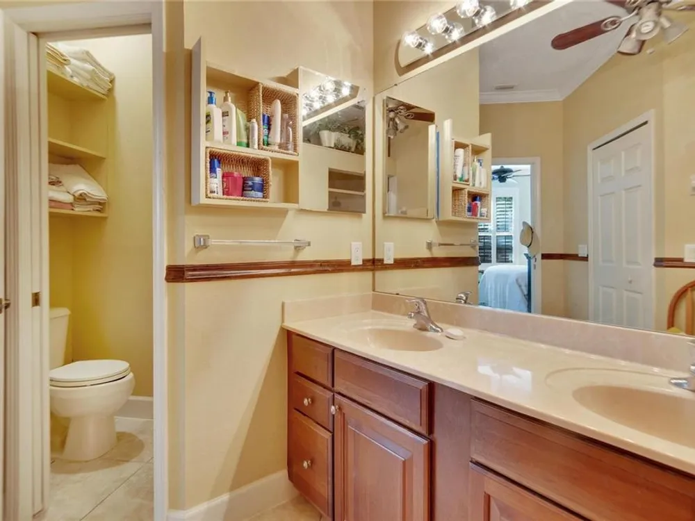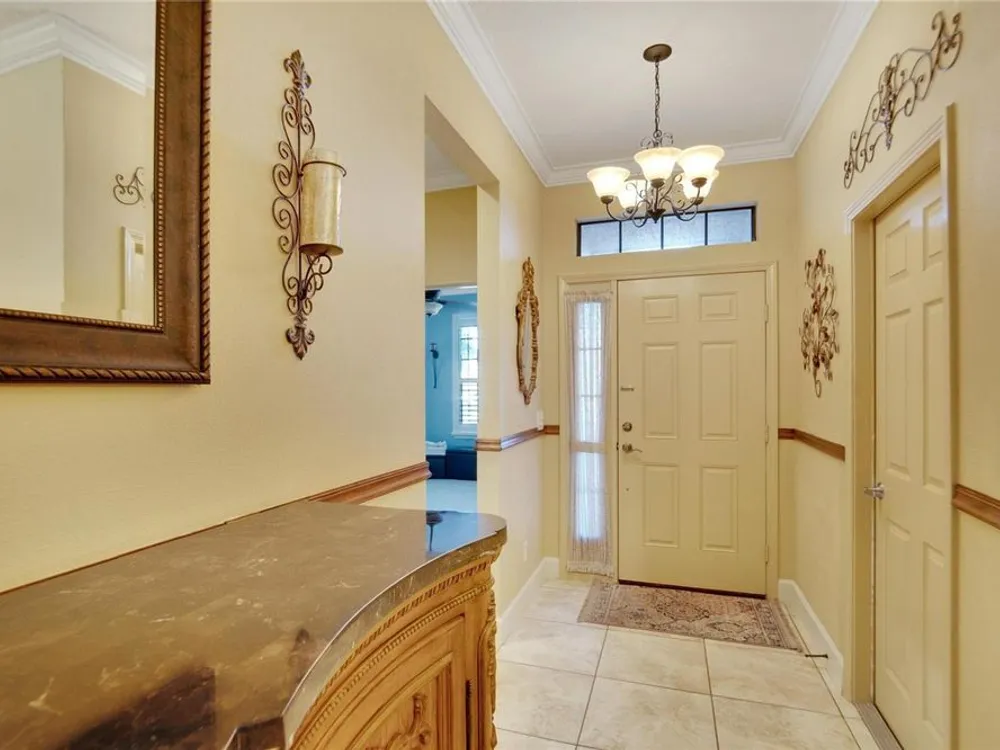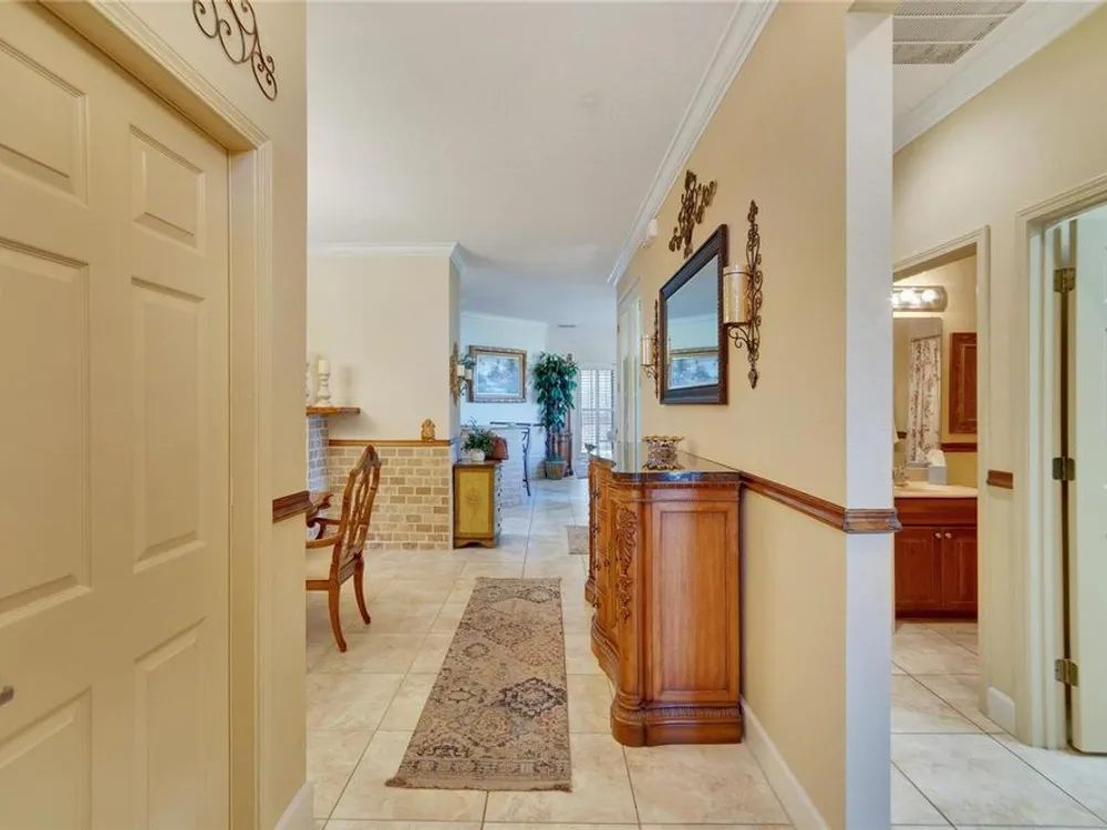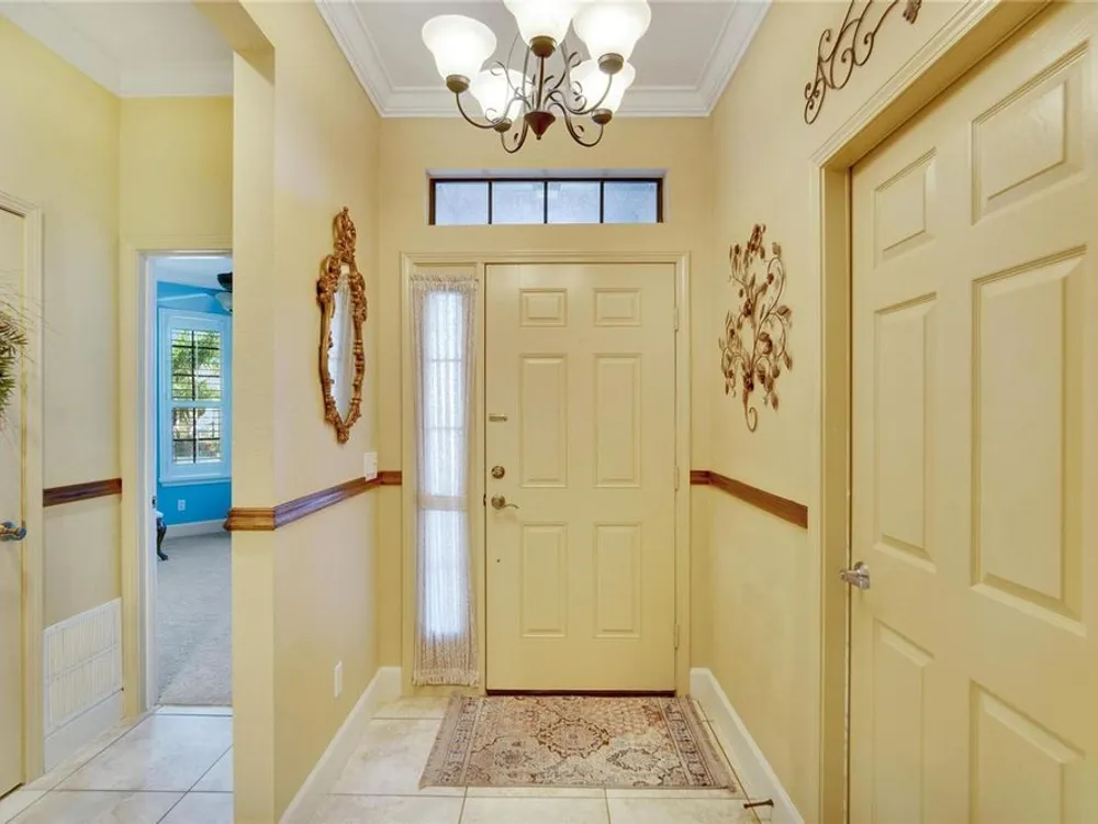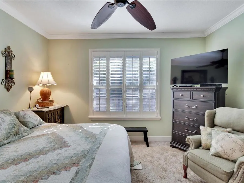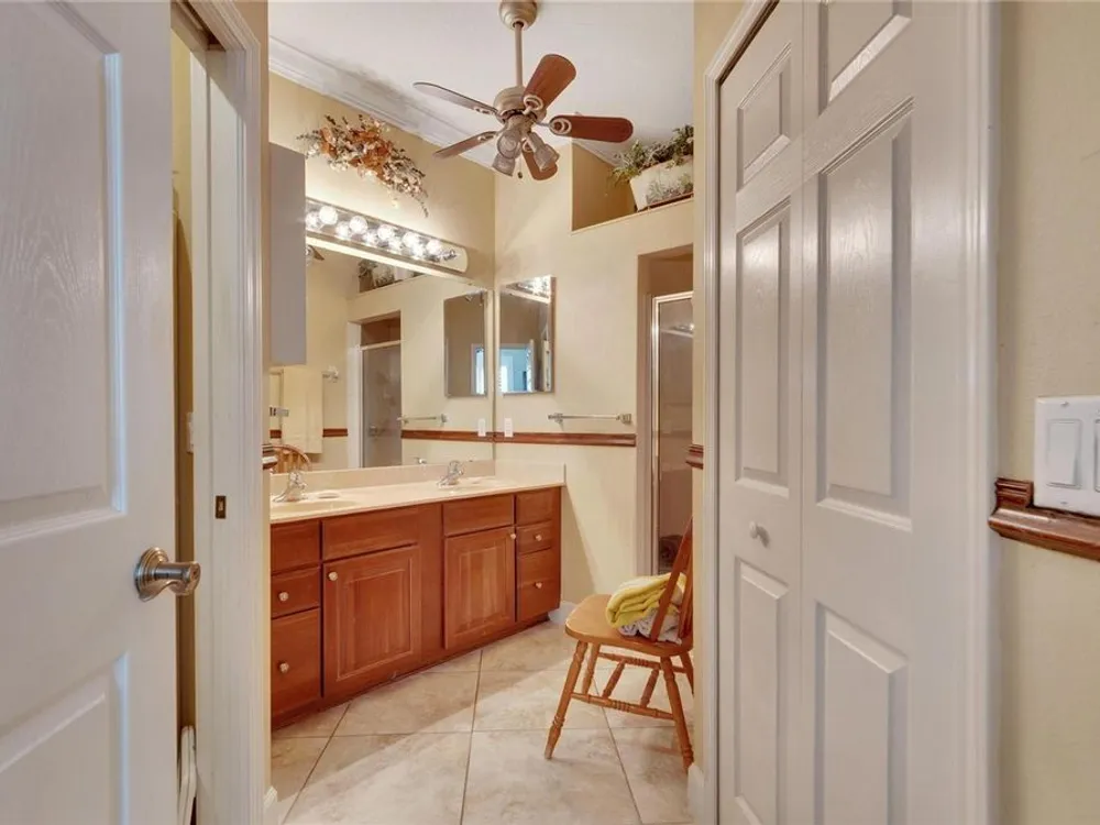 - Ceiling Fan(s), Chair Rail, Crown Molding, Open Floorplan, Main Level Primary, Solid Surface Counters, Solid-Wood Cabinets, Split Bedrooms, Stone Counters, Thermostat, Walk-In Closet(s), Window Treatments