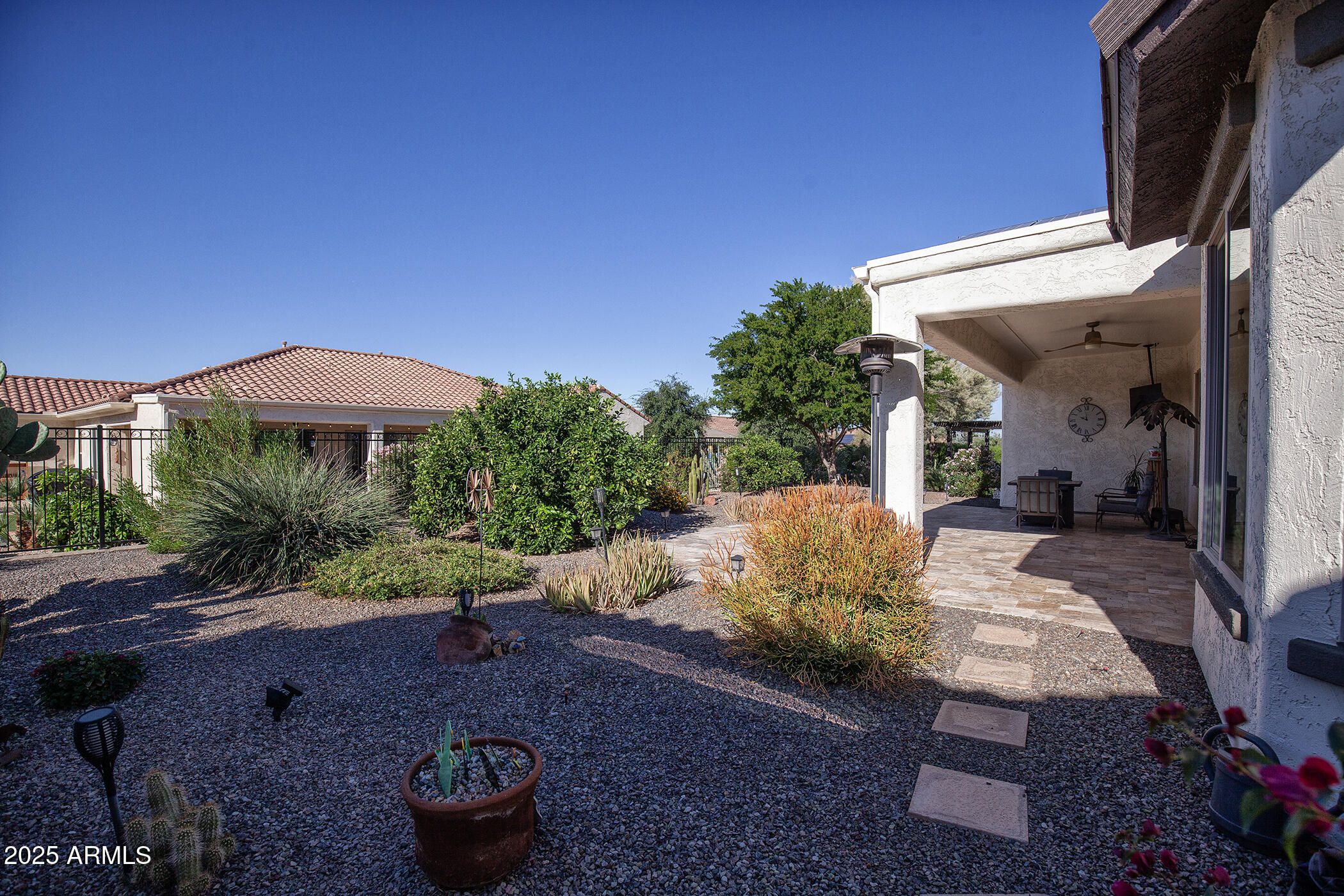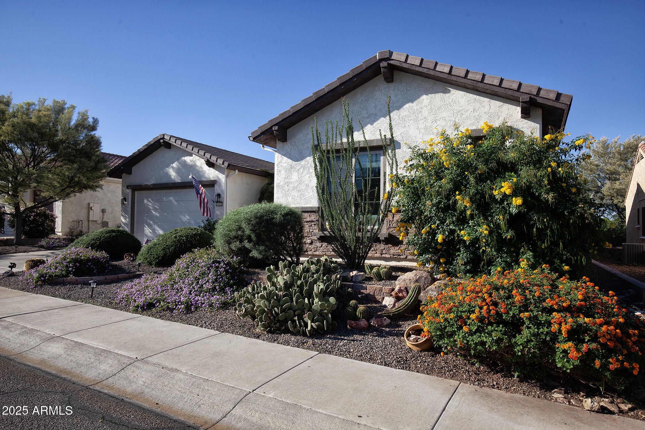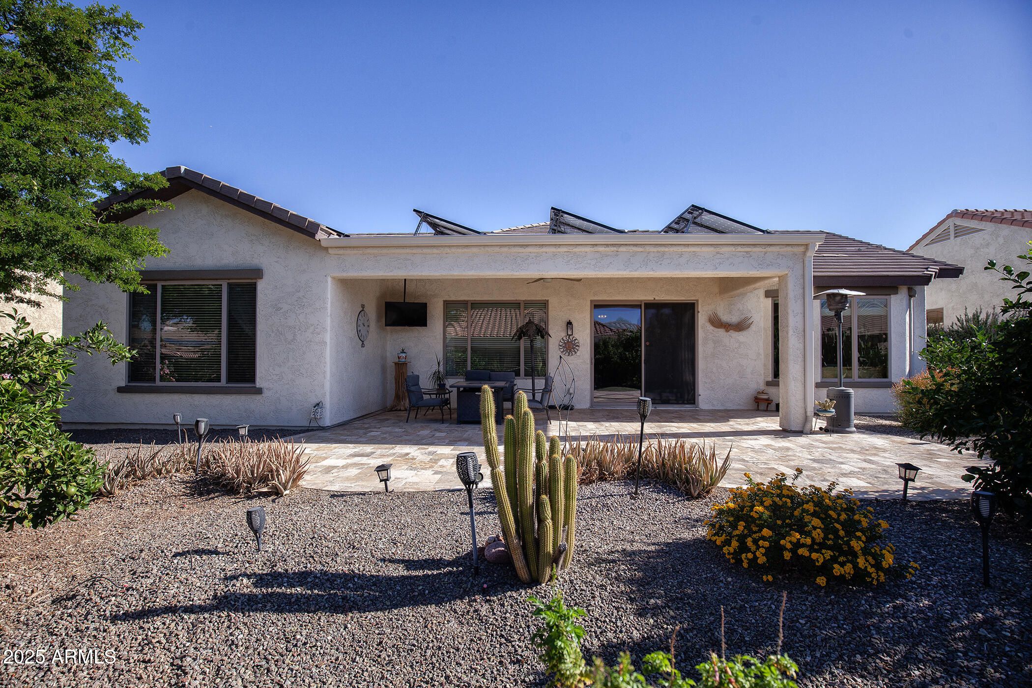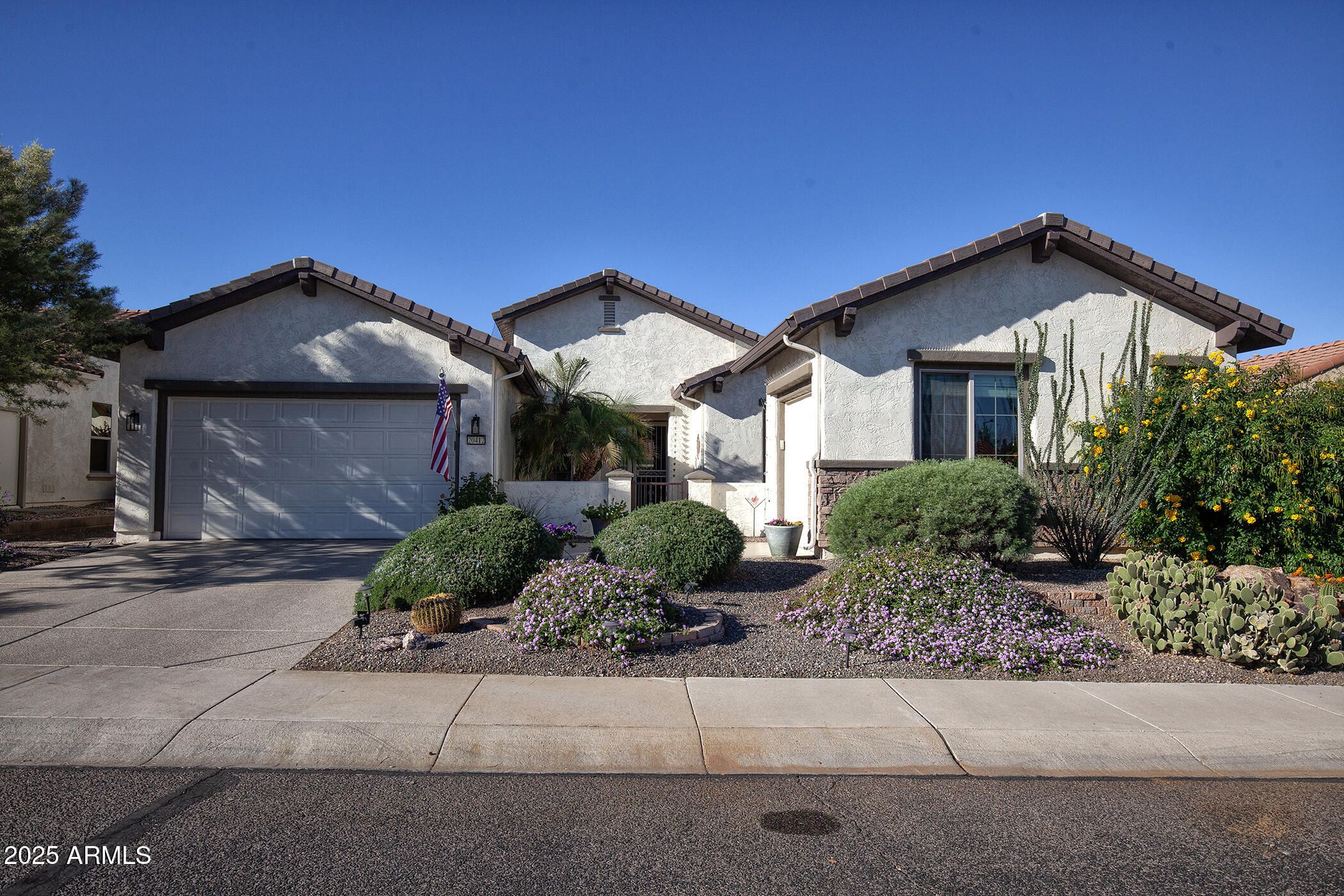 A BEAUTIFUL JUBILEE home w/ 3rd Car Garage & Backyard Oasis Awaits your Enjoyment! Great Location - Close to the Sage & Senita Centers, Indigo Grille & Copper Canyon Golf Pro-Shop. Enter through the Travertine Private Walled Front Courtyard. This Home has 10 Ft Ceilings, Tiled Floors, Den w/ Laminate Floors & Carpeted Bedrooms and Custom Wood Blinds. Low Electric Bills w/ 21 OWNED SOLAR Panels. Unwind in the Sunny Great Room w/ Surround Sound Speakers. Gourmet Kitchen has Staggered Cabinets, Granite Counters & Island, Tile Back Splash, Under Cabinet Lighting & SS Kitchen Appliances. Newer 2024 HVAC & 2018 Hot Water Heater w/ Recirculation Pump. Retire in the Owner's Suite w/ Shower, Garden Tub, Heat Lamp & Large Walk-in Closet. Large Laundry Rm w/Sink, 2021 Washer & Dryer and Refrigerator , Main 2 Car Garage Floor & Driveway are Epoxy Coated. Detached Garage makes for a Great Hobby Room. Relax in Your Private Back Yard Oasis w/ Covered Patio, Extended Travertine Back Patio, Sun Shades, Mature Landscaping w/ 2 Valencia Orange Trees & PVC Irrigation. The Home's Exterior was Painted in 2023. The Festival Ranch Special Assessment Bond Balance has been Paid Off. Don't Wait to See this Exceptional Home & Start Enjoying the Incredible Sun City Festival Lifestyle.