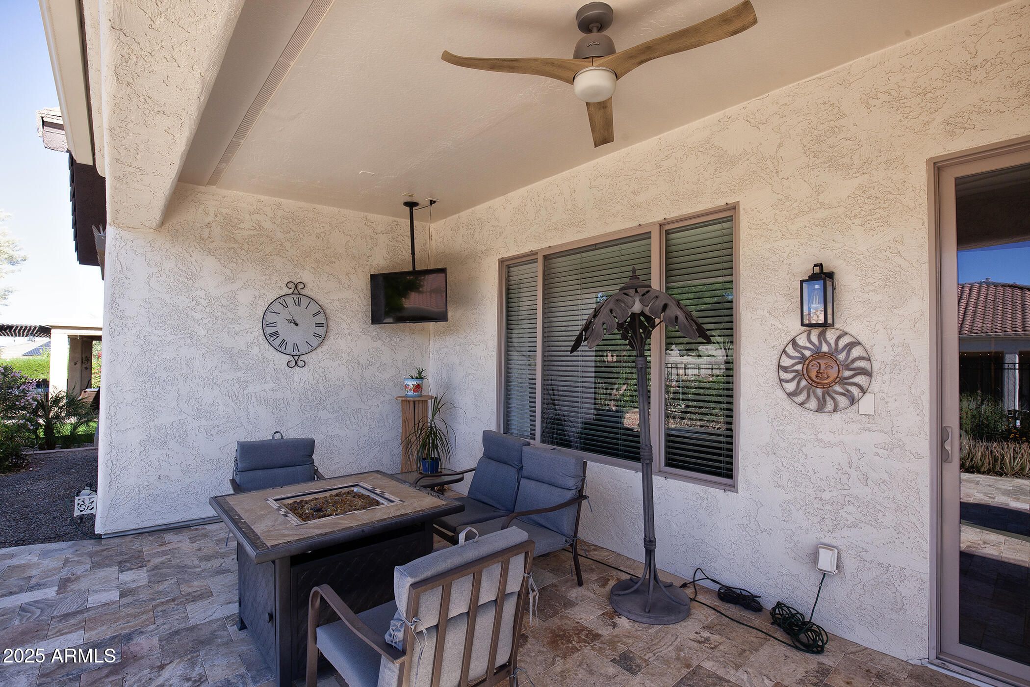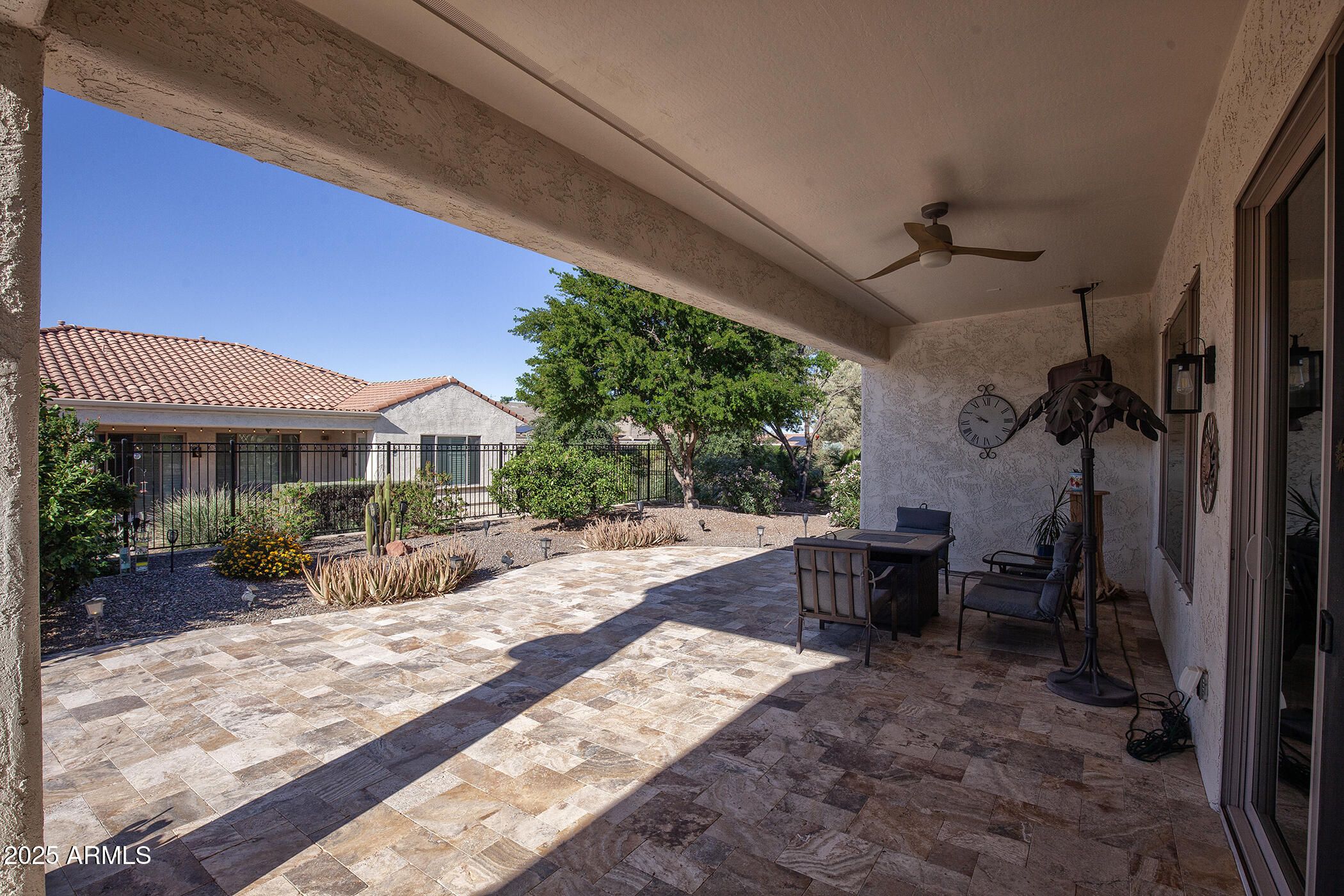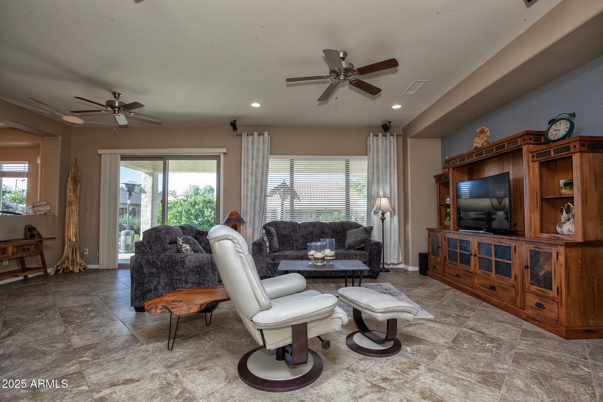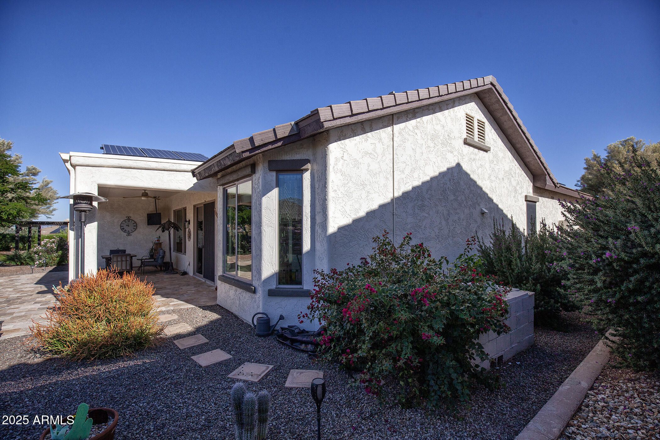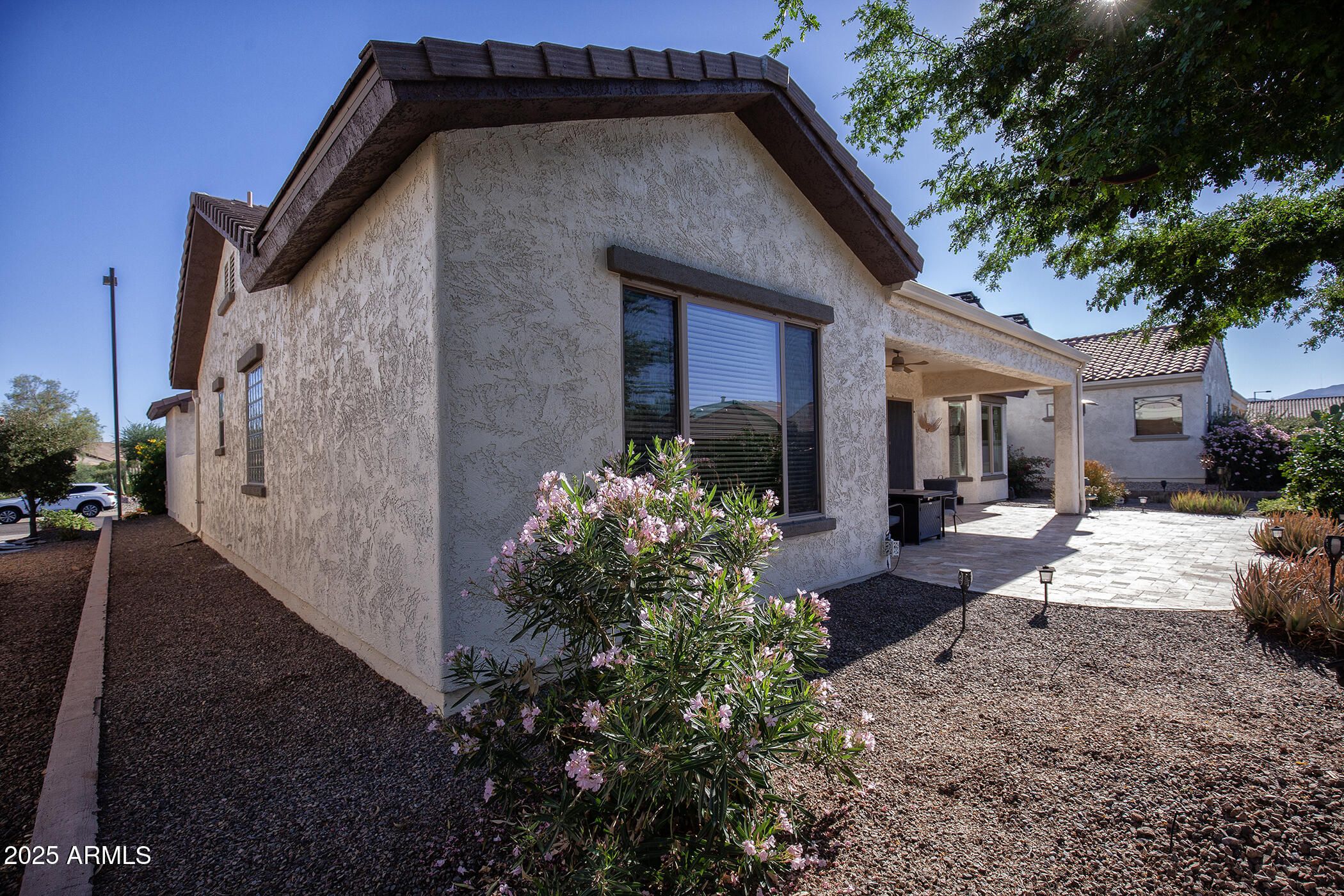 A BEAUTIFUL JUBILEE home w/ 3rd Car Garage & Backyard Oasis Awaits your Enjoyment! Great Location - Close to the Sage & Senita Centers, Indigo Grille & Copper Canyon Golf Pro-Shop. Enter through the Travertine Private Walled Front Courtyard. This Home has 10 Ft Ceilings, Tiled Floors, Den w/ Laminate Floors & Carpeted Bedrooms and Custom Wood Blinds. Low Electric Bills w/ 21 OWNED SOLAR Panels. Unwind in the Sunny Great Room w/ Surround Sound Speakers. Gourmet Kitchen has Staggered Cabinets, Granite Counters & Island, Tile Back Splash, Under Cabinet Lighting & SS Kitchen Appliances. Newer 2024 HVAC & 2018 Hot Water Heater w/ Recirculation Pump. Retire in the Owner's Suite w/ Shower, Garden Tub, Heat Lamp & Large Walk-in Closet. Large Laundry Rm w/Sink, 2021 Washer & Dryer and Refrigerator , Main 2 Car Garage Floor & Driveway are Epoxy Coated. Detached Garage makes for a Great Hobby Room. Relax in Your Private Back Yard Oasis w/ Covered Patio, Extended Travertine Back Patio, Sun Shades, Mature Landscaping w/ 2 Valencia Orange Trees & PVC Irrigation. The Home's Exterior was Painted in 2023. The Festival Ranch Special Assessment Bond Balance has been Paid Off. Don't Wait to See this Exceptional Home & Start Enjoying the Incredible Sun City Festival Lifestyle.
