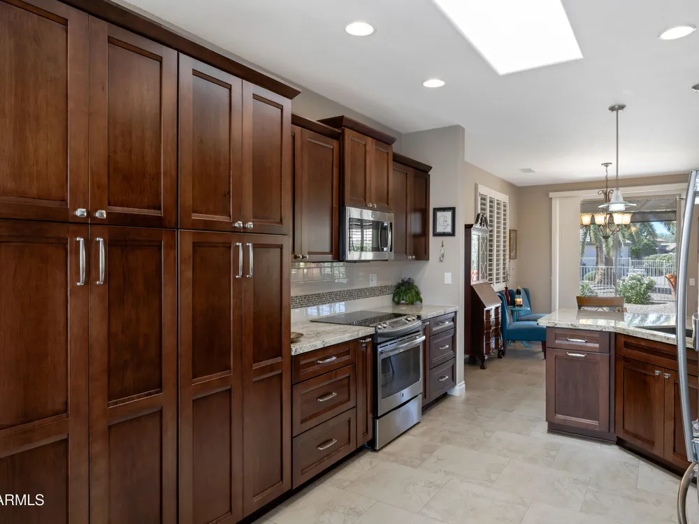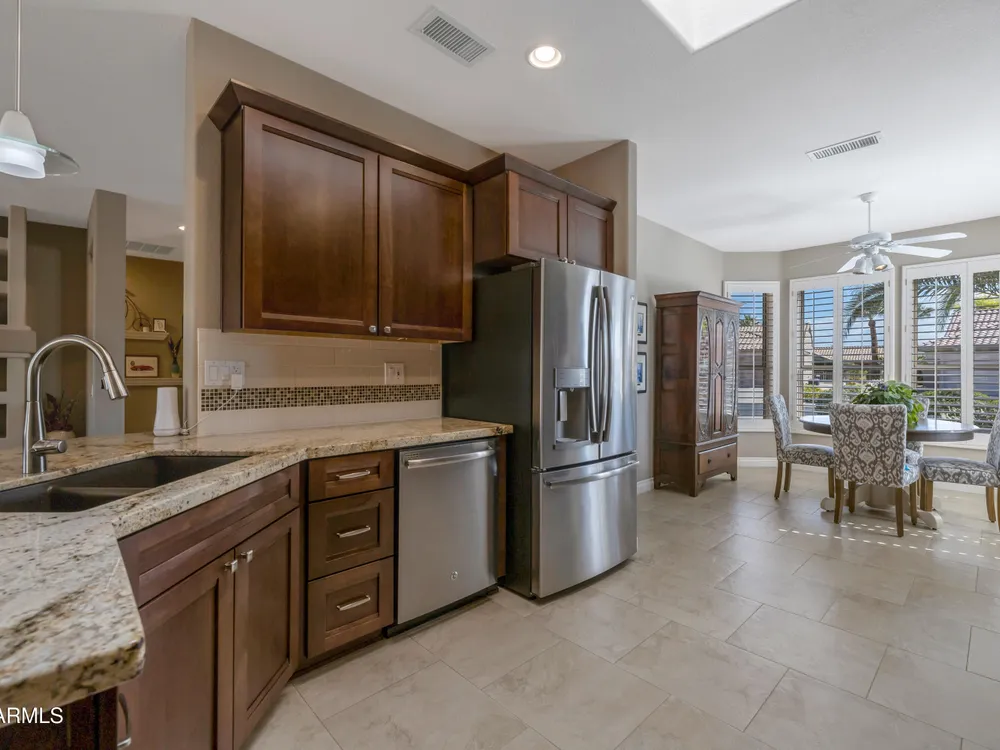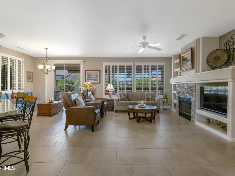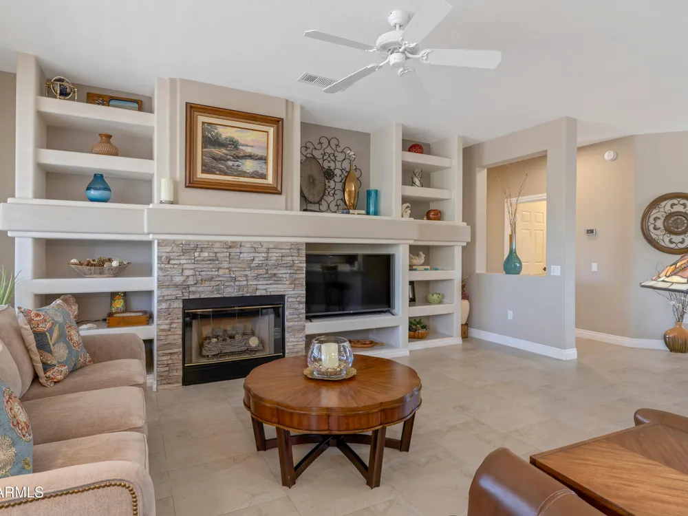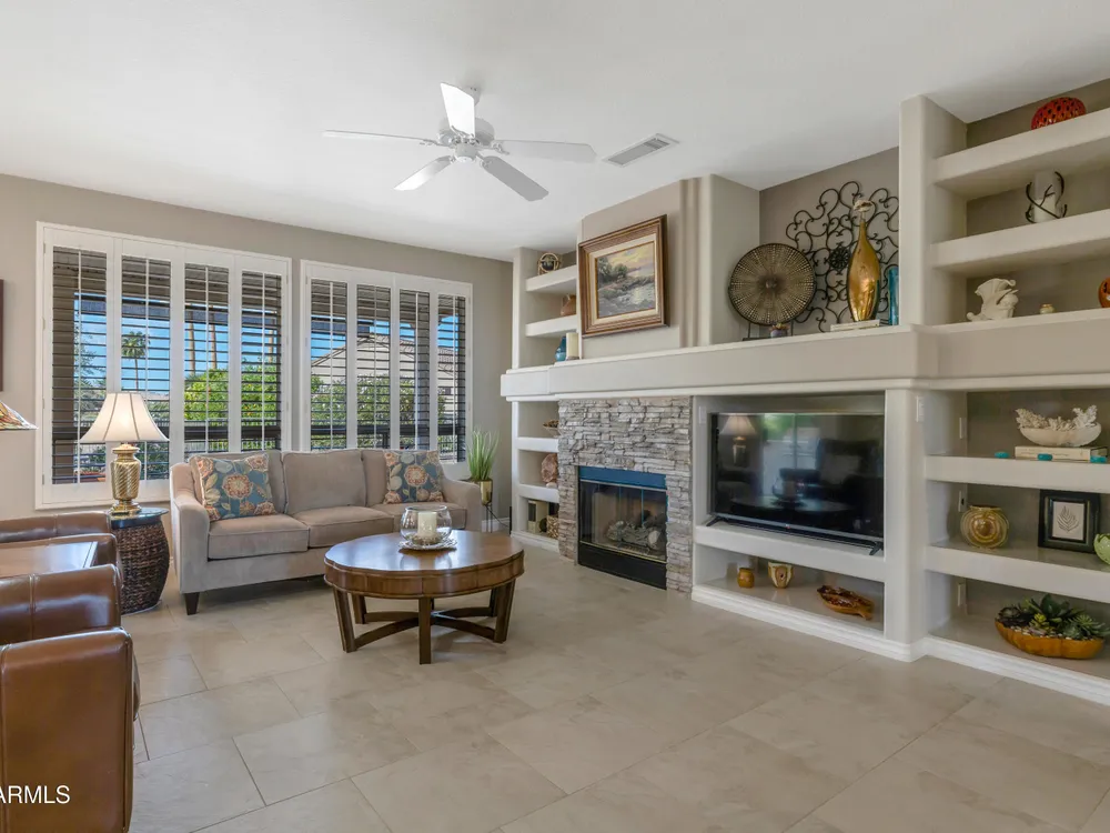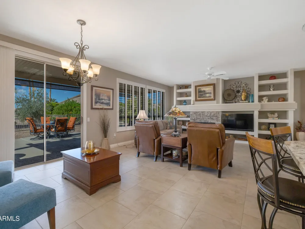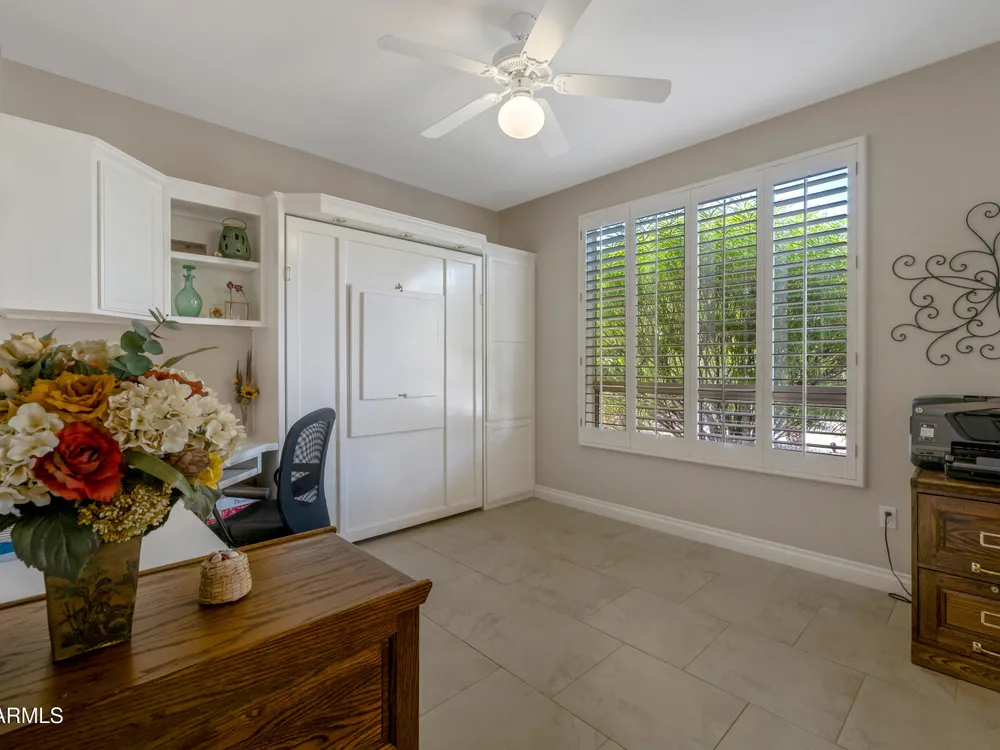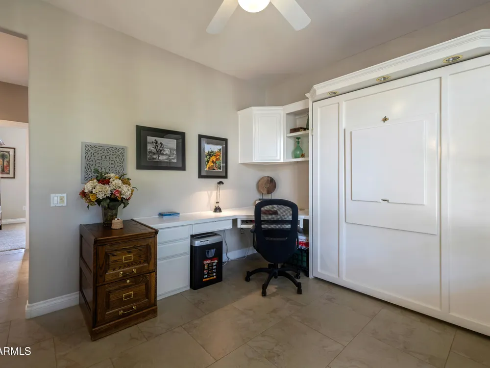 Sought after Palo Verde plan, that is spacious and bright with open great room loaded with updates!*Newer roof*Fresh interior paint* Water heater & AC replaced in 2022*Gorgeous updated kitchen cabinets with pull out drawers, double pantry, updated granite and newer appliances!* 20x20 tiles throughout most of the home* Updated carpet in bedrooms*Split bedrooms*Murphy style wall bed and desk in den are ideal for guests* Timeless media wall includes gas fireplace 7 shelves for photos & TV* Bay windows in breakfast nook and primary bedroom* Laundry with upper cabinets* Extended length garage* Best of all... extended patio, partially covered on open lot with views and privacy* There's more...Plantation shutters * Granite Counters * Neutral Tile floors*Trane furnace - A/C*All appliances stay!