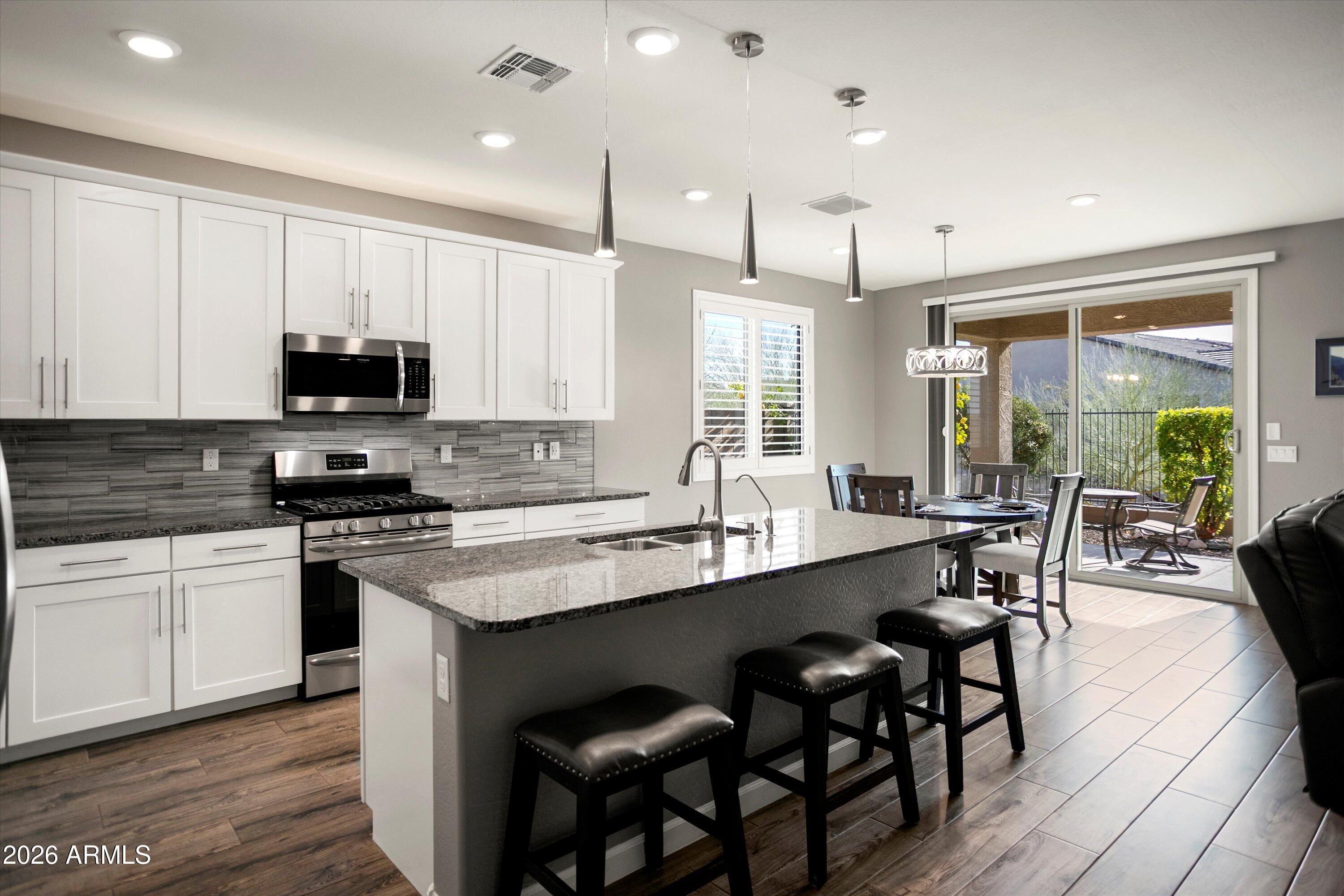 OWNED SOLAR, plantation shutters, landscape lighting, water softener,ceiling fans, added pavers, overhead garage storage racks, EV charging outlet, cabinets, countertops, flooring, baseboards, are included in the more than $85,000 in UPDATES/OPTIONS/UPGRADES! This desirable Kennedy floorplan at Victory at Verrado Inspiration has 2 bedrooms, den, 2 full baths, large great room, & modern kitchen with dining area. The owner's suite is spacious and bright, owner's bath boasts a large tiled walk-in shower, double vanities/sinks, and a walk-in closet that opens to the laundry room, which also opens to the hallway. Backing to a wash, the backyard is professionally landscaped with some mountain views, and includes a covered patio.