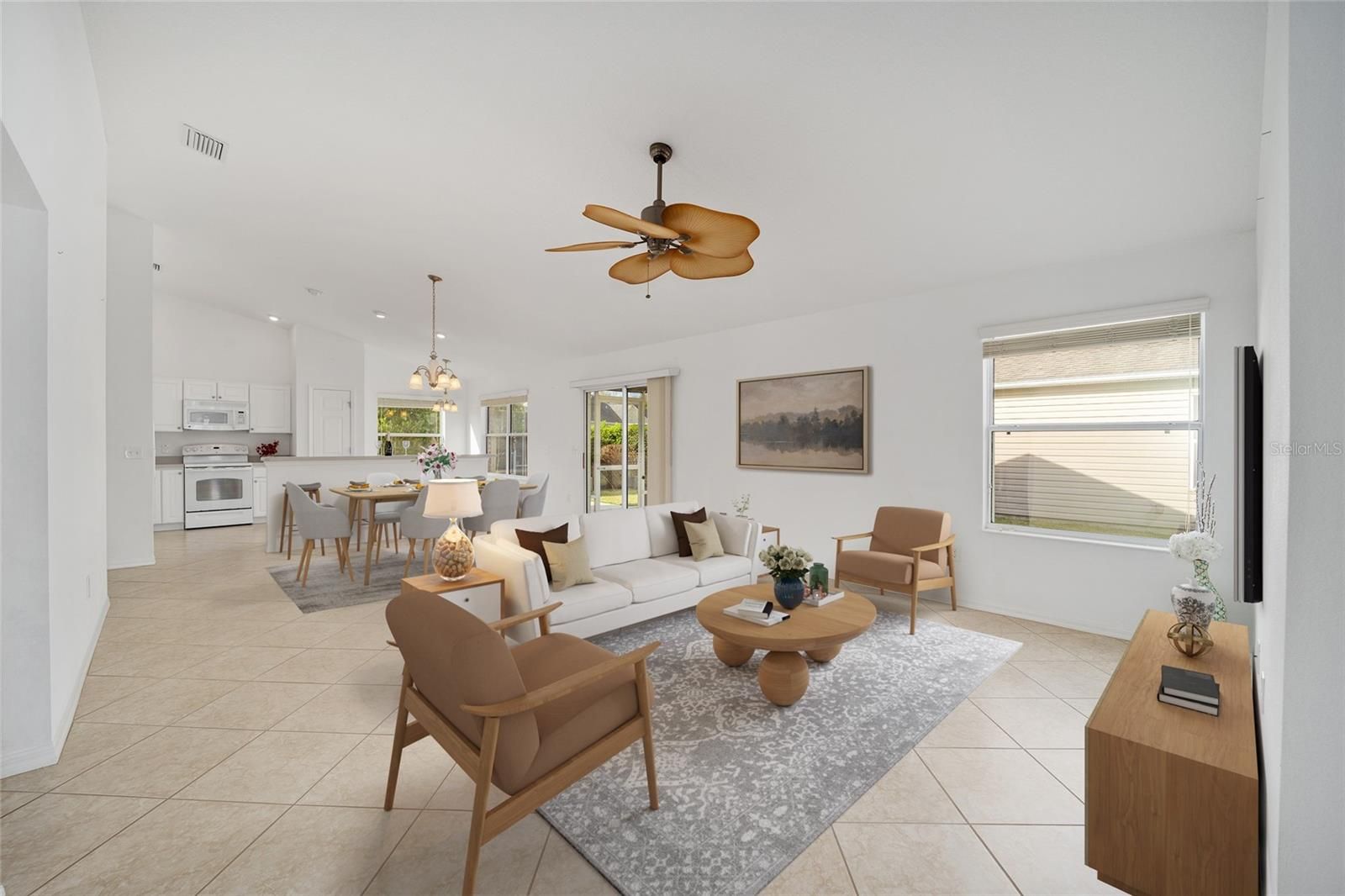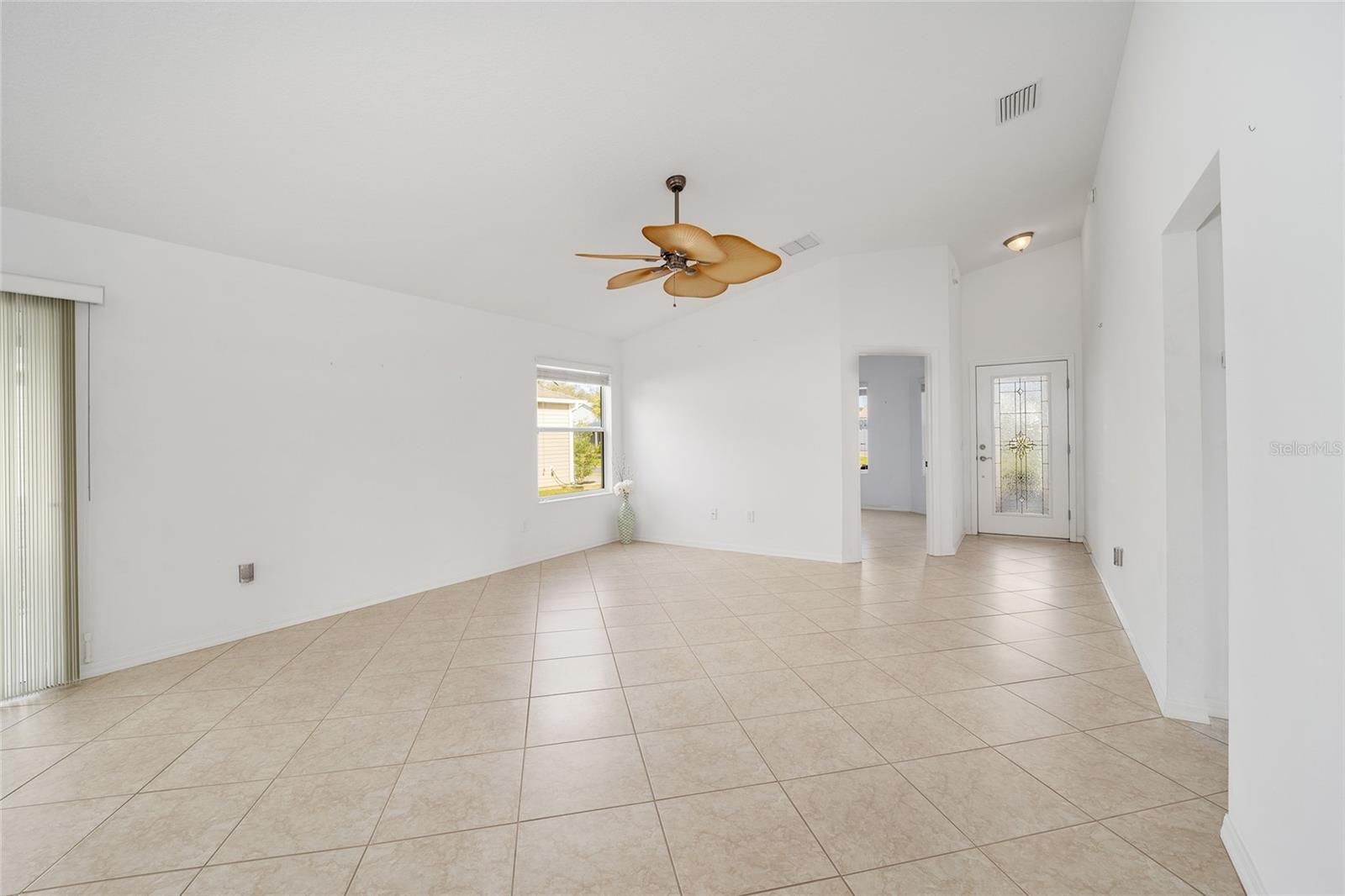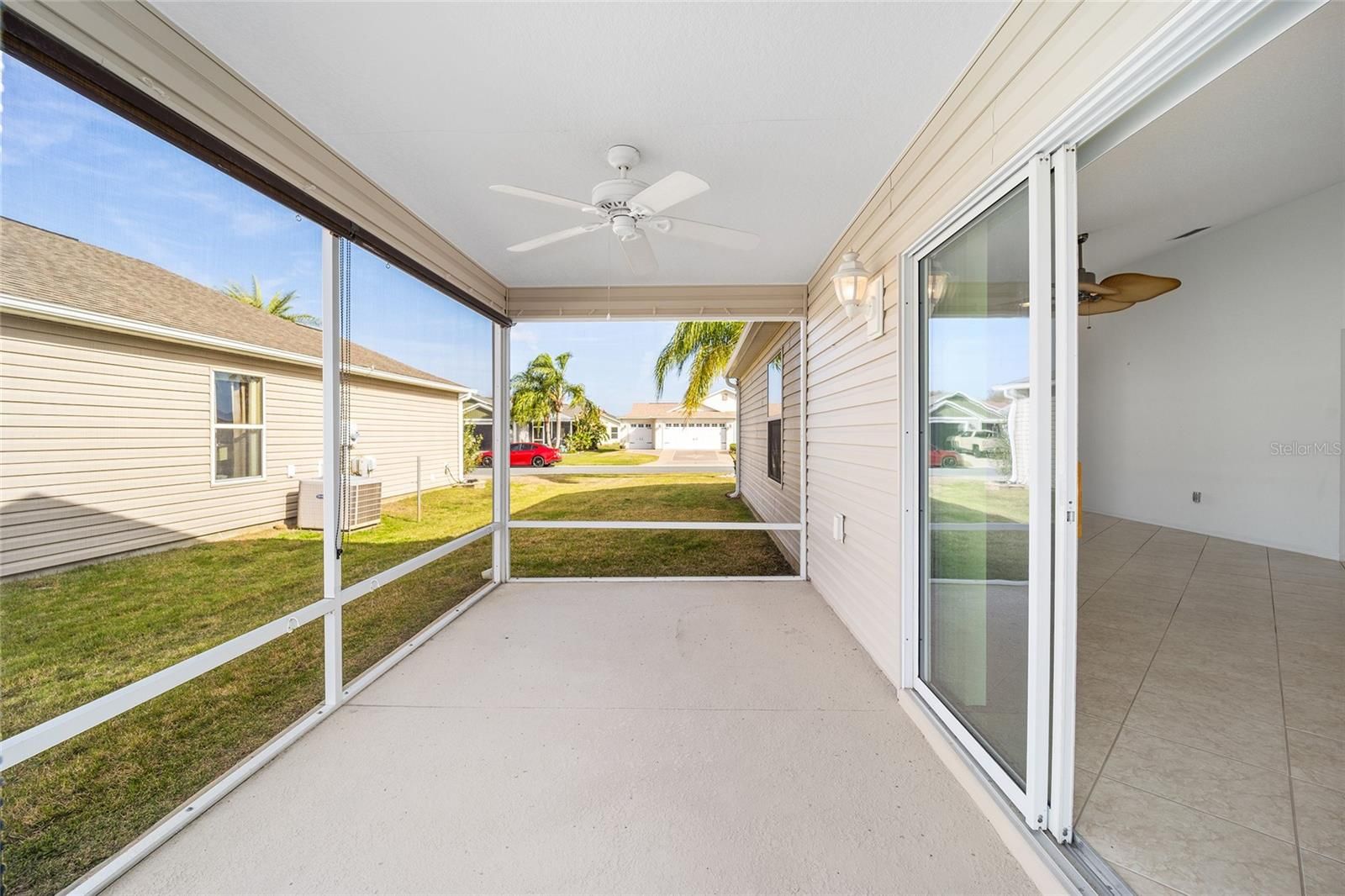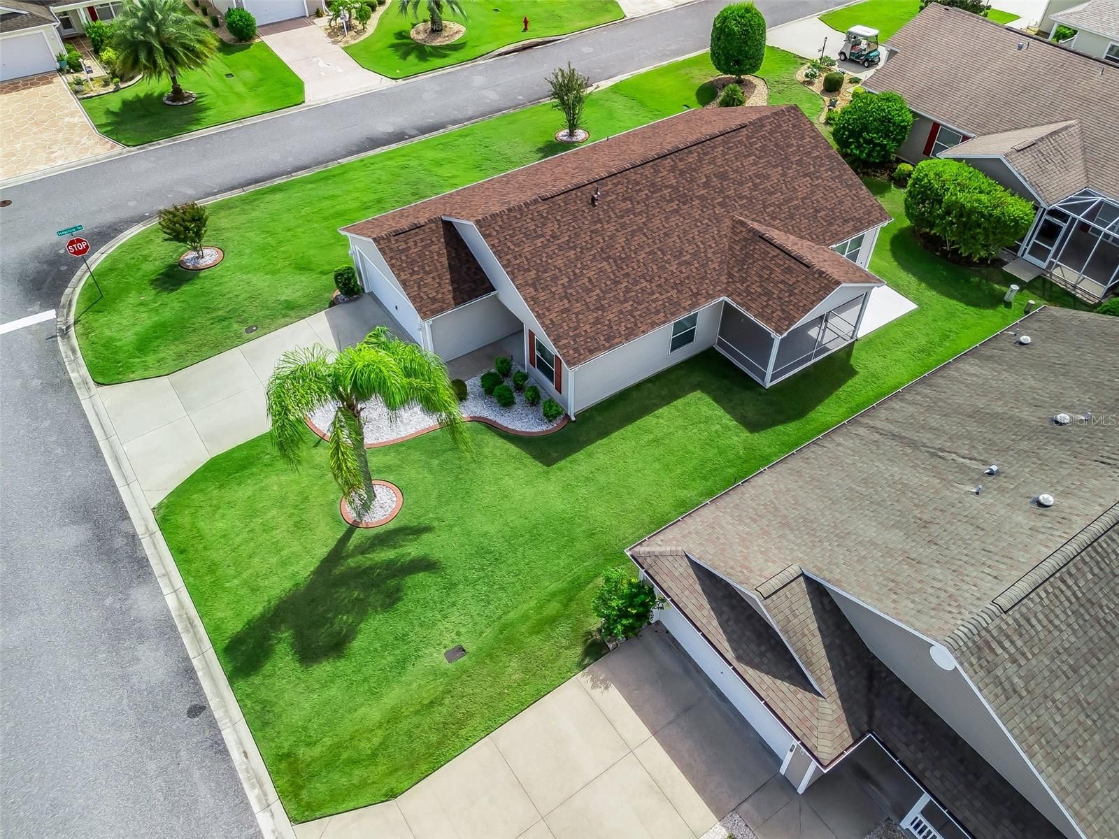 One or more photo(s) has been virtually staged. BOND PAID! BRAND NEW ROOF! BRAND NEW HOT WATER HEATER! LOW SUMTER TAXES! HOME WARRANTY INCLUDED! Welcome to this beautifully well-maintained AT-EASE Cottage model, offering comfort, updates, and a prime location in the heart of The Villages (between CR466 and CR466A). This bright and spacious home features vaulted ceilings throughout (no popcorn ceilings) and a freshly painted interior accent walls. Tile flooring flows seamlessly through the home, while the eat-in kitchen offers abundant cabinet space with pull-outs, a pantry closet, and sliding doors that open to the screened lanai. The primary suite boasts a large walk-in closet and an en suite bath with dual sinks and a custom Jetta Stone walk-in shower. The second bedroom sits conveniently near the guest bath—perfect for visitors. The third bedroom, located at the front of the home, provides flexibility as a guest room or home office. All bedrooms have closets. Step outside to the roofed, screened lanai with privacy shades and a concrete patio (ideal for an added birdcage). The corner lot adds privacy and space as well as beauty. The two-car garage and indoor laundry complete the thoughtful design. Close to shopping, rec centers, golf, pools, country clubs, restaurants - and more! Schedule your showing today!