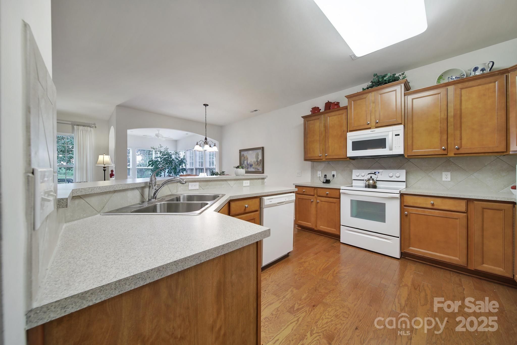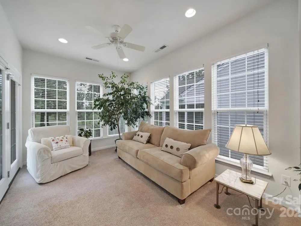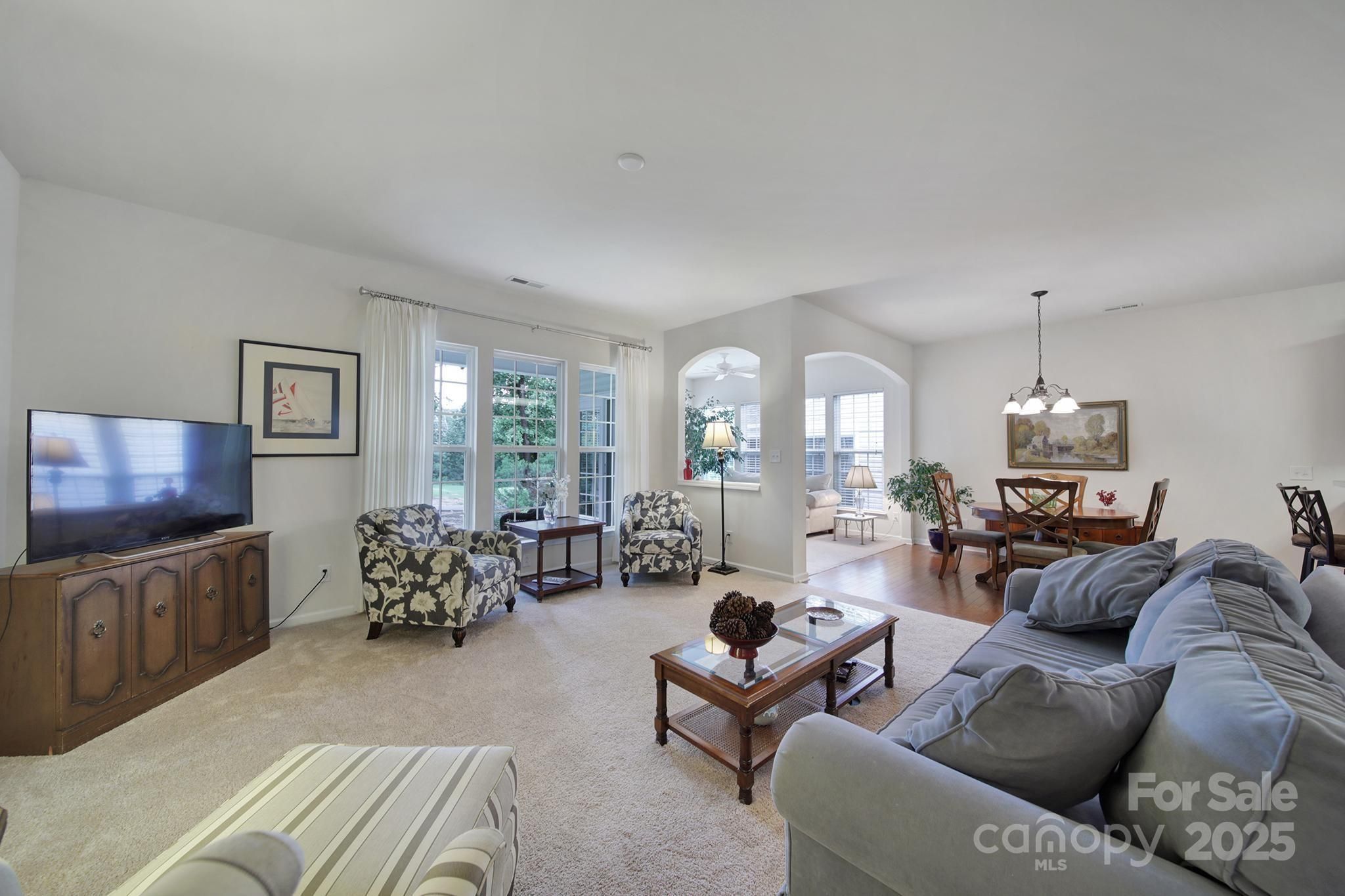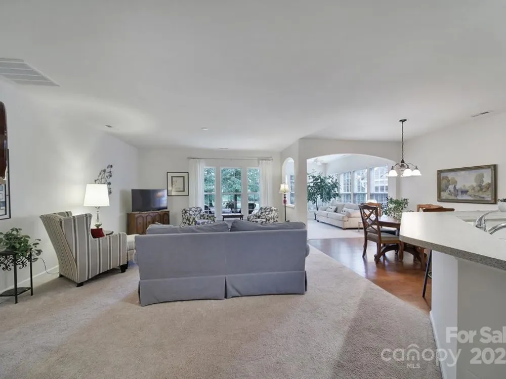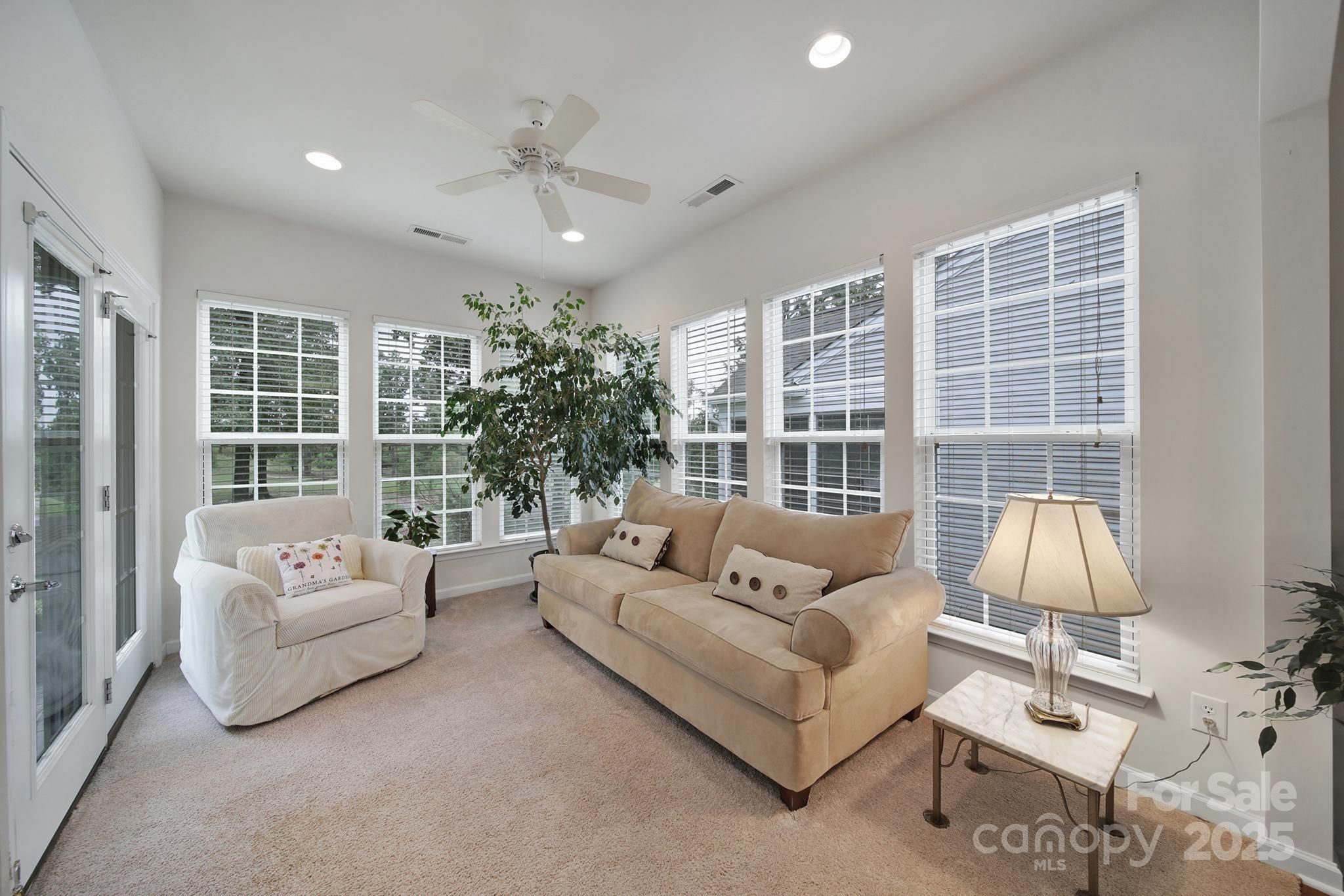 Nestled along the 8th fairway, this well-maintained Copper Ridge home w/2 bedrooms, 2 baths, and an office/den offers scenic golf course views from your private covered porch and stamped concrete patio—ideal for relaxing or entertaining. Inside, a bright guest bedroom sits at the front of the home, with easy access to a hall bath featuring tile floors & a solar tube for natural light. A decorative glass front door welcomes you into a spacious foyer with engineered wood flooring that flows through the kitchen & dining room. The kitchen features classic white appliances, easy to maintain countertops, & convenient bar seating. Plush carpeting is throughout the living areas, bedrooms, sunroom, and office. The primary suite boasts serene fairway views, an en-suite bath with a garden tub, walk-in shower, dual-sink vanity, and a large walk-in closet. All of this, plus the award-winning amenities of Sun City Carolina Lakes: resort-style pools, walking trails, golf course, clubhouse, & more!