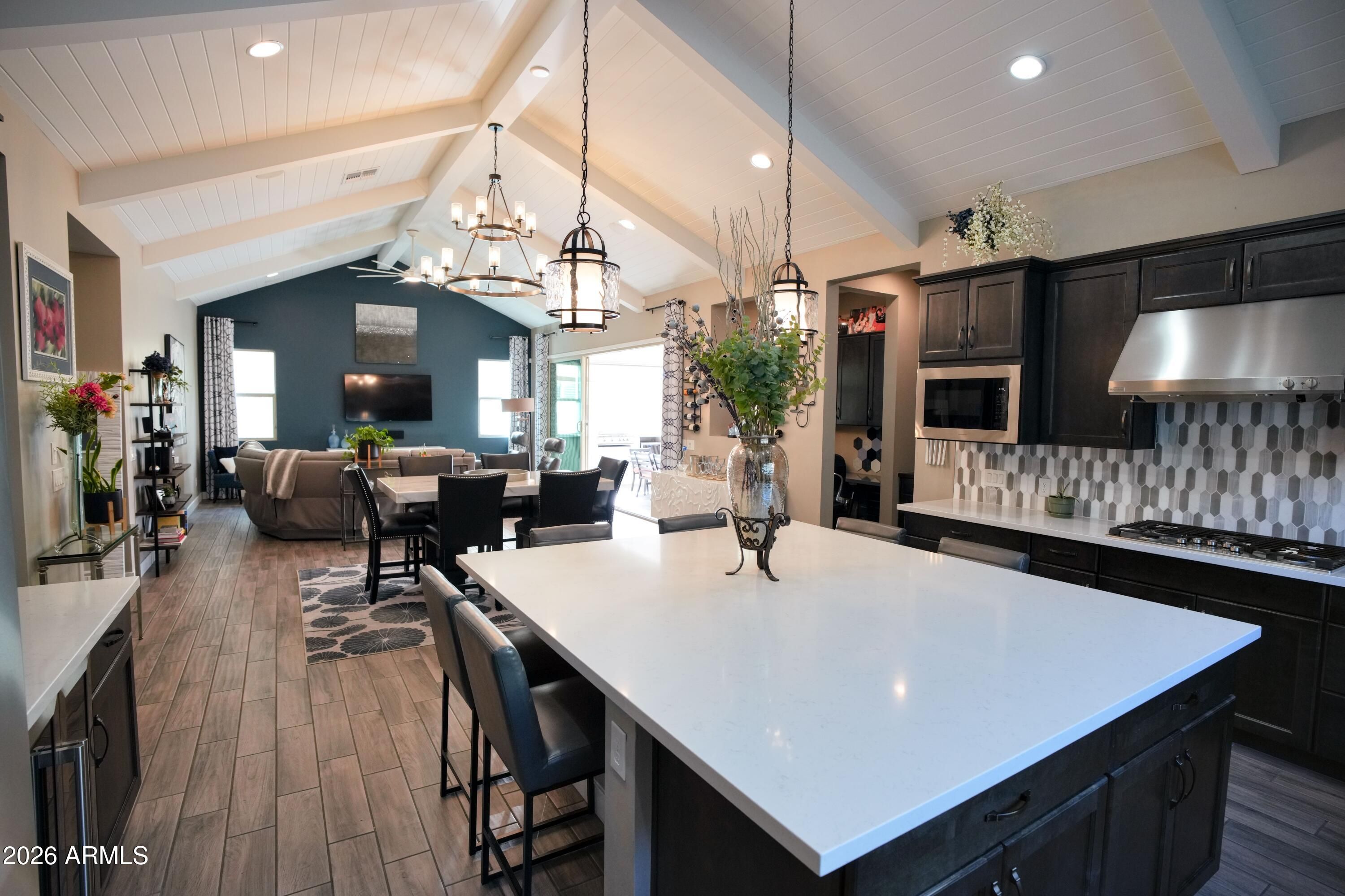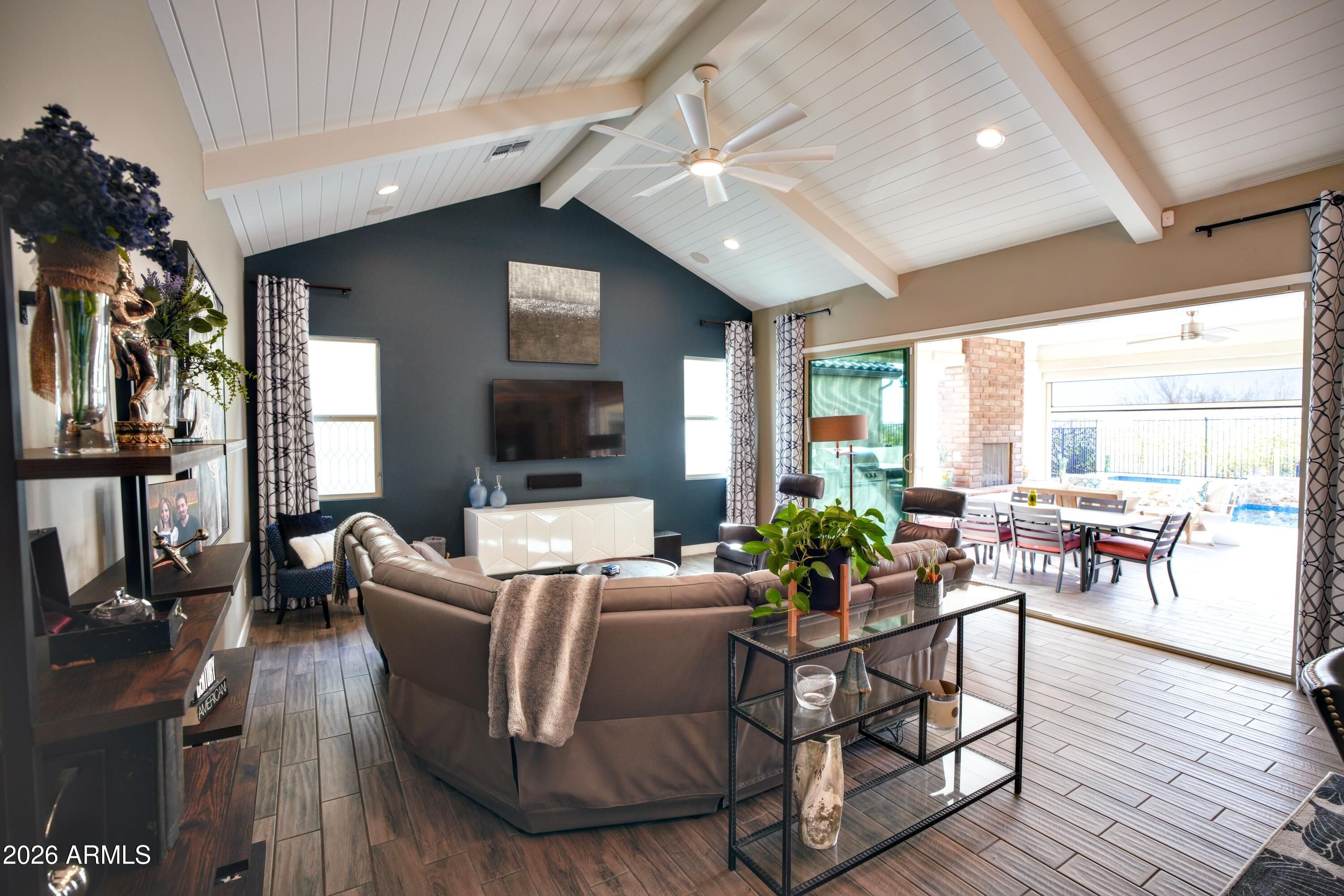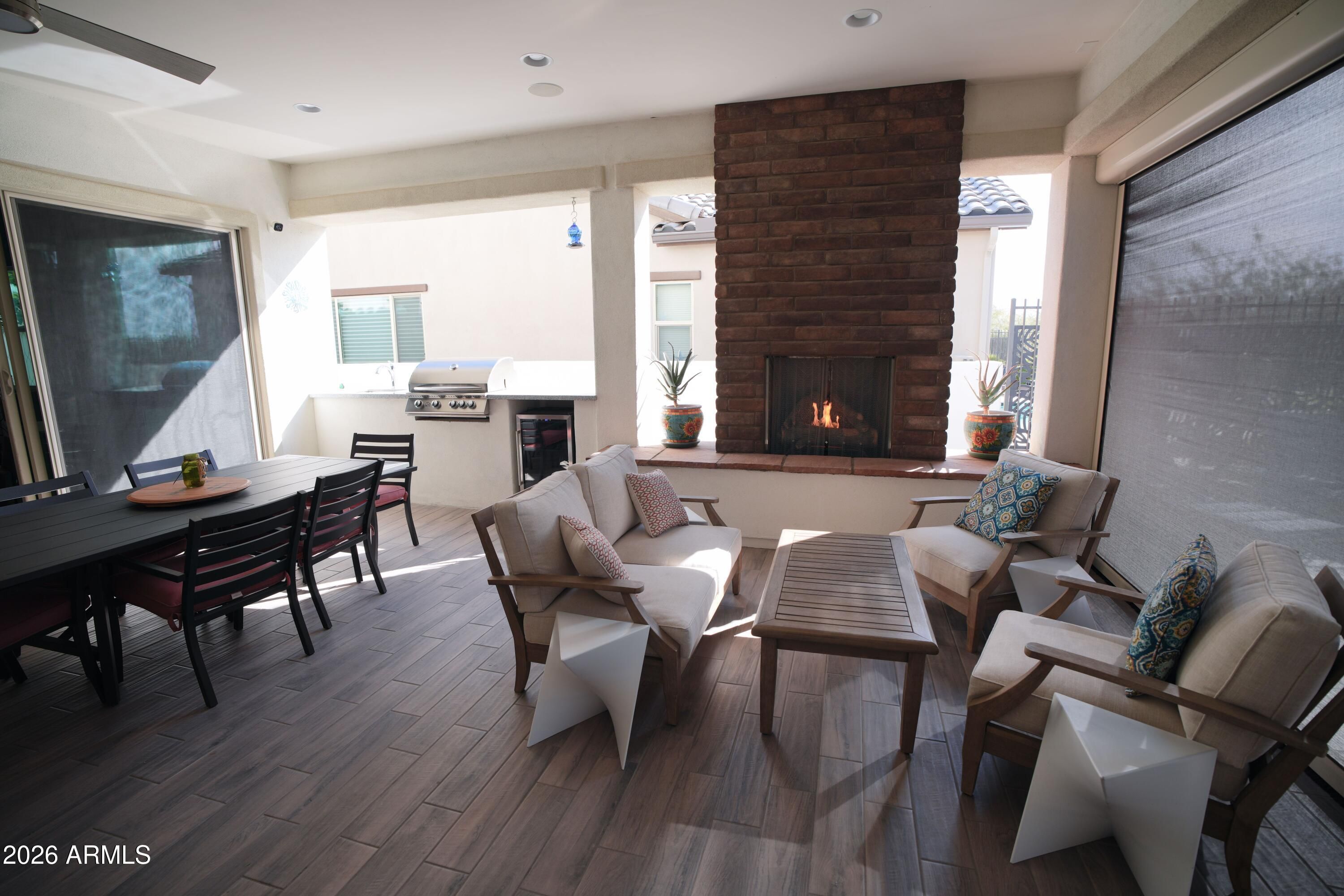This stunning home has everything! Resort-style pool & spa plus sleek fire pit wrapped in travertine with peaceful mountain views, backing to open space. The expansive tile patio is an entertainer's dream with an outdoor fireplace, built-in BBQ, sink, mini-fridge & electric sun shade. The great room features soaring vaulted ceilings with surround sound, flowing seamlessly into a chef's kitchen with upgraded appliances including double convection ovens, food warmer, gigantic island & dual temp wine fridge. The split primary suite is a private retreat with dual vanities & spacious walk-in tiled shower. Beautiful custom Murphy bed in the versatile 3rd bedroom, OWNED SOLAR & golf cart garage complete this exceptional residence in the vibrant active adult golf community of Victory at Verrado.