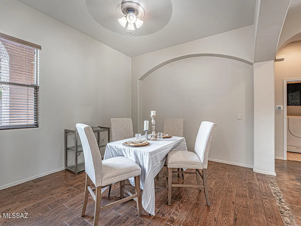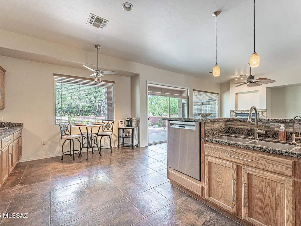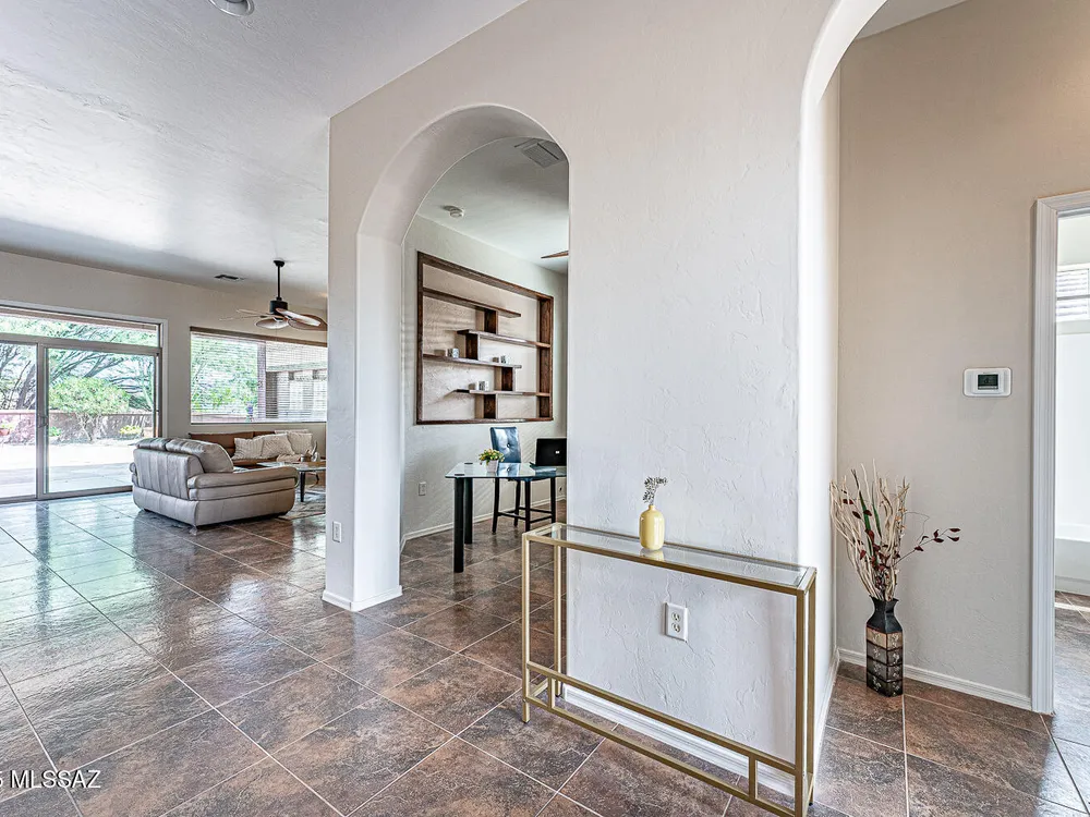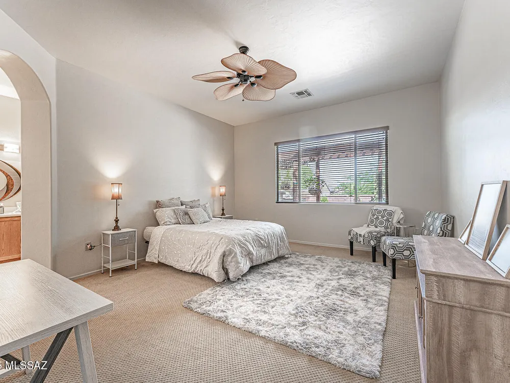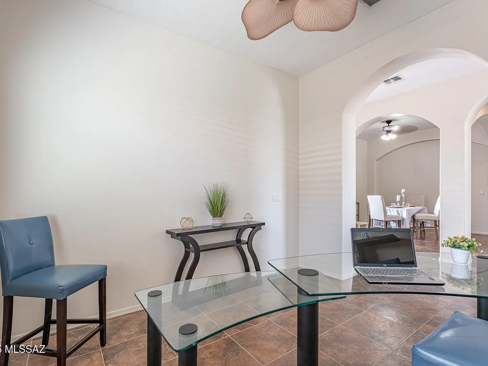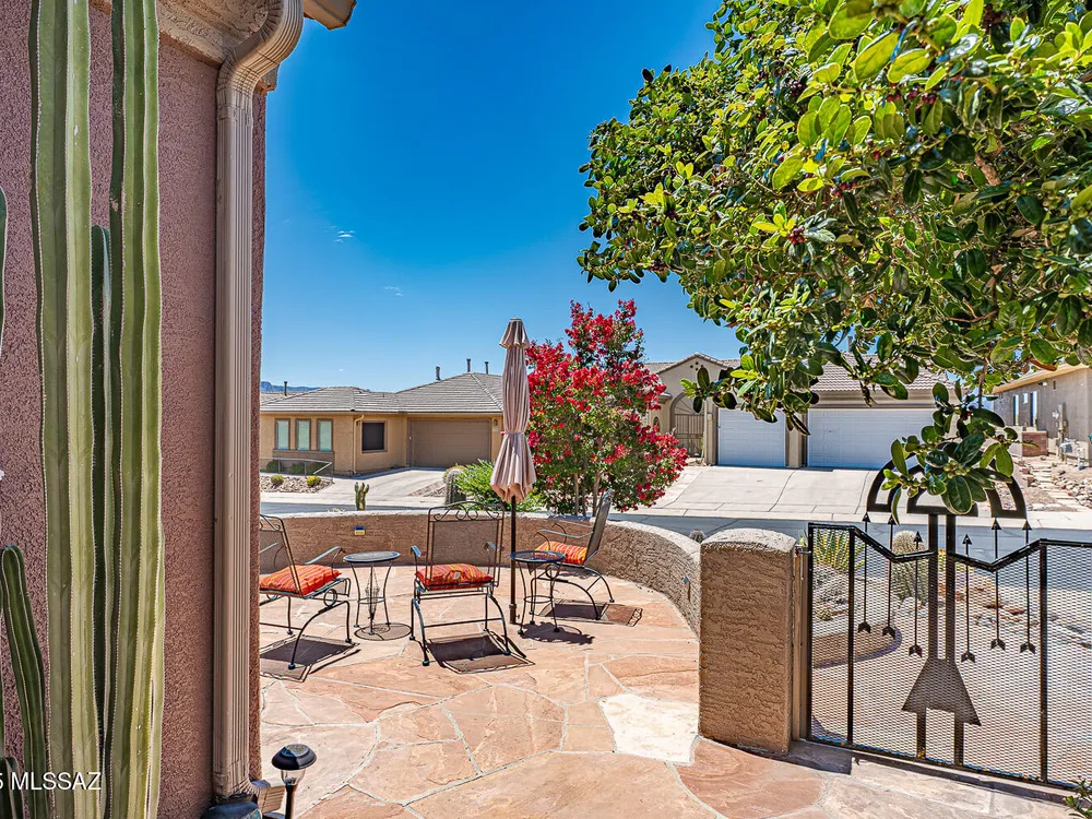 Step into charm! Enjoy stunning Elephant Head views from your private courtyard, then relax in a lush backyard with mature landscaping and a sunset-ready patio. Inside, tile flows through bright, freshly painted open spaces featuring a formal dining room and oversized office. The kitchen offers granite counters, a raised dishwasher, roll-out shelves, and a butler's pantry. The split floorplan includes a front guest room with wall bed and nearby bath, while the private primary suite boasts a modern walk in shower and soaking tub along with a custom closet. A 4ft-extended 3-car garage adds additional space and versatility. Every detail of this home has been touched with a contemporary accent and unique updates. Gated, peaceful, and near GVR--your next magical chapter awaits