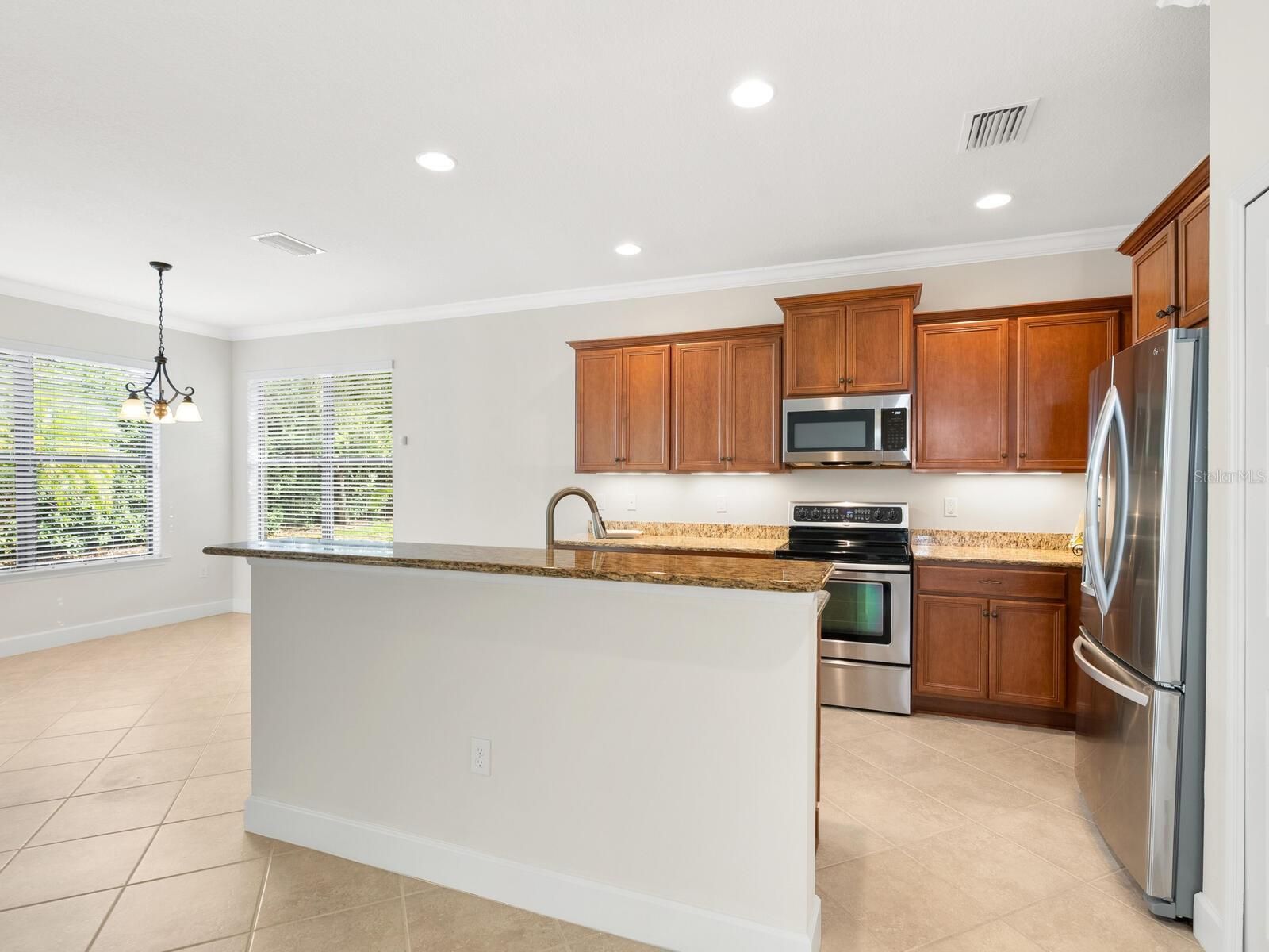 - Ceiling Fan(s), Crown Molding, Kitchen/Family Room Combo, Open Floorplan, Solid-Wood Cabinets, Split Bedrooms, Stone Counters, Walk-In Closet(s), Window Treatments