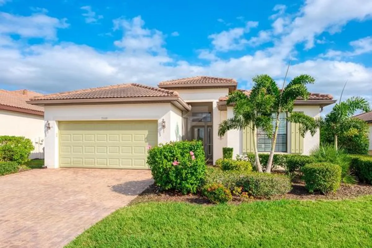 This beautifully maintained two-bedroom-plus-den Florence home is nestled within the popular, gated, resort-style community of Venetian Falls. Thoughtful design details abound, including large diagonal tile flooring, crown molding, and upgraded baseboards throughout. Move-in ready, the home offers a freshly painted interior, new carpeting, refreshed ceramic tile grout, window cleaning, replaced insulation, and professionally cleaned air ducts. The kitchen is well appointed with granite countertops, stainless steel appliances, a breakfast bar, and a bright dinette surrounded by windows. An open, split-bedroom floor plan ensures privacy for both homeowners and guests, while French doors lead to a versatile den or home office. Step outside to the extended paver lanai and enjoy tranquil views of the lush landscaping. A screened breezeway leads to a striking, hurricane-resistant glass front door. The widened paver driveway adds both curb appeal and functionality. Storm shutters are also included. The HOA fee covers maintenance-free lawn care, cable TV, and internet. Residents enjoy an exceptional array of amenities, including a heated lap pool, spa, resistance walking pool, state-of-the-art fitness center, billiards room, internet café, arts and crafts studio, bocce ball courts, putting green, and an elegant clubhouse offering a full calendar of activities with director. This community does not have a CDD fee. Ideally located near Gulf beaches, shopping, dining, and historic Main Street Venice, this home offers the perfect opportunity to enjoy the best of Florida living.