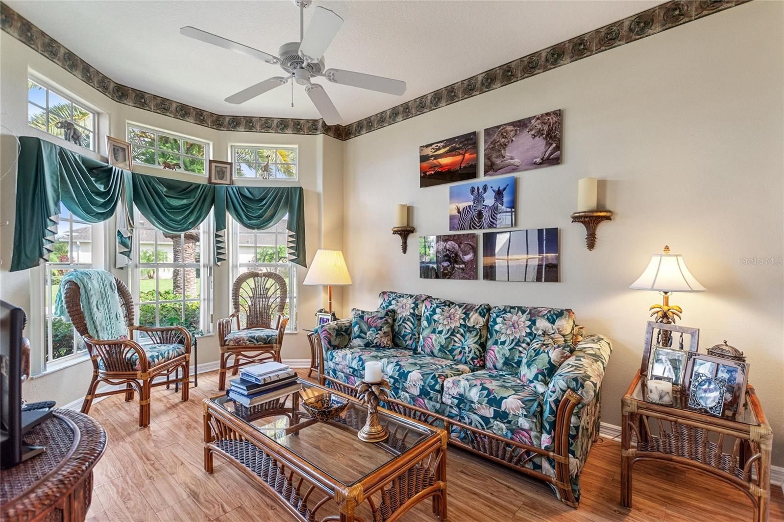 One or more photo(s) has been virtually staged. Mostly Furnished Water-Front RidgeBrooke 3/2/Family Room/Den model with a 481 SF west-facing Florida Room Overlooking the Pond between High Vista and Del Webb 55+ communities, located 0.2 miles from High Vista's private clubhouse and amenity center. List Price is below 2024 independent appraisal which also cited an effective age of this property as 8 years. Expanded brick paver driveway and walkway to the 8 FT leaded-glass double front doors with adjacent water fountain adorned by cherubs. 12 FT ceiling in central Great Room with 2 skylights and full-view patio doors to Florida Room with skylight and 3 walls of sun-shaded windows. Widened galley kitchen has solid wood cabinets, stainless-steel appliances, custom tile backsplash, solid-surface breakfast bar and countertops with seamless sink and a closet pantry. Adjacent family room with tray ceiling and dining area has western water view. 8 FT double doors to primary en suite bedroom with dual closets, tray ceiling and updated full bathroom with shower, linen closet and separate steam room. Split bedroom design offers privacy to guests with a full bath and linen closet between 2 guest bedrooms. Bay window elevation in front Den. Custom crown molding in many rooms. 2024 Water Heater. 2014 Roof. 2020 & 2013 HVAC units, both serviced annually. 4-Point Inspection dated 9/24/25 is available for view upon request. ALL COMPLETE WRITTEN OFFERS WILL BE PRESENTED TO SELLER ON 11/5/2025. Sold As-Is. Ridgewood Lakes is a golf cart friendly community. $230 monthly High Vista HOA fee includes Spectrum internet and basic cable TV with 2 cable boxes, lawn mowing and exclusive access to resident-owned 12,000 SF private High Vista clubhouse and amenities. $425 semi-annual Ridgewood Lakes HOA fee provides 24x7 staffed security gate and master association-owned private road maintenance. Adjacent to 18-hole White Heron Golf Club with The Nest restaurant, privately owned and open to the public. High Vista is a 55+ community with outdoor heated pool and spa, fitness center, library, pub & many organized activities. Pickle ball, tennis, bocce and shuffleboard courts. Miles of biking and walking trails within Ridgewood Lakes gated community. Shopping, Disney, Universal, Orlando & Central FL entertainment nearby, easy access to I-4, medical facilities, airports & Sunrail Station. Advent Health hospital is 3 miles away.