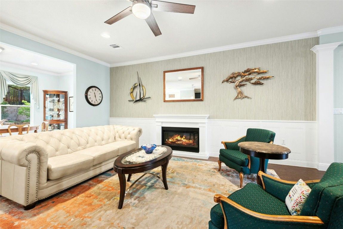 Fabulous Napa Valley Floor Plan – Backing to Greenbelt! This beautifully maintained 3-bedroom, 2-bath home offers an inviting open floor plan, perfect for entertaining. The stunning front door welcomes you into a bright, elegant space.The spacious living area features designer colors, wood floors, two tray ceilings, and an electric fireplace for cozy evenings. The kitchen is a chef’s dream with stainless steel appliances, a gas cooktop, and a seamless flow into the dining and living areas. The hearth room has been thoughtfully converted into a stylish home office with French doors, ideal for today’s lifestyle. Enjoy lush landscaping in both front and back, with the backyard backing to a serene greenbelt for privacy and relaxation. The oversized 2.5-car garage includes a dedicated golf cart bay, plus a staircase leading to a generous walk-up storage area. Don't forget to see the cubby hole perfect for grandkids in the 2nd bedroom. This home has it all — beauty, function, and a prime location.