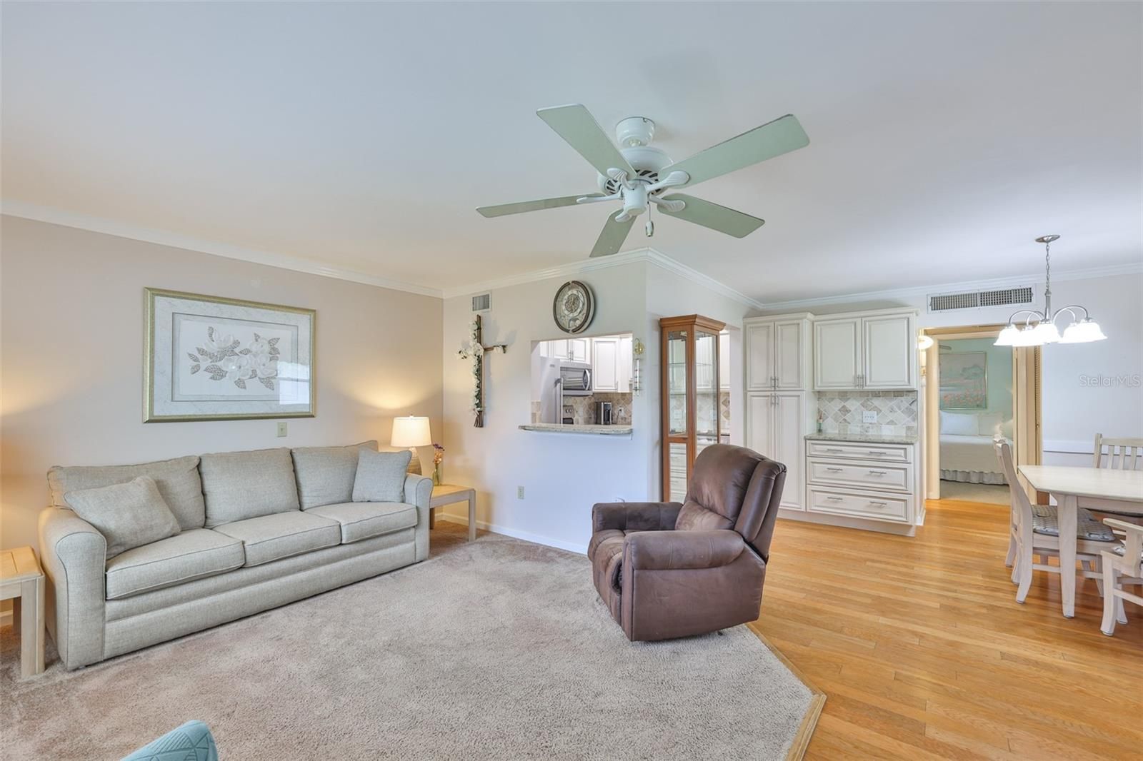 Welcome to the popular 55+ community of Kings Point where you can live the ultimate Florida lifestyle. This warm and inviting 1 bedroom/1.5 bath home is move-in ready! The beautifully updated kitchen features modern cream-colored cabinets, granite counters, stainless steel appliances, and a beautiful backsplash. A large pantry cabinet with extra counter space was added to allow for maximum storage. Crown molding adorns the living room and dining area and no popcorn ceilings. All windows have been replaced (even the enclosed patio windows) and the concrete lanai has been extended allowing for golf cart parking. The lanai has a window unit AC. Washer and Dryer are newer (Feb 2024). An extra 4 x 5 ft storage space is included. The furniture and golf cart are available under a separate contract. Enjoy all the benefits of Kings Point, an active adult gated community where you will never be bored and your social life will be as active as you want it to be. You can travel by golfcart to over 200 clubs, 2 clubhouses with dining options, several indoor/outdoor heated pools, fitness facilities, pickleball courts, tennis, shuffleboard, and much more. Your fees include all the amenities plus water, trash, sewer, cable, internet, exterior maintenance including roof, grounds maintenance, and security guards at the gated entrance. You can enjoy a carefree lifestyle, make friends for life, and be conveniently located close to restaurants, beaches, shopping centers, doctors, hospitals, Tampa and Sarasota airports, Disney, and Sea World. For more information about the community, the amenities, and the KP Warranty, visit their website at www.kpscc.com. Don't miss the opportunity to call this exceptional place your new home!