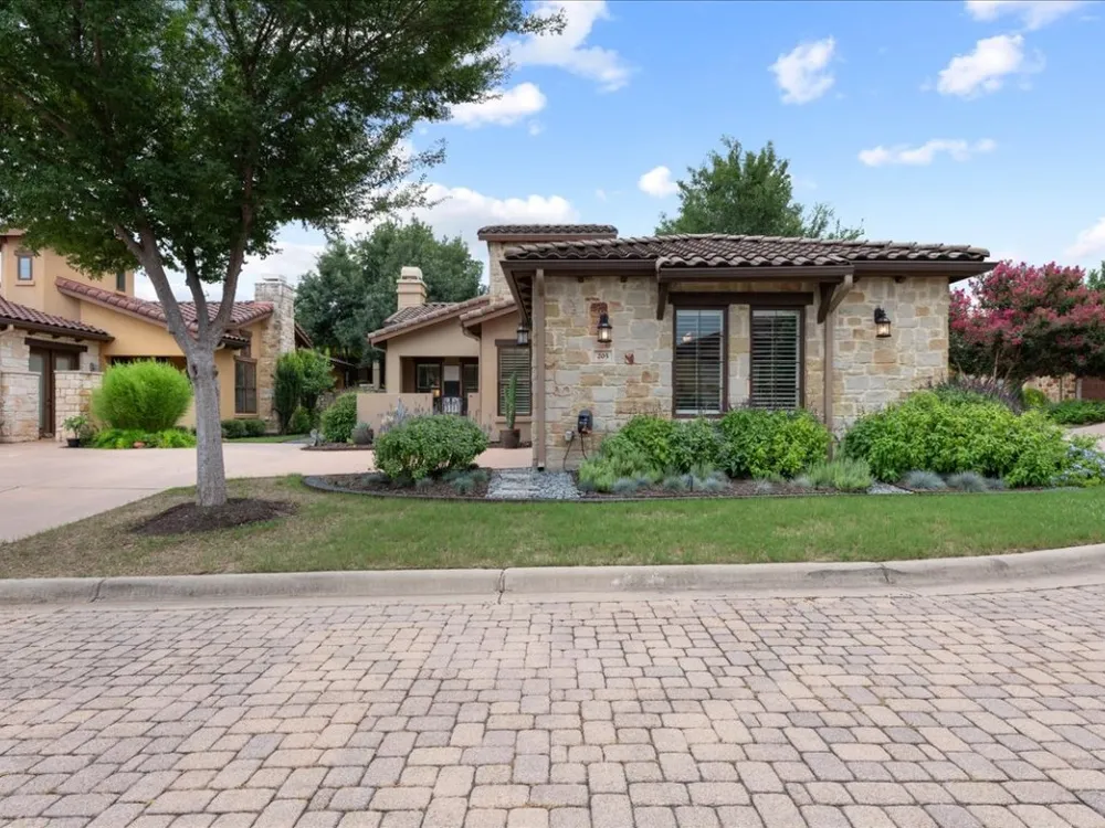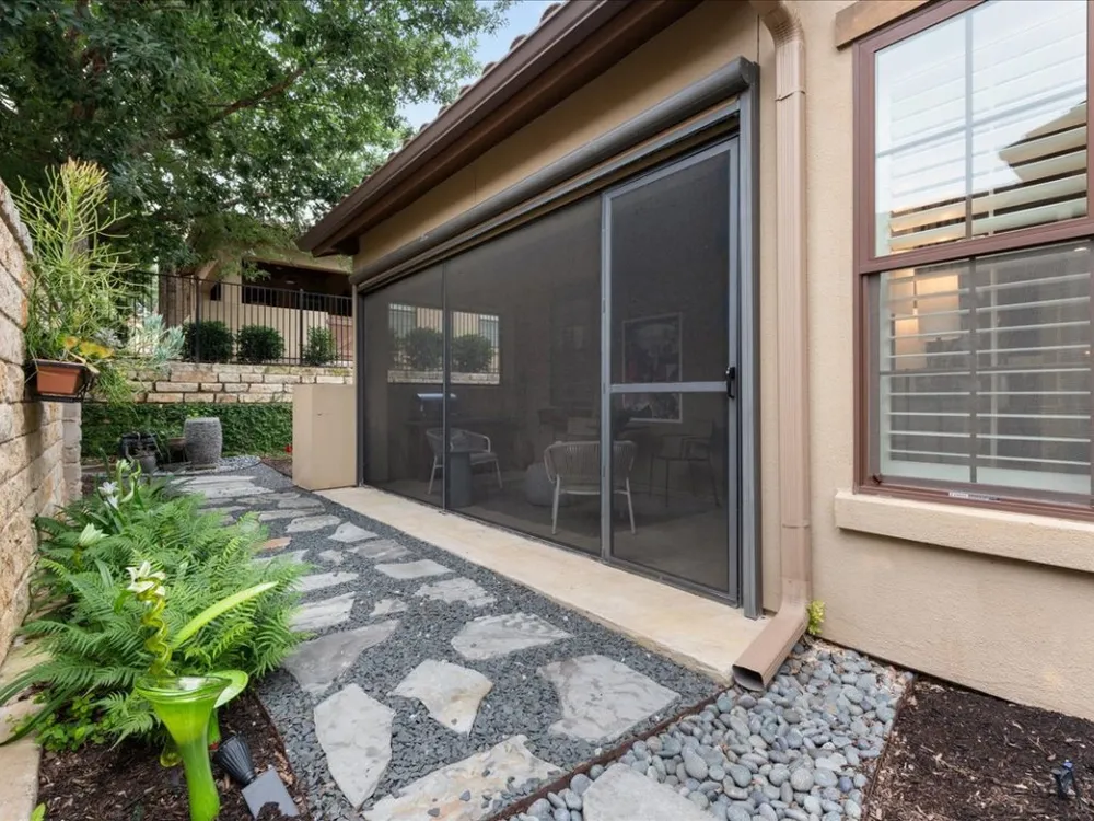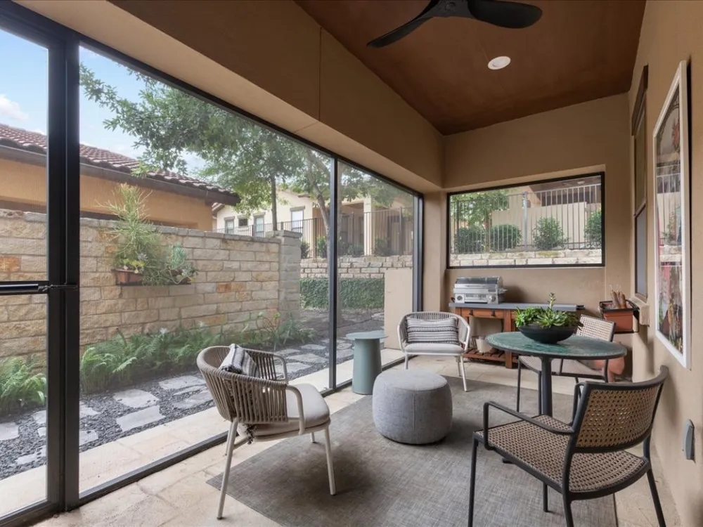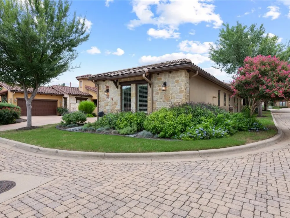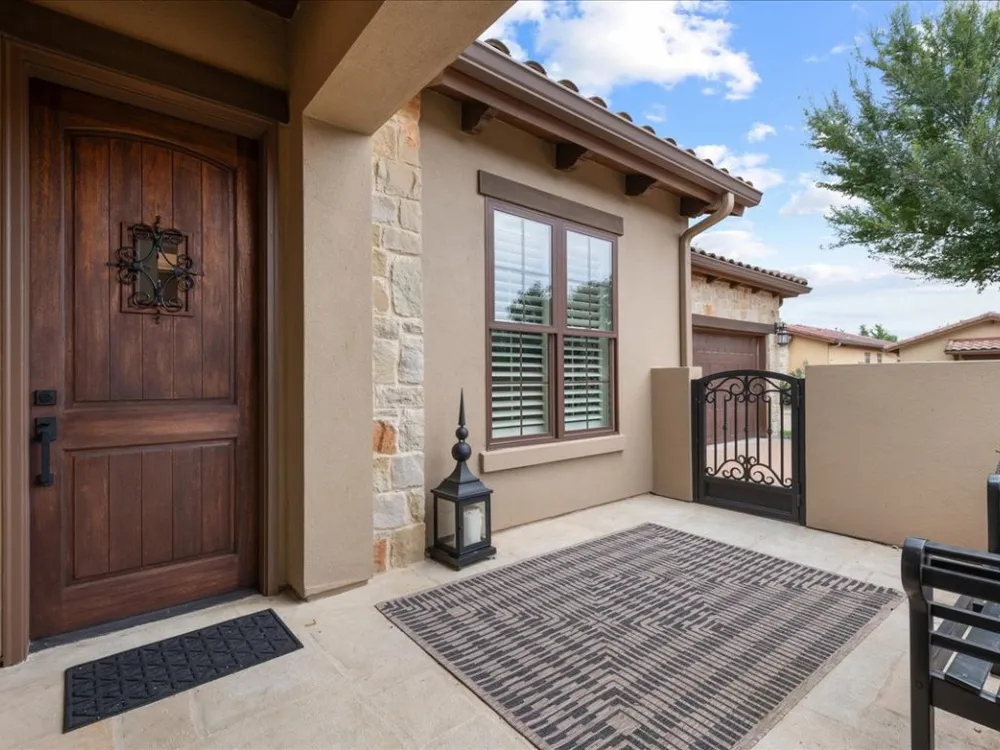 Enjoy living in Tuscan Village, a 55+ wonderful and active community in a great location in Lakeway. This is a free standing villa on a beautiful street and a premier corner lot. You enter through a gated courtyard into the foyer and view this lovingly updated home. This spacious two bedrooms and two baths offers an open floor plan with high ceilings, a designated office and abundant lighting with plantation shutters on all the windows. The kitchen is open to the living room and dining area and features stainless steel appliances. The primary bedroom offers a a large walk in closet finished out by California Closets. Primary bathroom has a shower, double vanities, all with updated plumbing fixtures, hardware, mirrors and tile in the shower. The second bathroom has beautiful new wall paper also and has been updated with hardware, mirror and tile in the bath/shower. There are gorgeous new light fixtures throughout the house. Enjoy the outdoors on the screen porch as you view the creative glass flower garden. The clubhouse with a full gym, yoga room, pool table and room to play games and cards is around the corner. There is also a heated lap pool, pickle ball court, putting green, organized community activities and many new friends to meet. Refrigerator, washer and dryer will convey with the sale of the property.