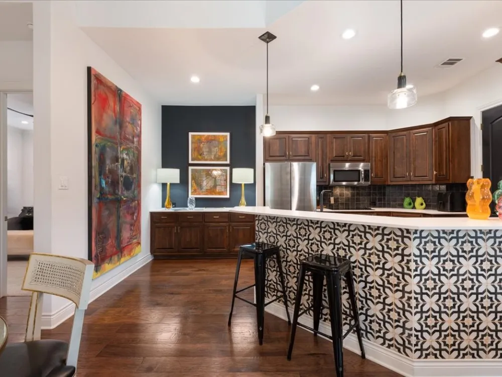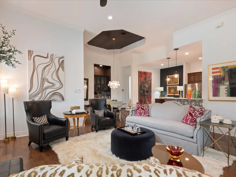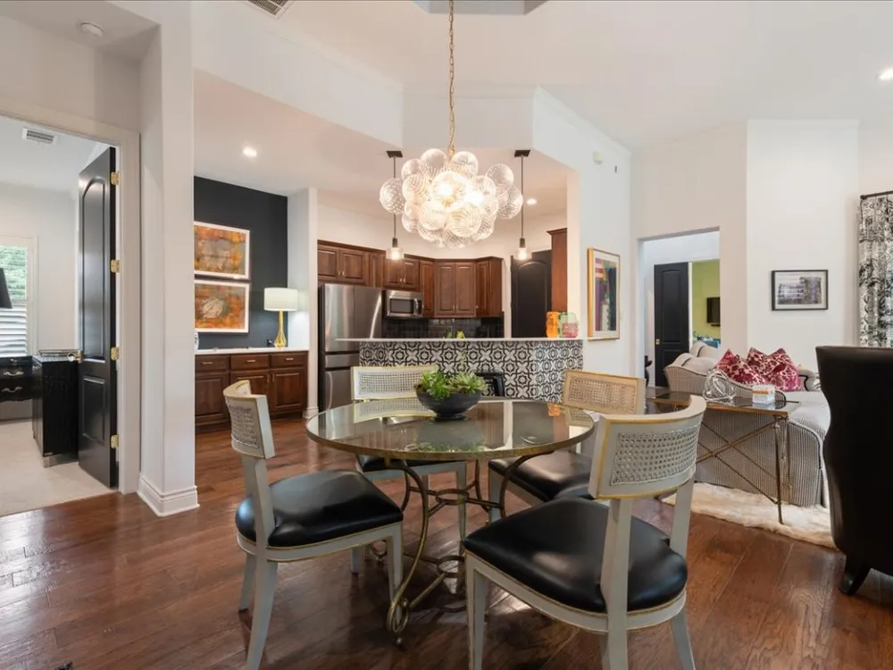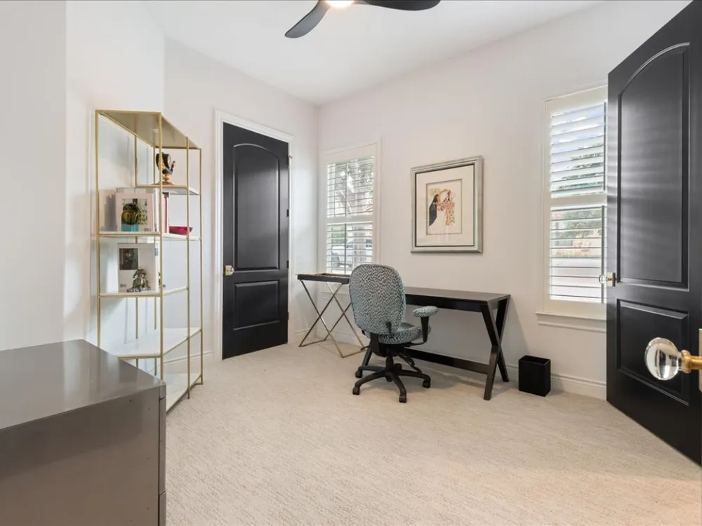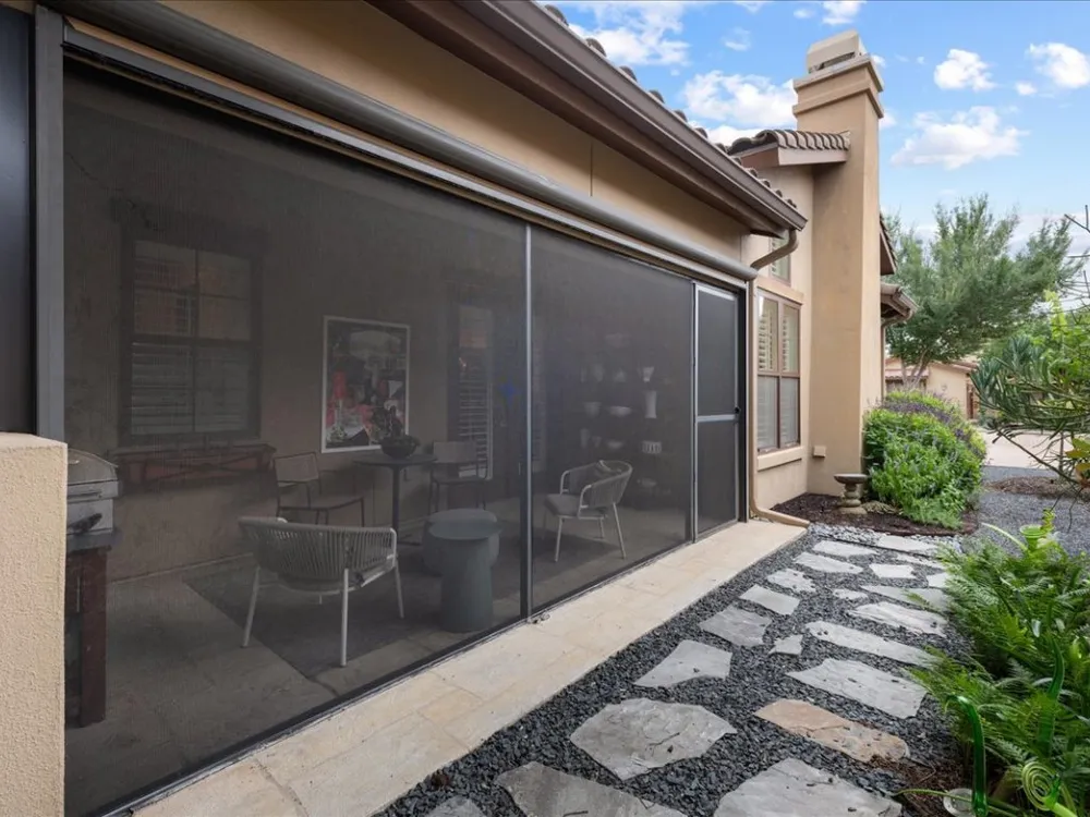 Enjoy living in Tuscan Village, a 55+ wonderful and active community in a great location in Lakeway. This is a free standing villa on a beautiful street and a premier corner lot. You enter through a gated courtyard into the foyer and view this lovingly updated home. This spacious two bedrooms and two baths offers an open floor plan with high ceilings, a designated office and abundant lighting with plantation shutters on all the windows. The kitchen is open to the living room and dining area and features stainless steel appliances. The primary bedroom offers a a large walk in closet finished out by California Closets. Primary bathroom has a shower, double vanities, all with updated plumbing fixtures, hardware, mirrors and tile in the shower. The second bathroom has beautiful new wall paper also and has been updated with hardware, mirror and tile in the bath/shower. There are gorgeous new light fixtures throughout the house. Enjoy the outdoors on the screen porch as you view the creative glass flower garden. The clubhouse with a full gym, yoga room, pool table and room to play games and cards is around the corner. There is also a heated lap pool, pickle ball court, putting green, organized community activities and many new friends to meet. Refrigerator, washer and dryer will convey with the sale of the property.