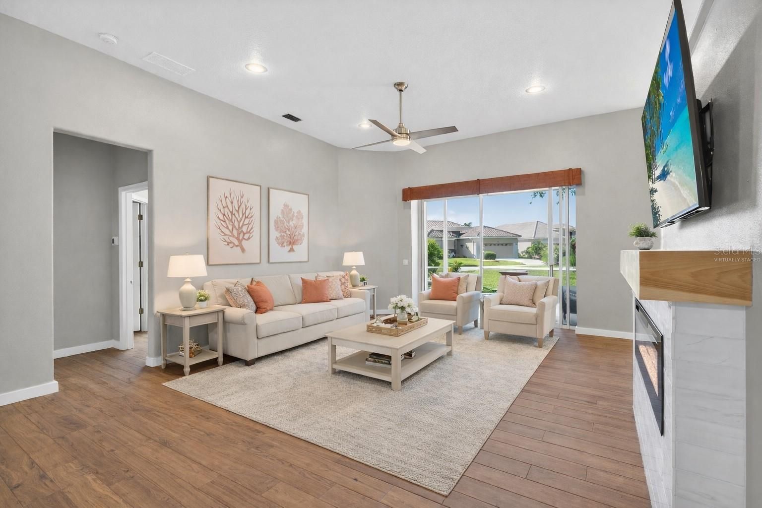 One or more photo(s) has been virtually staged. DON’T LOOK ANY FURTHER! Here is your opportunity to live in the highly sought-after gated community of Wexford on the Green in The Plantation. This beautiful 2BD + OFFICE / 2BA, fully remodeled, meticulously maintained, MOVE-IN READY home is tucked away in a quiet CUL-DE-SAC with mature landscaping and exceptional curb appeal. You just found your new home! Major updates include NEWER TILE ROOF (2023), BRAND NEW A/C (2026), BRAND NEW WATER HEATER (2026), BRAND NEW KITCHEN with NEW APPLIANCES, WOOD-LOOK TILE THROUGHOUT (NO CARPET!) FRESHLY REPAINTED INTERIOR + LANAI (2026), BUILT-IN ELECTRIC FIREPLACE with marble surround and mantle (2026), NEWLY REMODELED BATHROOMS (2026), NEW CUSTOM CLOSETS (2026), NEW LIGHTING, CEILING FANS & FIXTURES, NEW CUSTOM BLINDS, RE-PLUMBED (JANUARY 2026) This home is NOT IN A FLOOD ZONE (ZONE X!) REASONABLE HOA FEES | NO CDD. Step into the stunning newly remodeled kitchen featuring tall upper cabinets, soft-close drawers, stylish GRANITE COUNTERTOPS, designer backsplash, built-in desk area, and a cozy breakfast nook. The spacious open living and dining area flows seamlessly to the fully screened lanai — the perfect place to enjoy your morning coffee or an evening glass of wine. The sun-filled Primary Suite offers a brand new custom walk-in closet and a beautifully remodeled bathroom with double sink vanity, granite countertops, fully tiled step-in shower, and glass enclosure. At the front of the home, you’ll find a good size, screened porch and when you step into the house on the left there is a private second bedroom and another fully renovated bathroom with new vanity, granite counter, updated lighting, and fixtures. The versatile OFFICE/DEN provides abundant natural light — ideal for working from home, studying, or creative space. The split-bedroom floorplan offers excellent privacy for guests. Residents enjoy access to a HEATED COMMUNITY POOL — perfect year-round. This home truly combines everything you need to enjoy the Florida lifestyle: comfort, style, and an unbeatable location. Just minutes to: Wellen Park Downtown, Upscale restaurants & shopping, Weekly live music events, Large recreational lake with water activities, Walking & biking trails. Only: 8 miles to Historic Downtown Venice Island, 10–15 minutes to world-famous beaches: MANASOTA BEACH, VENICE BEACH, CASPERSEN BEACH, The Legacy Trail, Atlanta Braves Stadium, State College of Florida, medical centers, shopping, A-rated schools, natural mineral springs & more, New hospital currently under construction nearby. Optional membership to Plantation Golf & Country Club offers: 2 PREMIER GOLF COURSES, Private dining, Resort-style pools, Fitness center, Spa, Sauna, Pickleball & tennis courts and Vibrant social calendar. Beautiful Venice — with its charming historic downtown, famous beaches, pier, restaurants, golf courses, and welcoming communities — is truly a little PIECE OF PARADISE. Conveniently located just off US-41 for easy commuting. Book your private showing today! This beautifully remodeled home in an excellent, peaceful location will not last long.