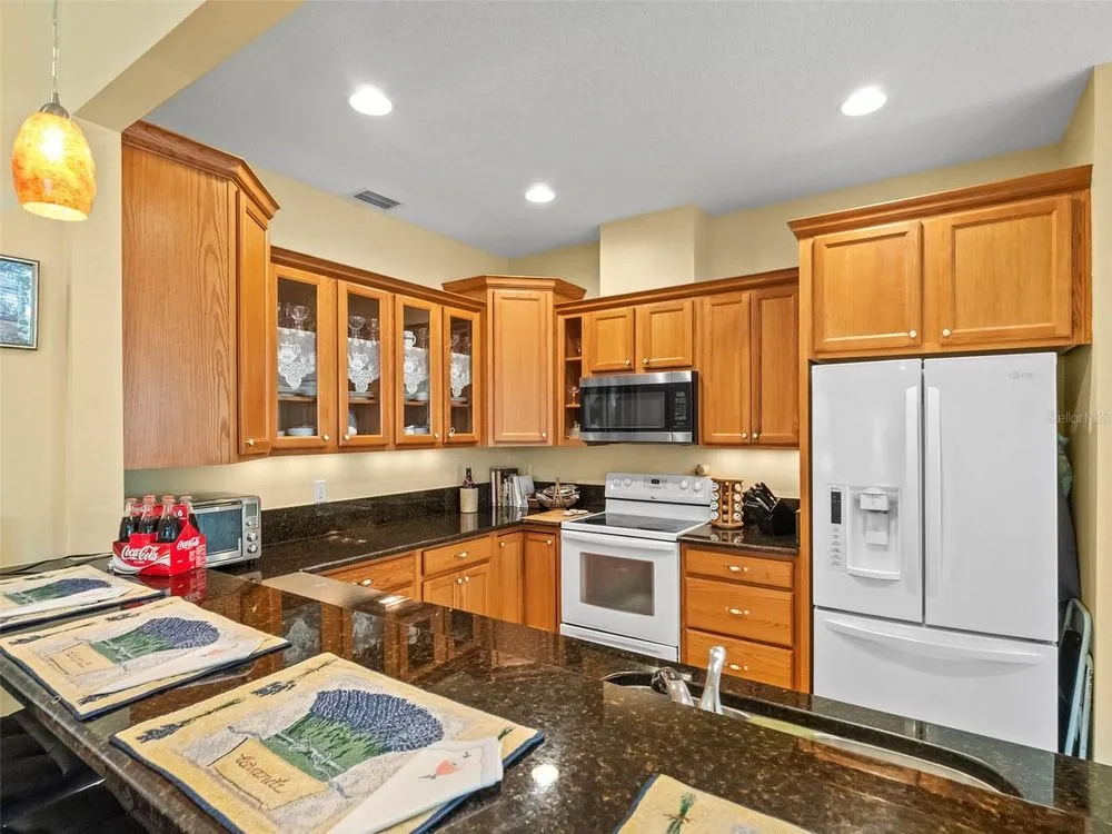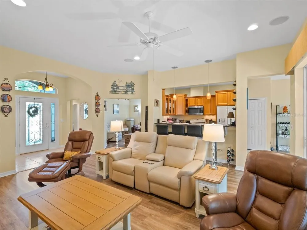 This Custom Designed Pringle Home includes two spacious bedrooms and a Den! With an Open Concept Floor Plan, newly installed Quartz in both bathrooms, a 2023 HVAC system with heat pump, and Luxury Vinyl Plank Flooring in all the main living areas, you'll enjoy the updates and move-in readiness this property offers its new homeowners. The expanded lanai overlooks beautiful and lush greenspace, making this area a great place to entertain, relax, and create life-long memories. The split bedroom floor plan has high ceilings and was mindfully designed for both owner and guests privacy & comfort in mind. You'll love the curb appeal as you approach the home and the screened entry will invite you in! The wide foyer leads you into the large living area with access to all areas of the home. The kitchen is equipped with white appliances, granite countertops, solid wood cabinets with crown molding and under-cabinet lighting. The home has in-wall pest control, a transferable termite bond, and surround sound! This home has no carpeting or popcorn! The owner's suite is spacious and offers an ensuite with two closets, private commode, step-in shower plus two separate vanities! You'll love this custom design! Lastly, the inside laundry, attic space, coat closet, large dining & bar area make this THE ONE! Easy to show and ready for your offer! Royal Highlands is a gated, golf community for 55+ active adults! The low monthly HOA fee includes Comcast Xfinity Cable & Internet along with tons of amenities! Two pools, Great Hall, Fitness Center, Courts, Library, Dance Floor, Theater Stage, and Billiards! Close to MCO, Amusements, Shopping, Medical Facilities, and Historic Districts. Call for a tour today!