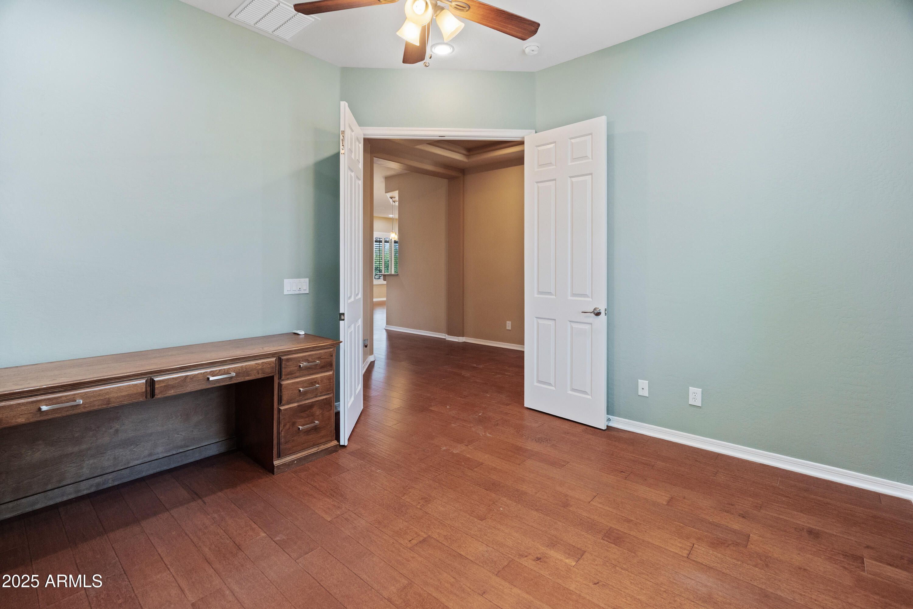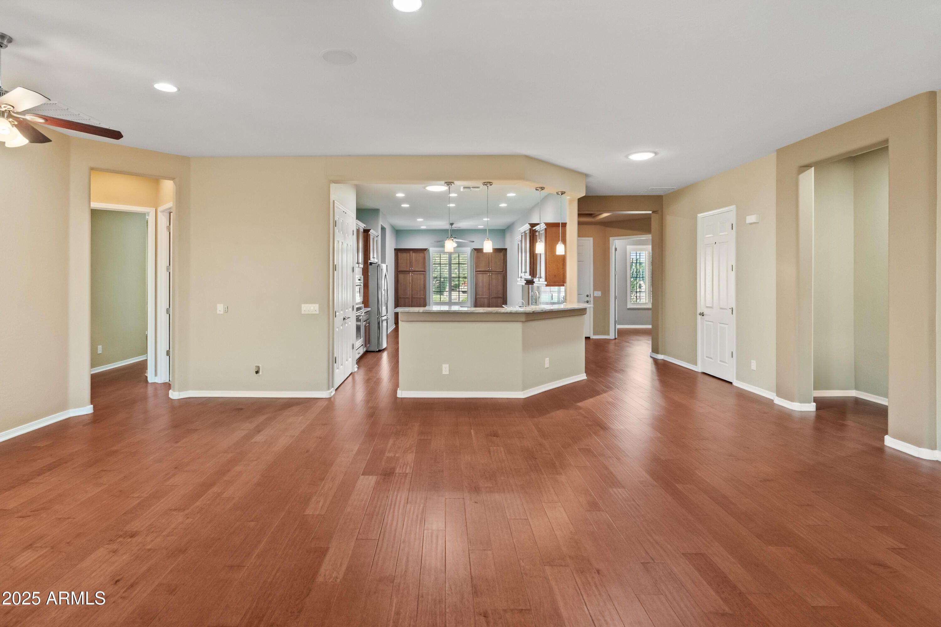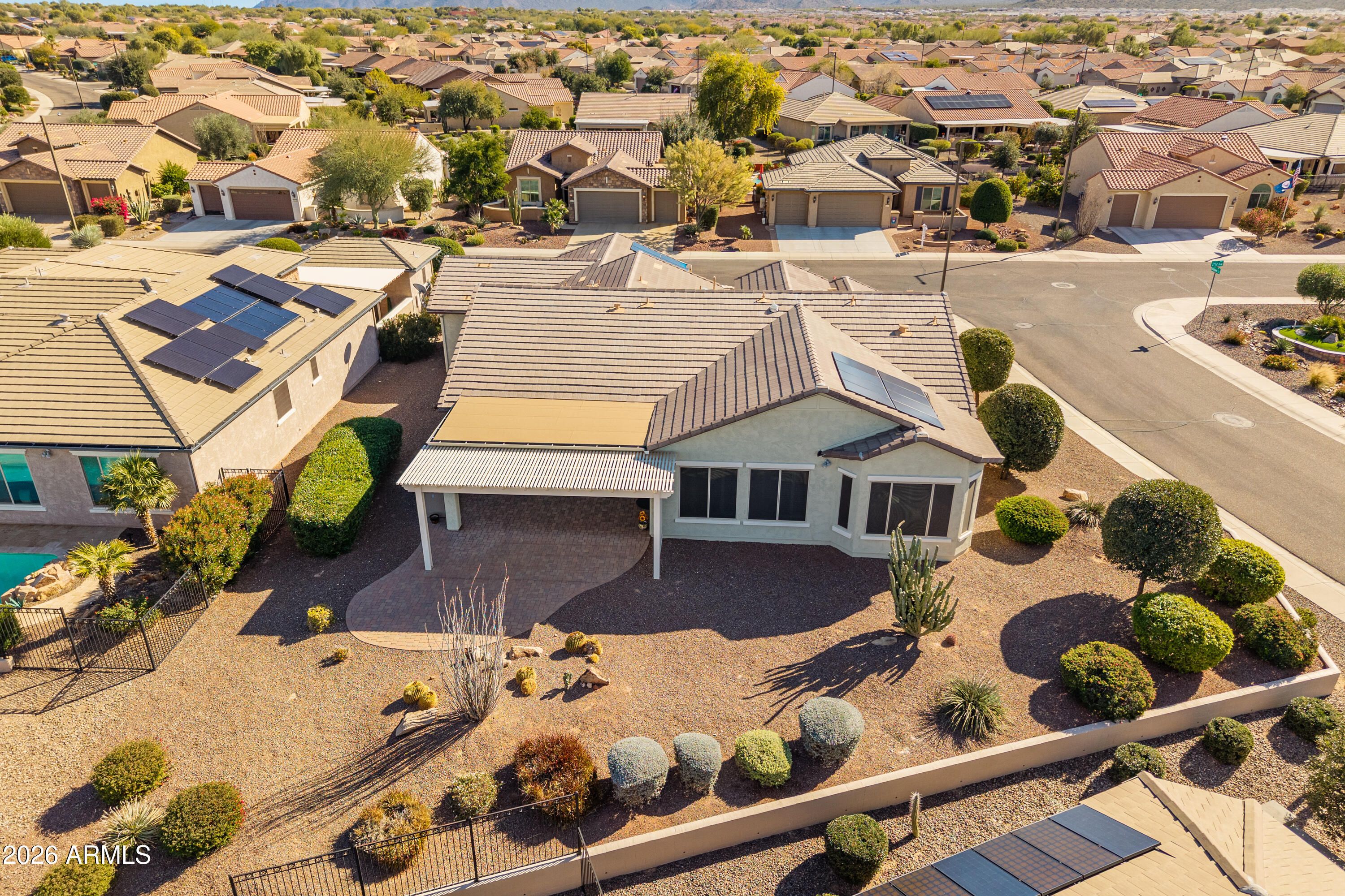 Luxury upgrades & resort-style living await in this stunning 2,452 sq ft golf-course retreat! Perfectly set on an oversized corner lot with fantastic views of Vista #6, this home sits right off the fairway & just yards from the green, capturing sweeping scenery & unforgettable sunsets. Inside, enjoy rich wood floors, plantation shutters, solar tubes & an entertainer's kitchen w/granite, pull-out cabinetry, stainless appliances & a spacious island. The split plan offers a private owner's suite, 2 guest rooms & a versatile office/den w/Murphy bed. The 4-ft extended, insulated 3-car garage w/mini-split & new epoxy floors is ideal for a golf cart or workshop. Enjoy the extended covered patio, owned solar, fresh paint & easy-care landscaping, all in Sun City Festival where active adults play!