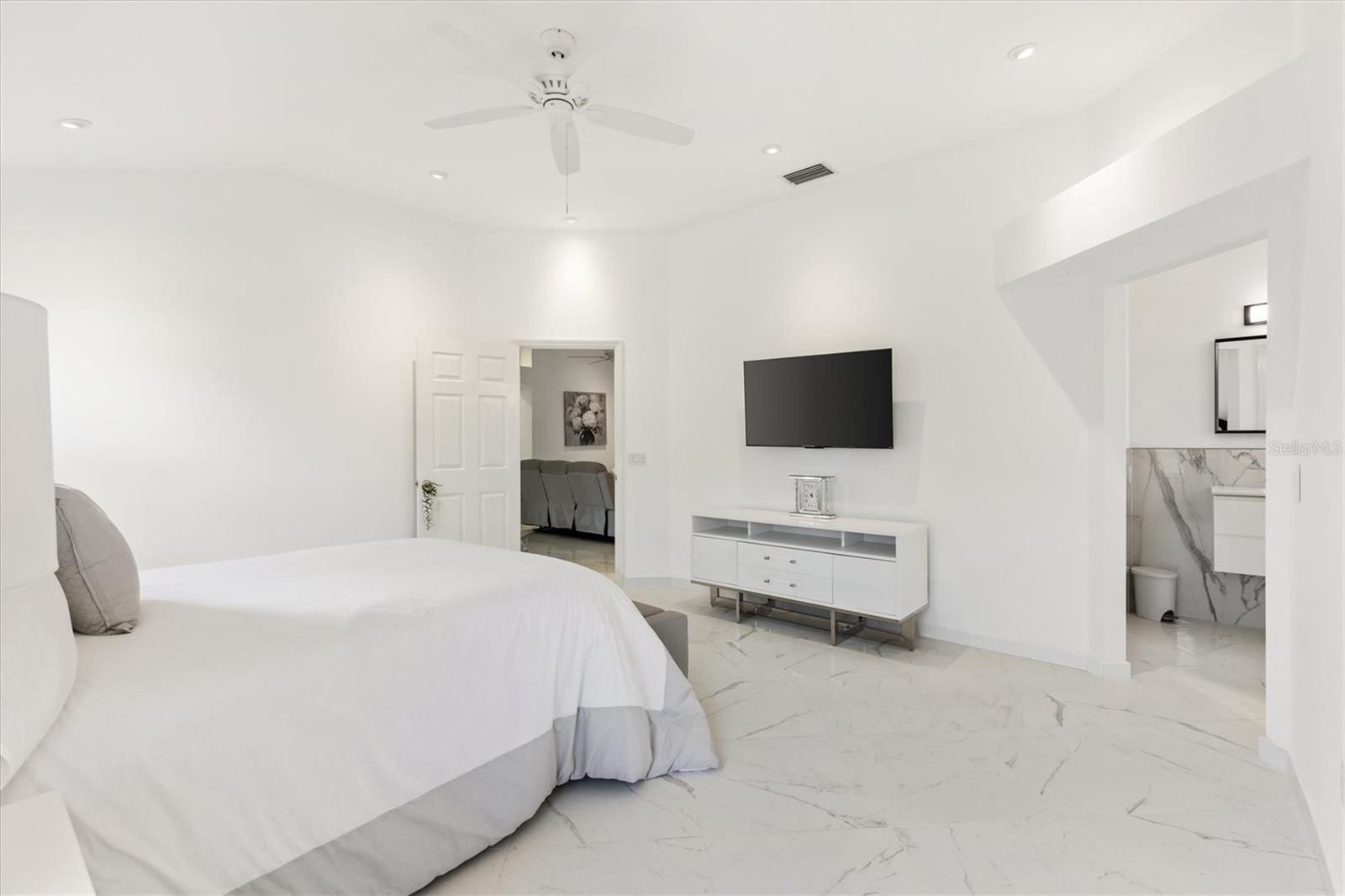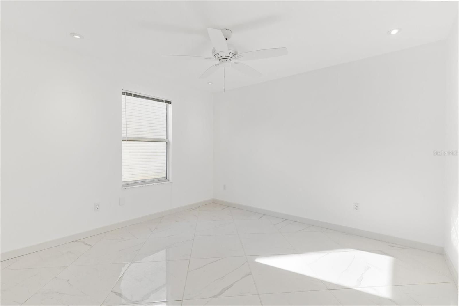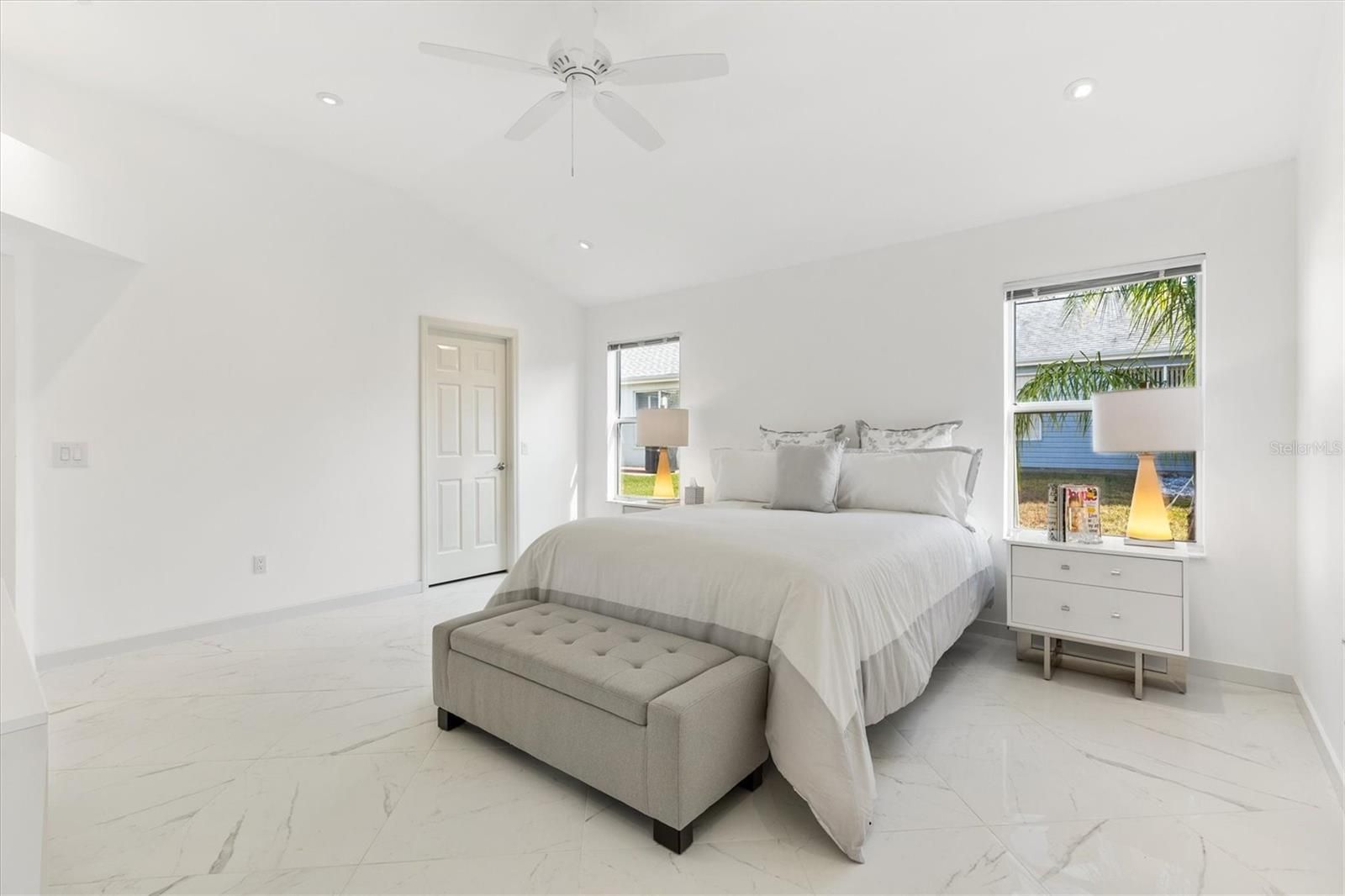 - Ceiling Fan(s), High Ceilings, Living/Dining Room, Open Floorplan, Main Level Primary, Solid Surface Counters, Stone Counters, Walk-In Closet(s)