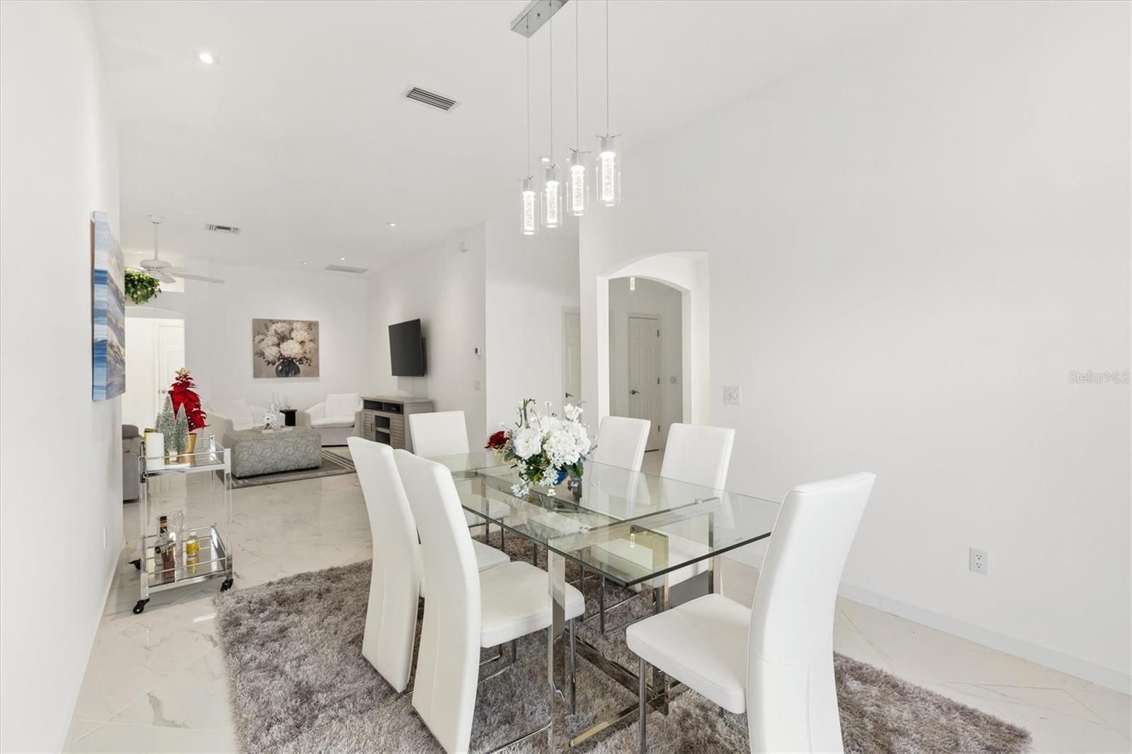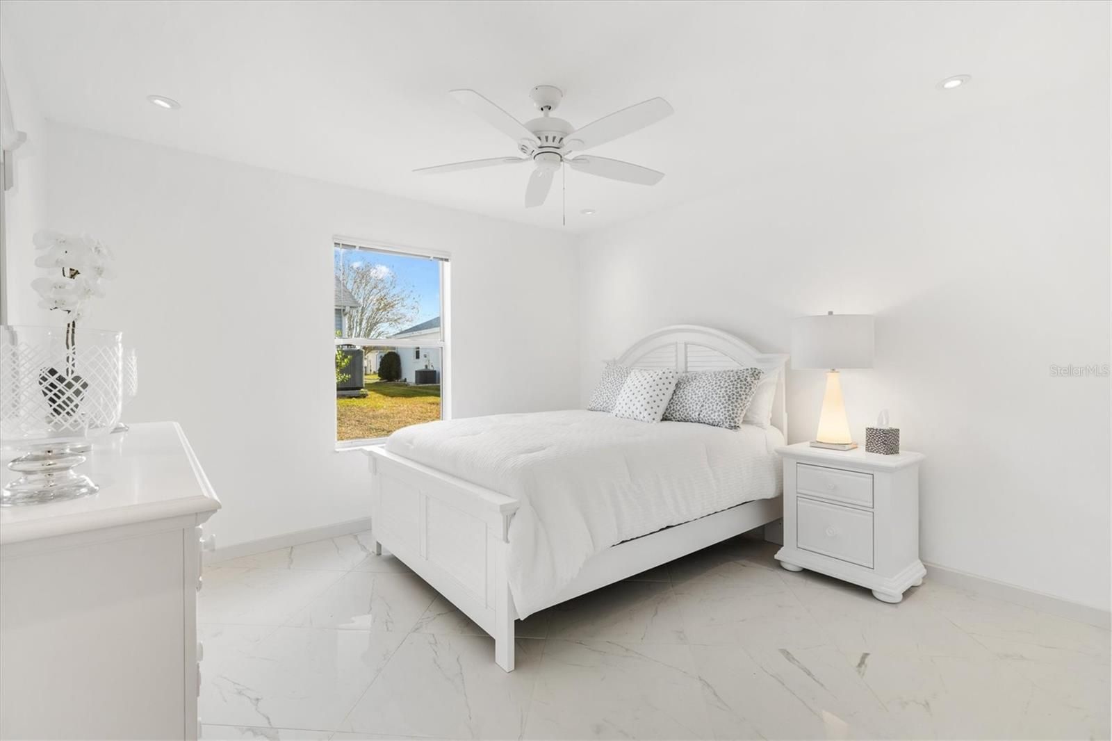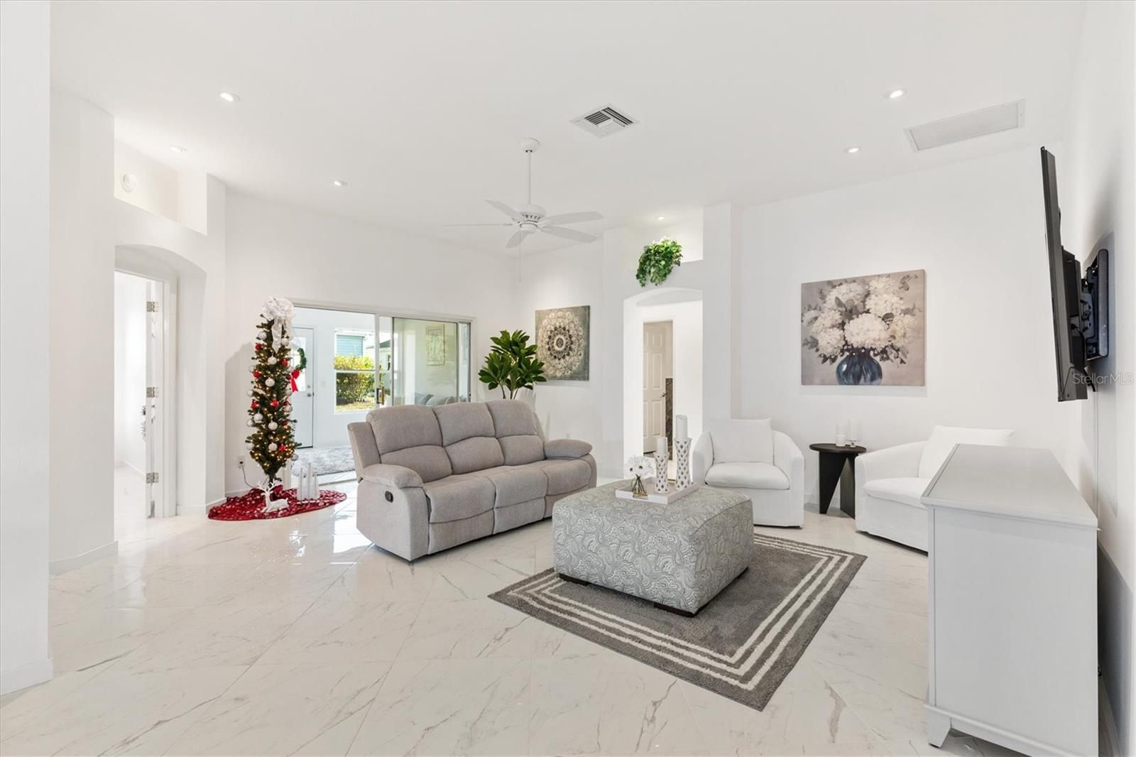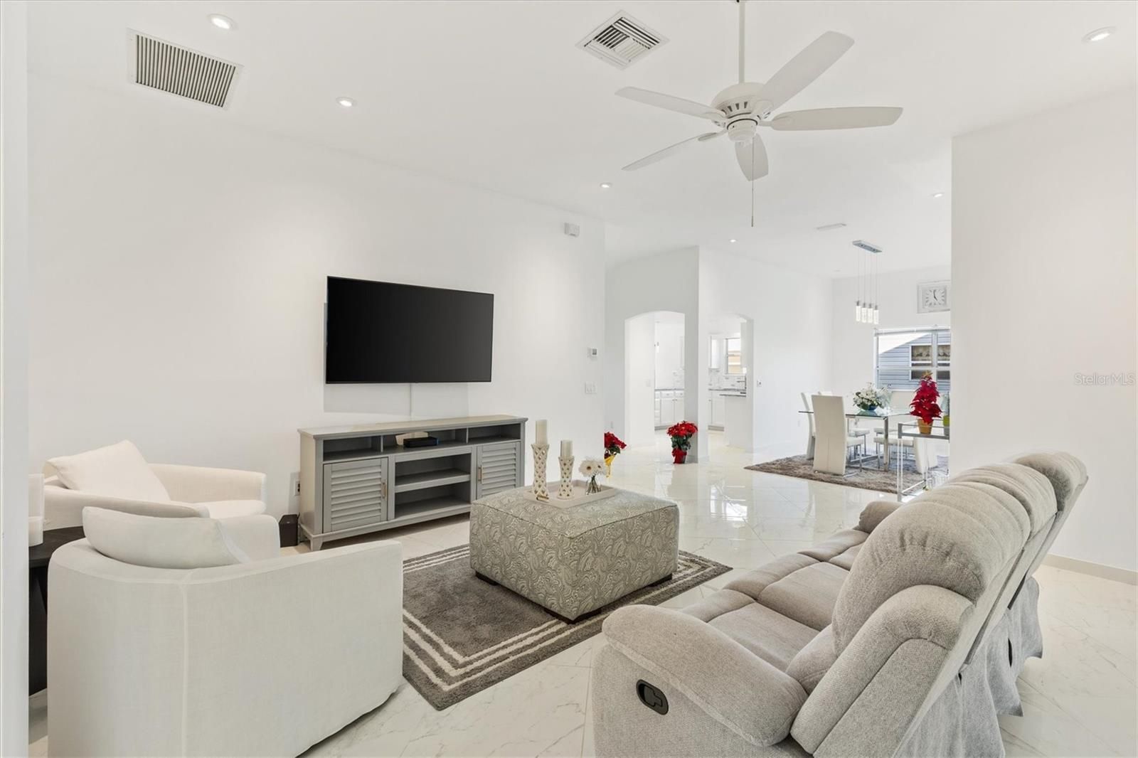 This completely remodeled 1,908 sqft Vera Cruz Model featuring 3 bedrooms and 2 baths is a MUST SEE! This home has been updated from top to bottom with nothing spared. Opening the front door is like stepping into heaven with Large Luxury Porcelain Tile flooring installed on an angle throughout the entire home — no carpet. Cloud tone walls, trim, and cabinetry at every turn. Modern LED flush mounted lighting adds ambiance to every room with dimmers that can adjust to match the mood. The kitchen features newer stainless steel appliances and granite counter tops with plenty of room for a dinette table overlooking the bay windows. The living and dining areas provide ample space for entertaining and relaxation. The large master bedroom and ensuite bath provides the perfect getaway with floating vanity cabinets, a custom luxury shower featuring a true rainforest shower head, hand wand and a 6-jet body shower panel. The master bedroom features two walk-in closets with plenty of room for clothing and additional storage. The Vera Cruz is a split floor plan. On the opposite side of the home there are two spacious bedrooms and a guest bathroom which also features a floating vanity and a custom luxury shower. But wait, there's more! The finished 13’ x 10’ Florida Room that's just off the living room is a perfect place for an office, craft room or an additional room for TV entertainment. The home is located less than 1/2 mile from the Tierra del Sol Country Club — featuring a Rec Center, Tennis Courts, Pool, Bocce Lanes, and a Studio Theater. This central location is the heart of The Villages — you'll enjoy travelling less than 10 minutes by golf cart to either Sumter Landing and Spanish Springs Town Squares, plus plenty of retail shopping and restaurants nearby. The Bond is Paid. The HVAC and Water Heater were replaced in 2022, and the Roof was replaced in 2016. Reach out and schedule your private tour of this beautifully remodelled home today!