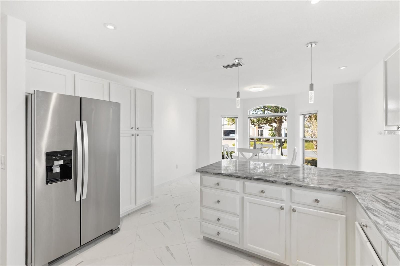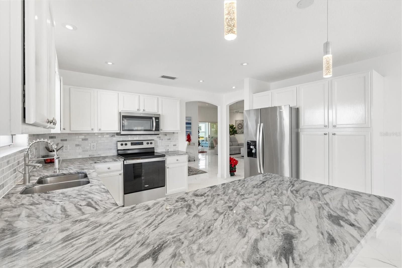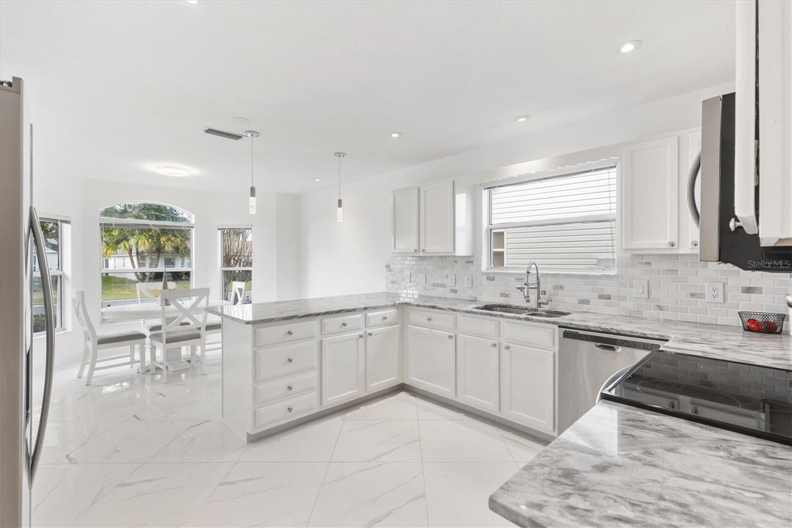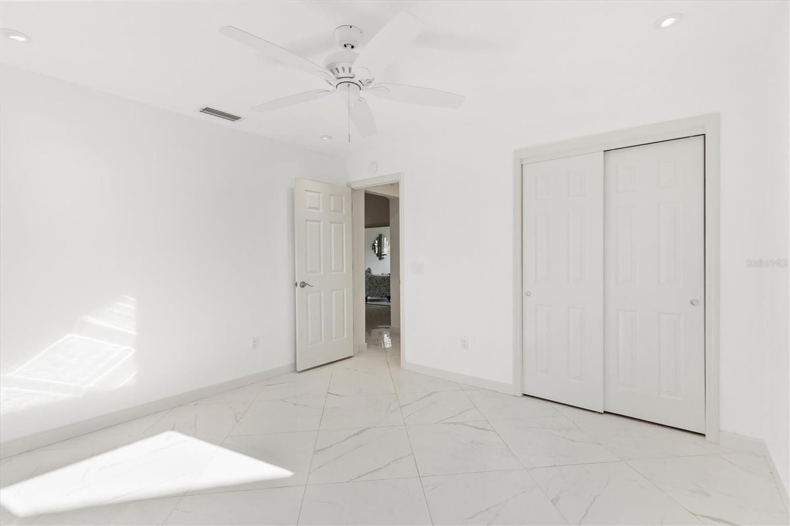 This completely remodeled 1,908 sqft Vera Cruz Model featuring 3 bedrooms and 2 baths is a MUST SEE! This home has been updated from top to bottom with nothing spared. Opening the front door is like stepping into heaven with Large Luxury Porcelain Tile flooring installed on an angle throughout the entire home — no carpet. Cloud tone walls, trim, and cabinetry at every turn. Modern LED flush mounted lighting adds ambiance to every room with dimmers that can adjust to match the mood. The kitchen features newer stainless steel appliances and granite counter tops with plenty of room for a dinette table overlooking the bay windows. The living and dining areas provide ample space for entertaining and relaxation. The large master bedroom and ensuite bath provides the perfect getaway with floating vanity cabinets, a custom luxury shower featuring a true rainforest shower head, hand wand and a 6-jet body shower panel. The master bedroom features two walk-in closets with plenty of room for clothing and additional storage. The Vera Cruz is a split floor plan. On the opposite side of the home there are two spacious bedrooms and a guest bathroom which also features a floating vanity and a custom luxury shower. But wait, there's more! The finished 13’ x 10’ Florida Room that's just off the living room is a perfect place for an office, craft room or an additional room for TV entertainment. The home is located less than 1/2 mile from the Tierra del Sol Country Club — featuring a Rec Center, Tennis Courts, Pool, Bocce Lanes, and a Studio Theater. This central location is the heart of The Villages — you'll enjoy travelling less than 10 minutes by golf cart to either Sumter Landing and Spanish Springs Town Squares, plus plenty of retail shopping and restaurants nearby. The Bond is Paid. The HVAC and Water Heater were replaced in 2022, and the Roof was replaced in 2016. Reach out and schedule your private tour of this beautifully remodelled home today!