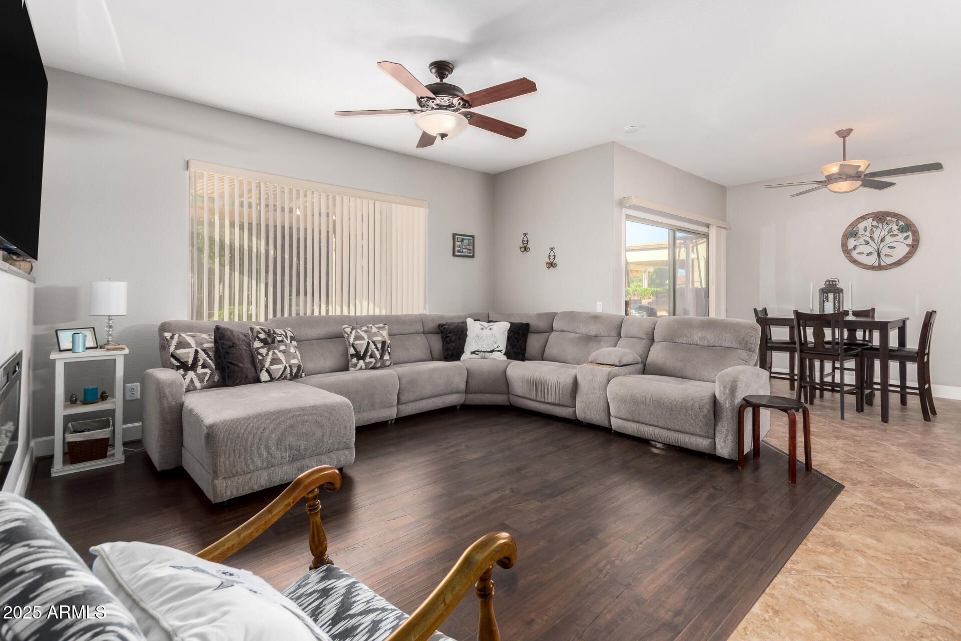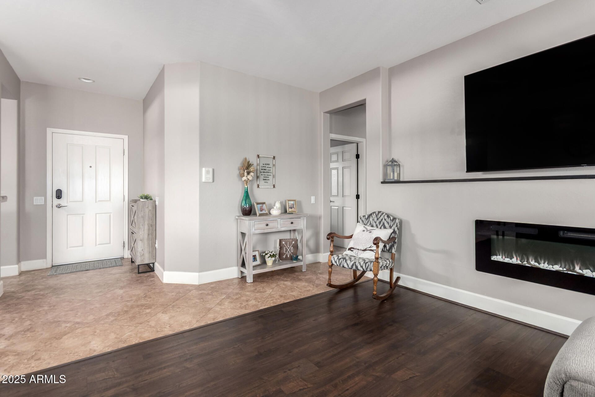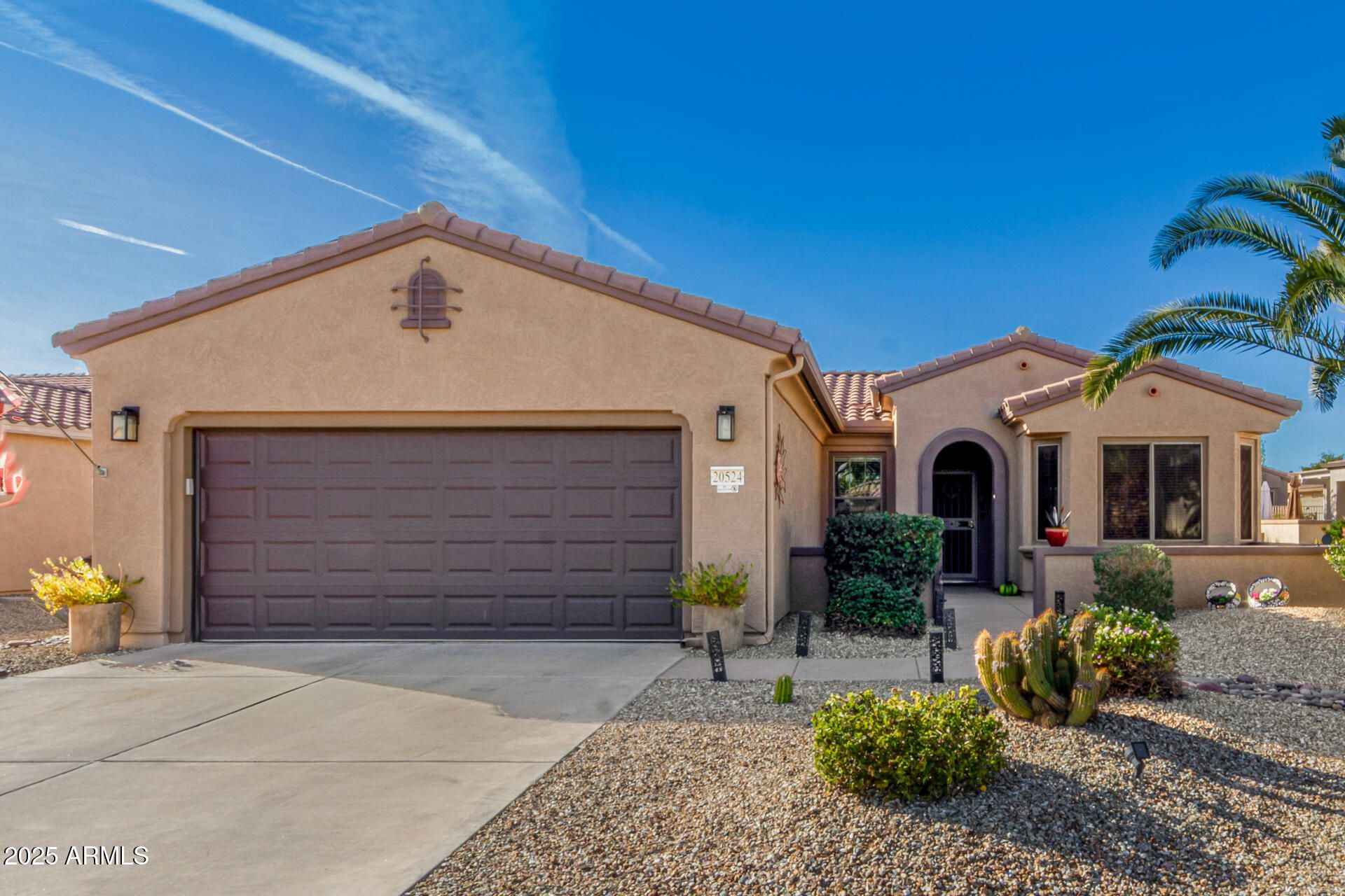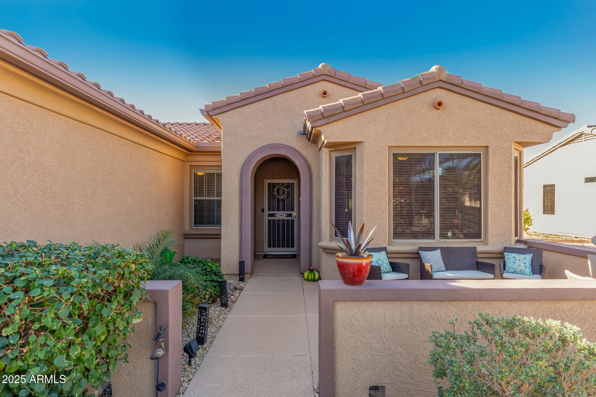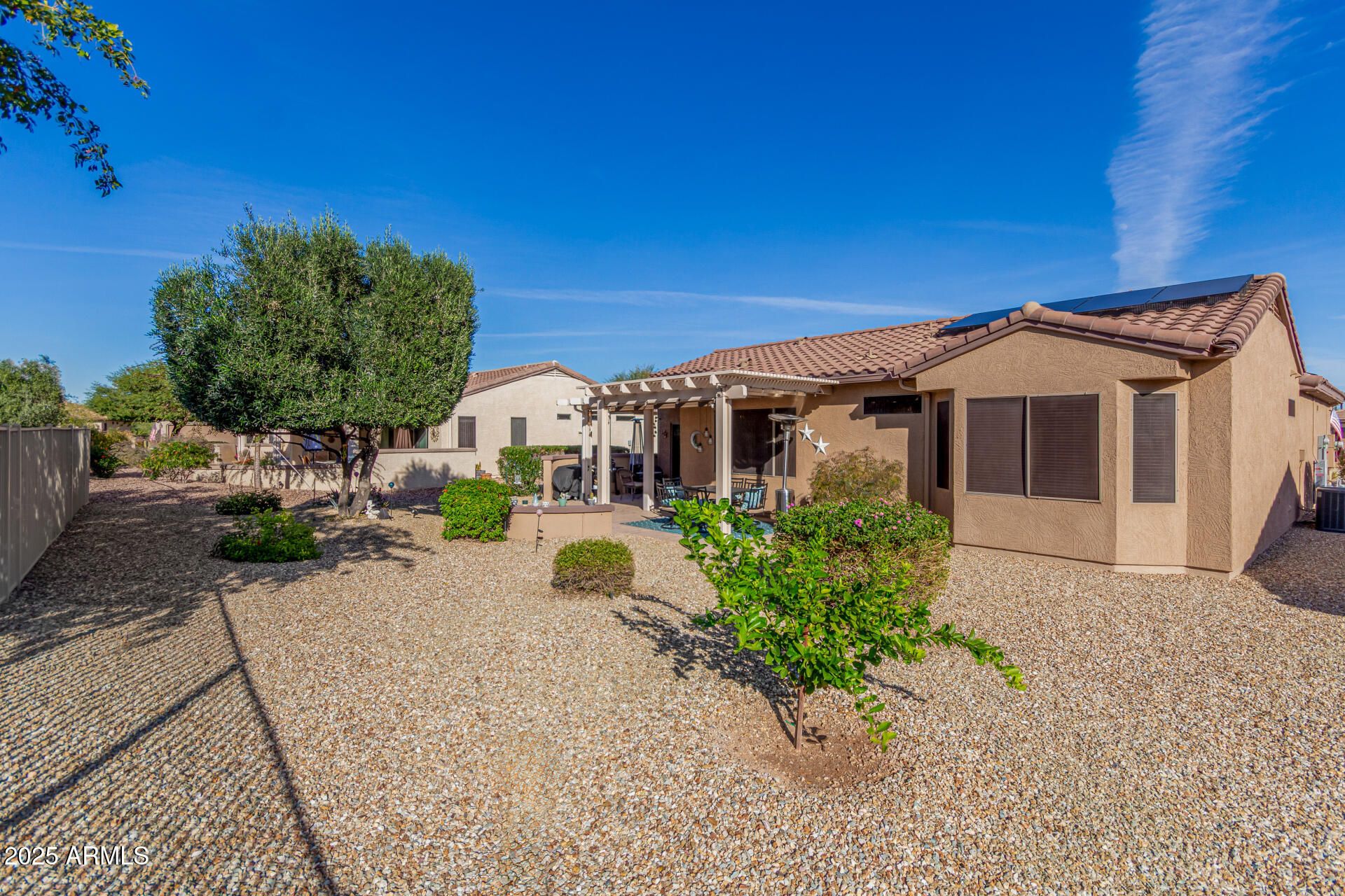 Feel right at home in this light-filled great room, perfect for everyday living and entertaining. Clean neutral finishes throughout. The kitchen shines with updated stainless appliances, granite countertops, a glass-tile backsplash, and sink. The spacious primary suite is a relaxing retreat with bay window, walk-in closet, and updated bath. You'll love these updates: faux fireplace, newer vinyl wood flooring, 16'' tile, baseboards, and fresh interior/exterior paint. 2022 HVAC and hot water heater. Enjoy morning coffee in the front courtyard or unwind under the covered back patio with new cool decking and sealer (Dec 2025). Extended garage with custom cabinets, new insulated garage door with opener (2024). 2025 new Solar with Tesla backup battery—many months show APS credit. Save MONEY