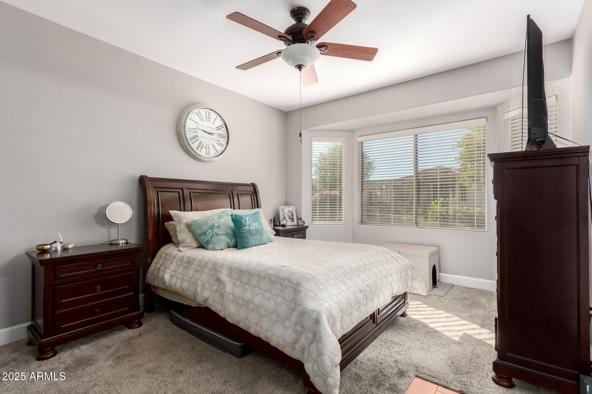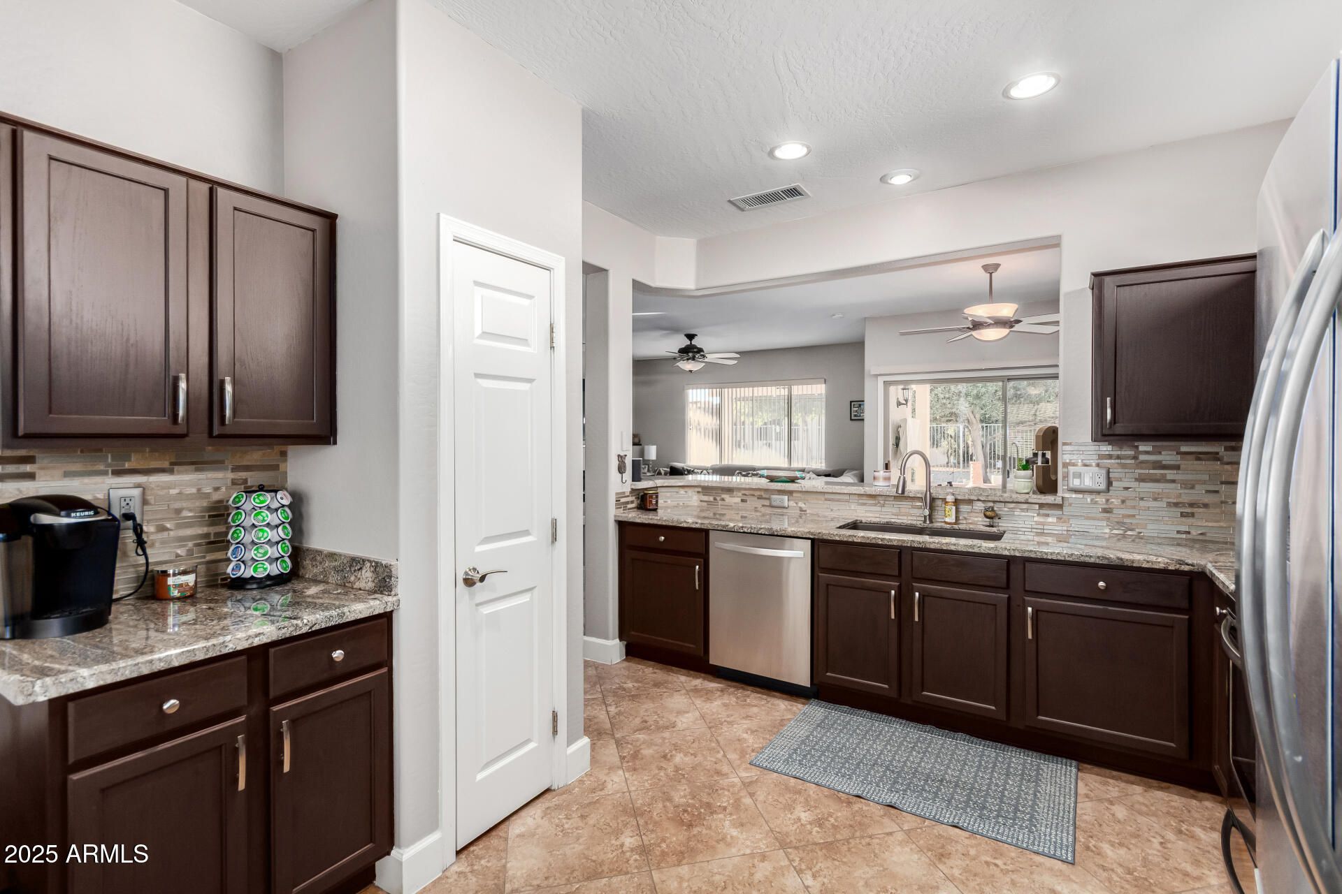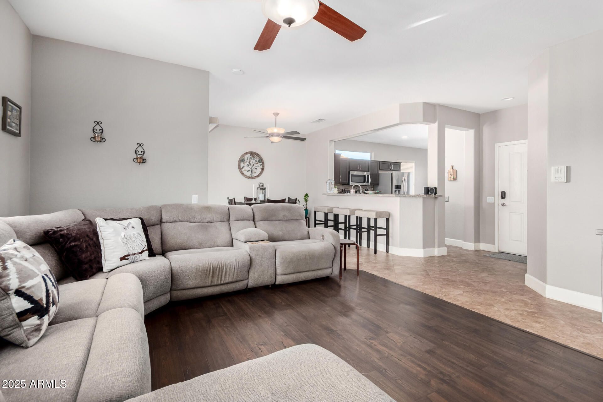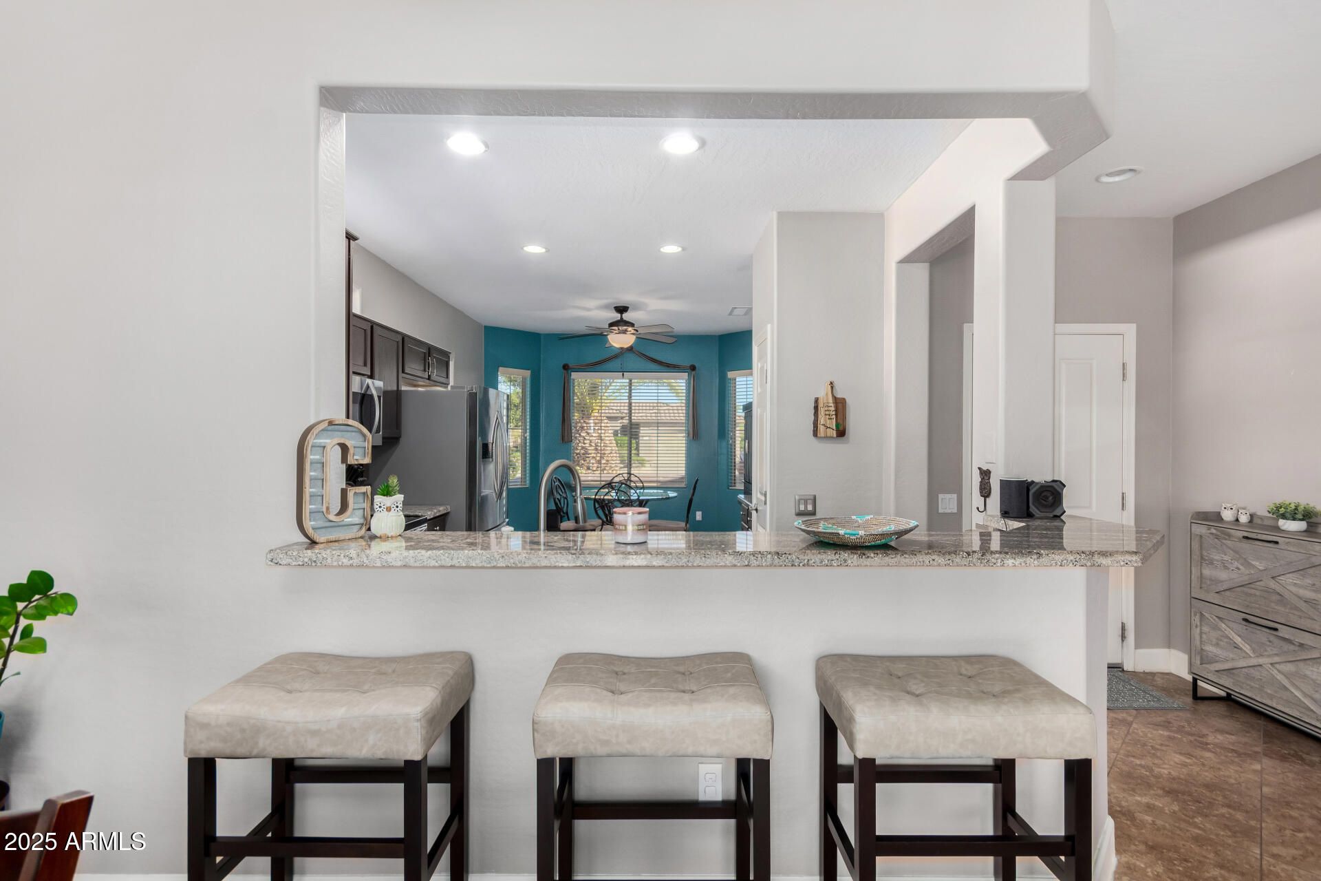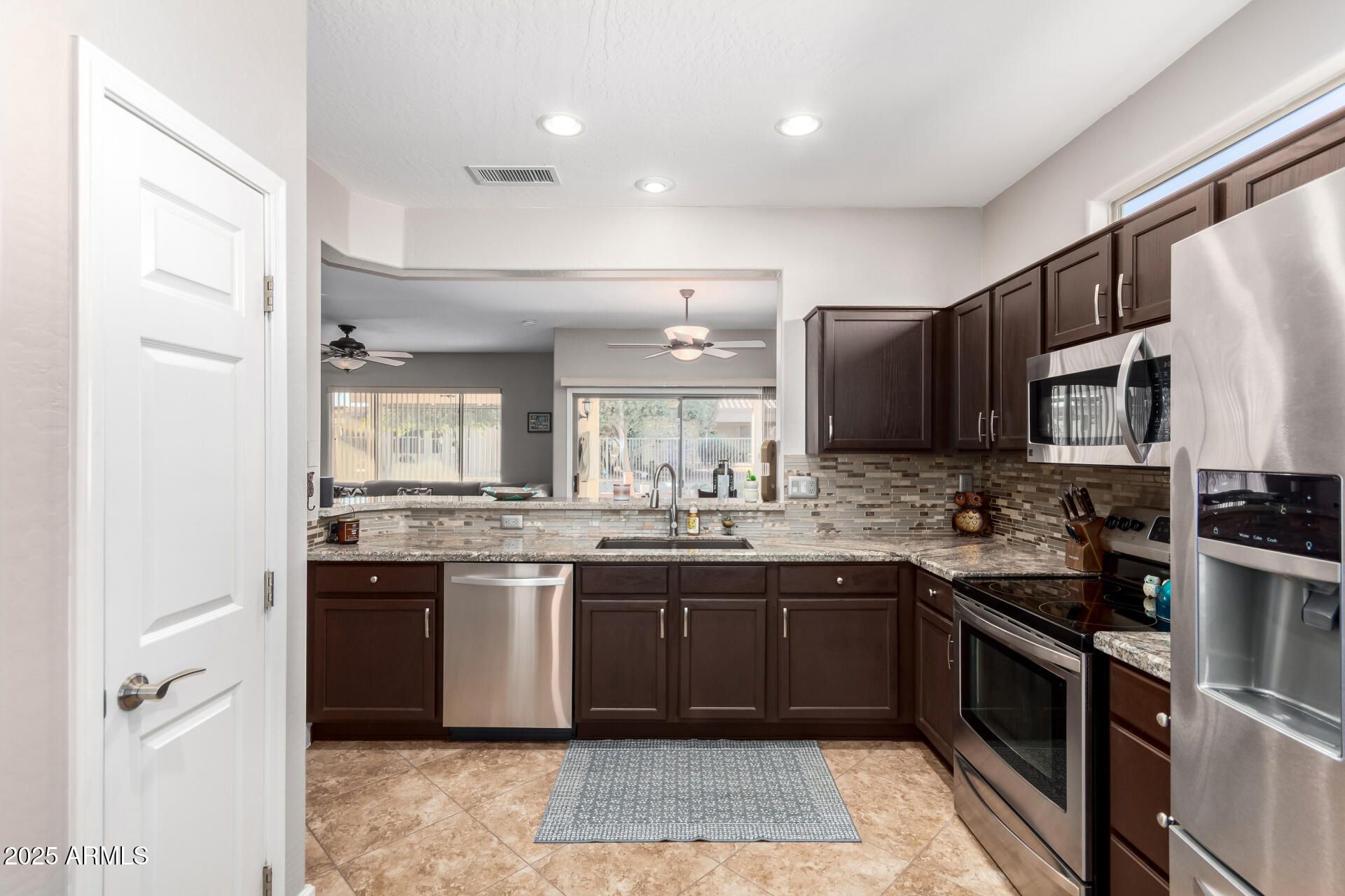Feel right at home in this light-filled great room, perfect for everyday living and entertaining. Clean neutral finishes throughout. The kitchen shines with updated stainless appliances, granite countertops, a glass-tile backsplash, and sink. The spacious primary suite is a relaxing retreat with bay window, walk-in closet, and updated bath. You'll love these updates: faux fireplace, newer vinyl wood flooring, 16'' tile, baseboards, and fresh interior/exterior paint. 2022 HVAC and hot water heater. Enjoy morning coffee in the front courtyard or unwind under the covered back patio with new cool decking and sealer (Dec 2025). Extended garage with custom cabinets, new insulated garage door with opener (2024). 2025 new Solar with Tesla backup battery—many months show APS credit. Save MONEY