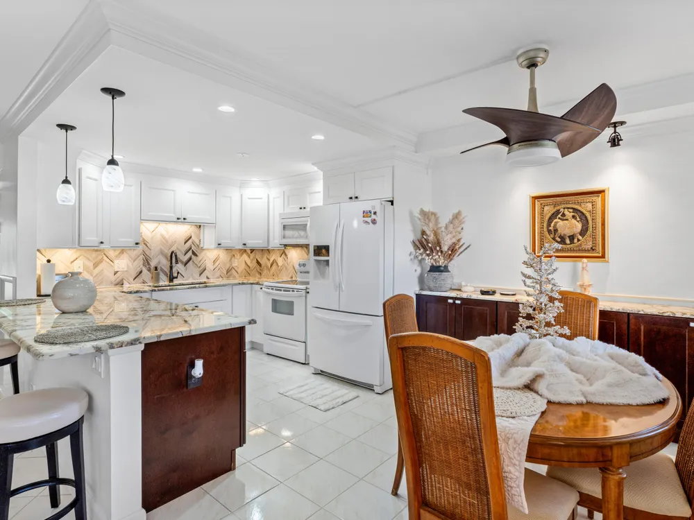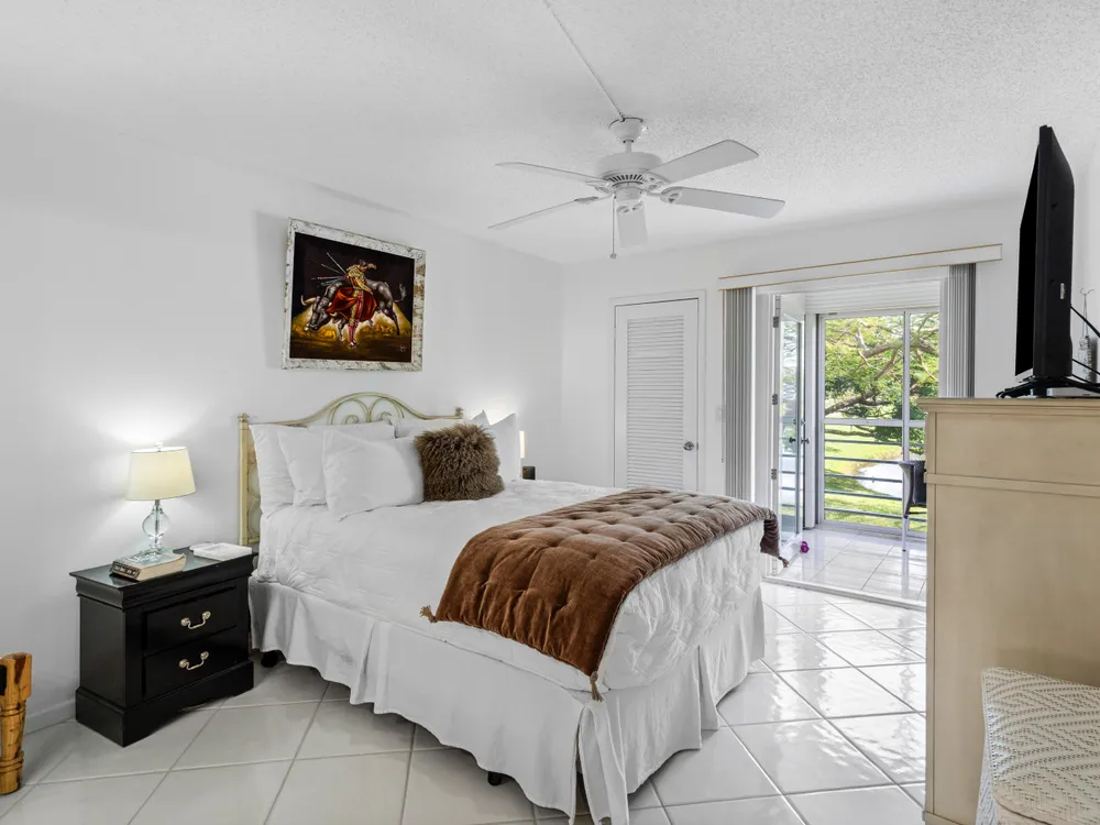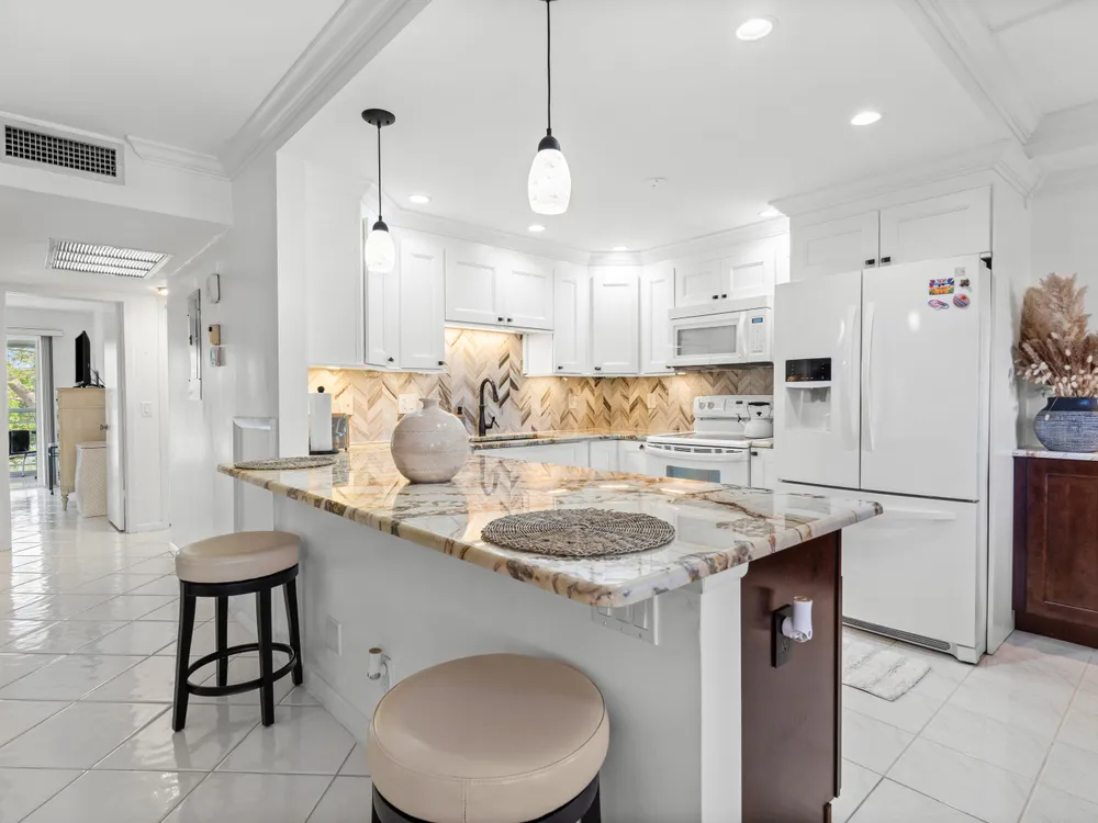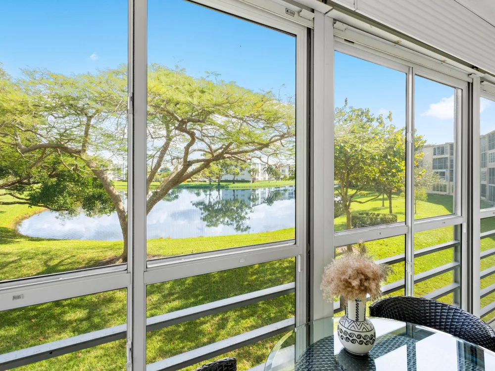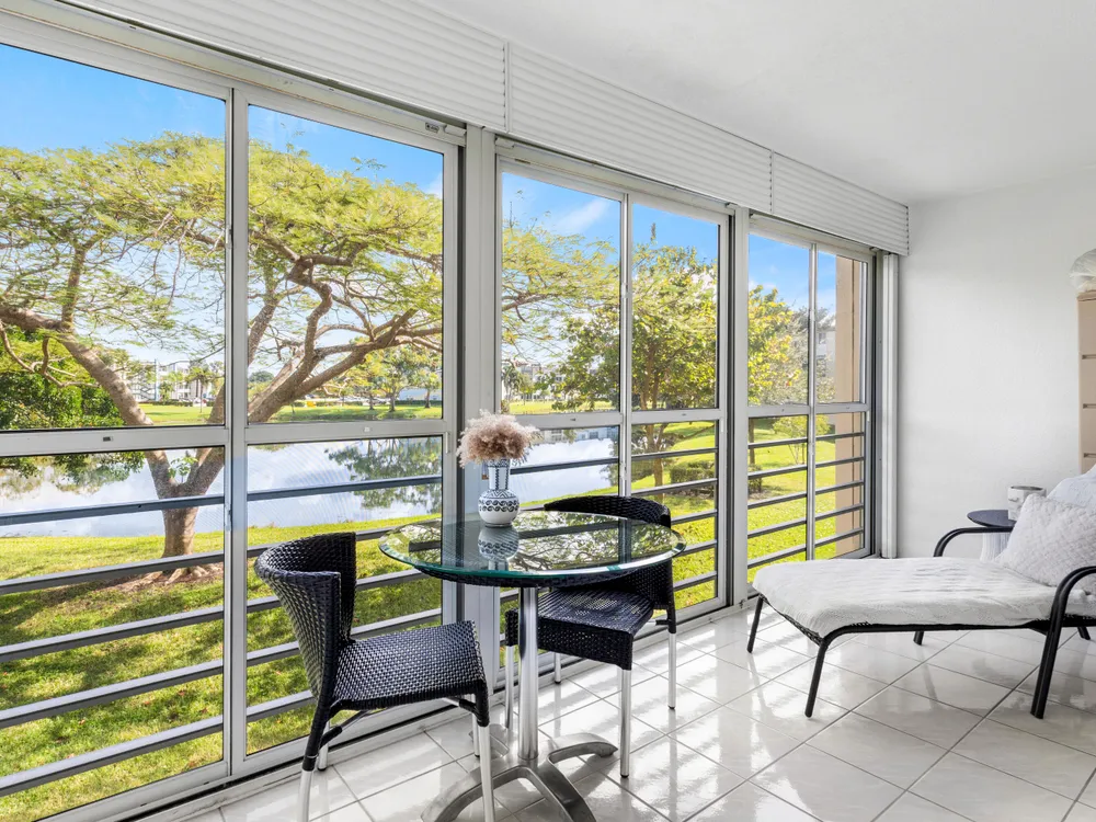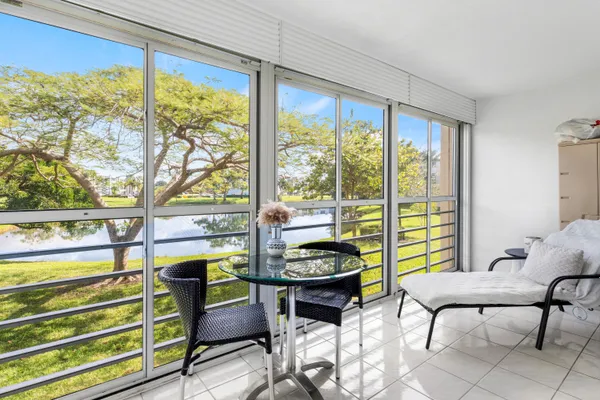 Come preview this custom remodeled two bedroom plus two bath residence with a huge private balcony with direct lake views and roll down shutters. Features include a stunning chef's kitchen with granite countertops, marble tile chevron backsplash, shaker cabinets, upgraded appliances and pendant lights. Primary bedroom features a walk-in closet with an impact glass door leading to the balcony. Updated bathroom with a vessel sink, tile laid on the diagonal, crown molding and plantation shutters complete this home. The Century Village clubhouse boasts a grand theater, fitness center, billiards room and resistance pool. There is never a dull moment in this active community with an endless list of clubs, classes and activities. Outdoor amenities include heated swimming pools and tennis courts.