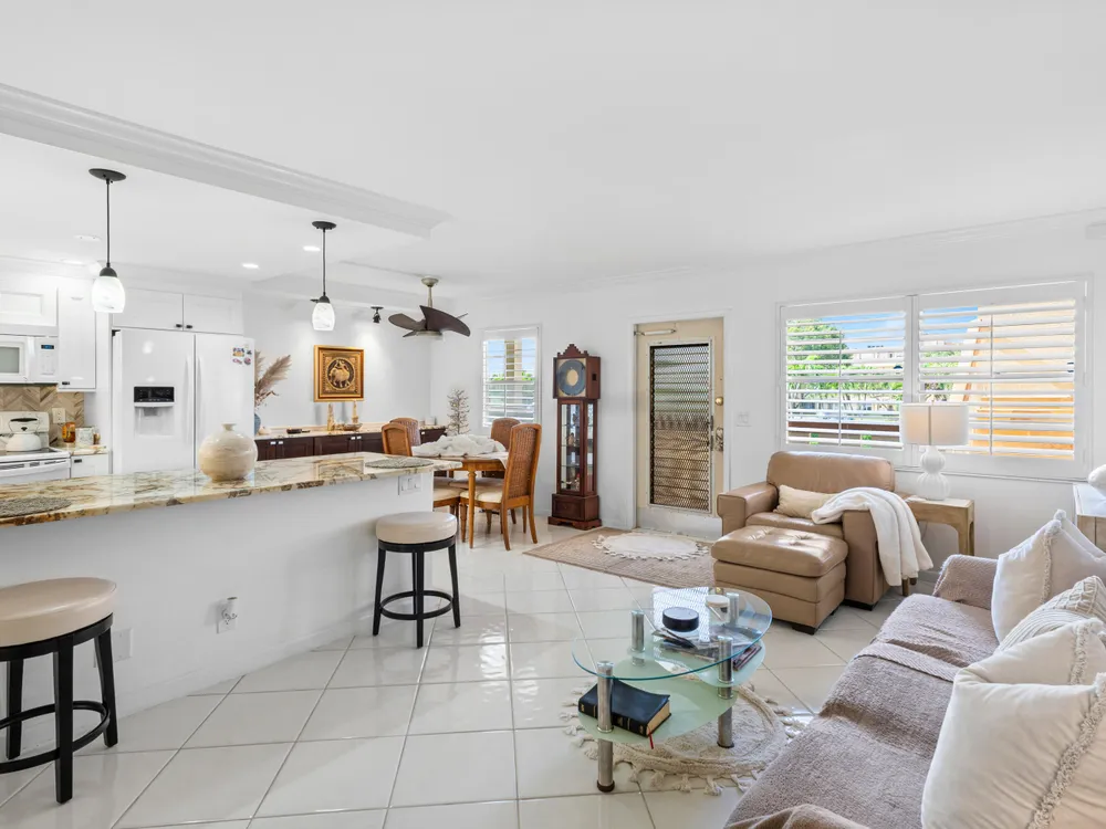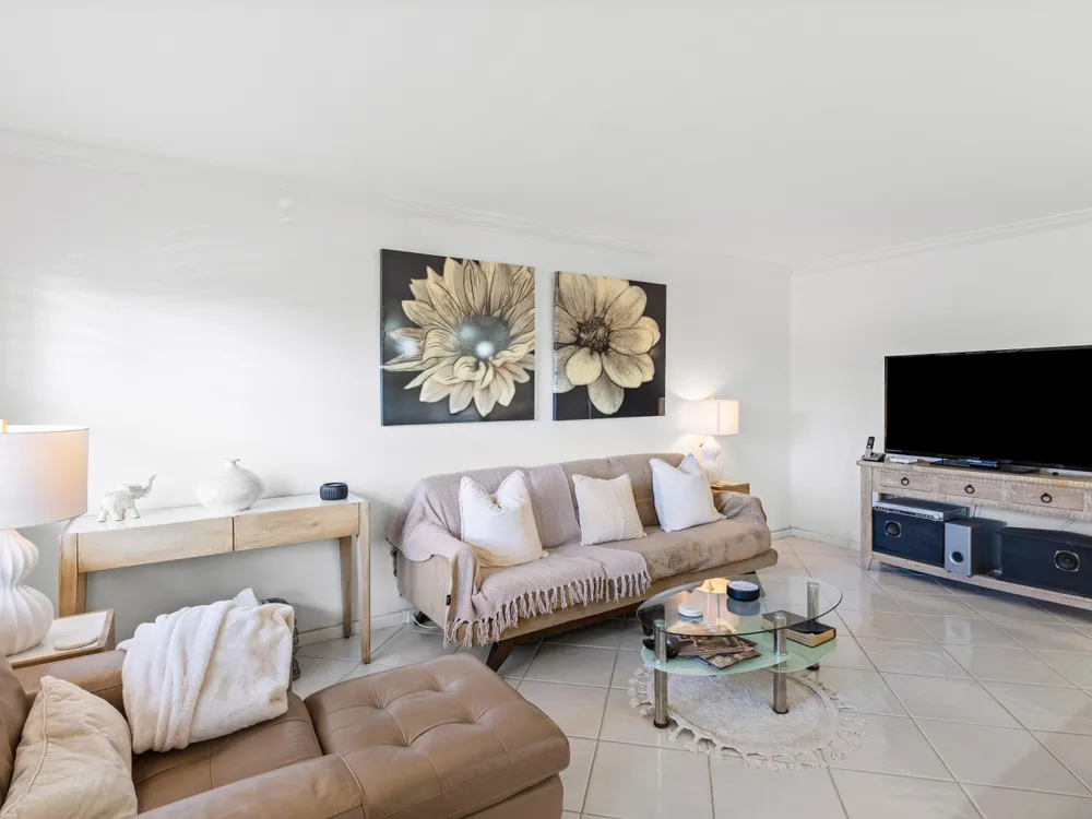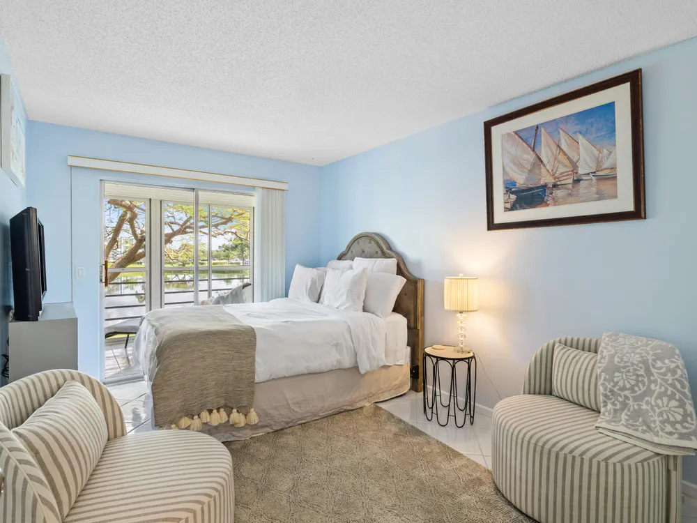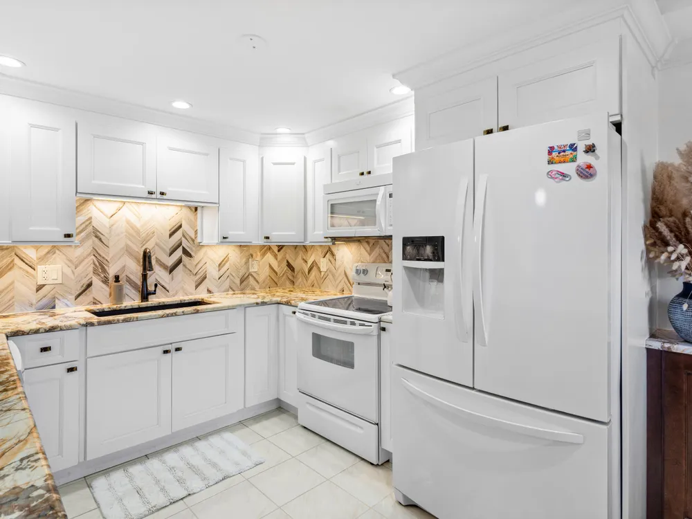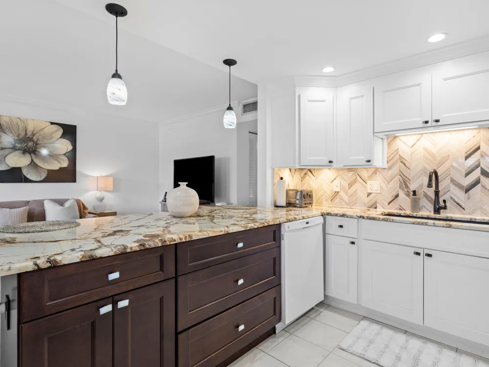 Come preview this custom remodeled two bedroom plus two bath residence with a huge private balcony with direct lake views and roll down shutters. Features include a stunning chef's kitchen with granite countertops, marble tile chevron backsplash, shaker cabinets, upgraded appliances and pendant lights. Primary bedroom features a walk-in closet with an impact glass door leading to the balcony. Updated bathroom with a vessel sink, tile laid on the diagonal, crown molding and plantation shutters complete this home. The Century Village clubhouse boasts a grand theater, fitness center, billiards room and resistance pool. There is never a dull moment in this active community with an endless list of clubs, classes and activities. Outdoor amenities include heated swimming pools and tennis courts.