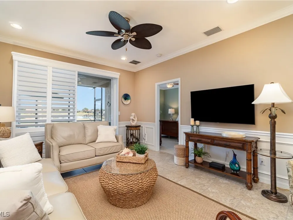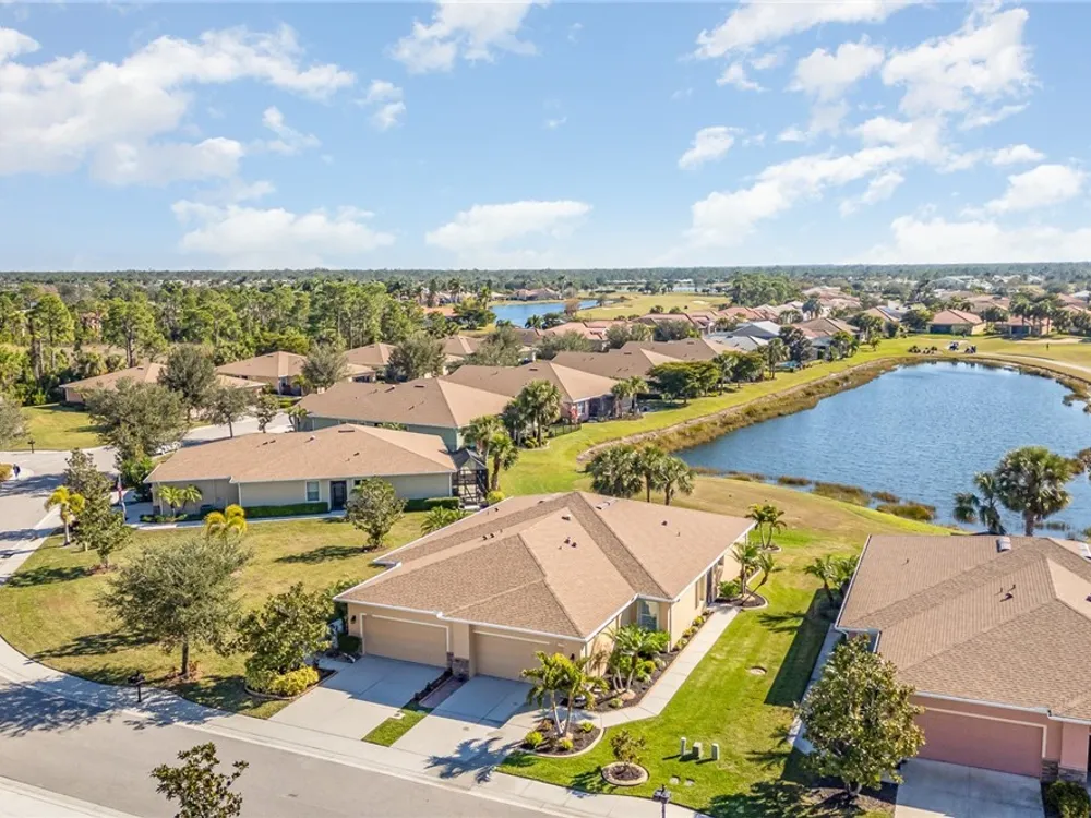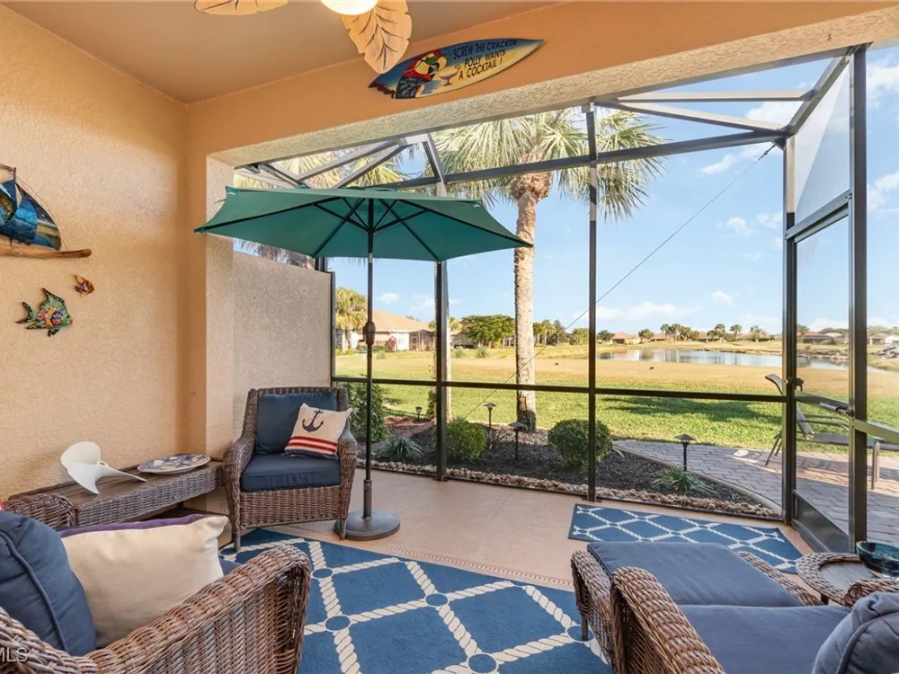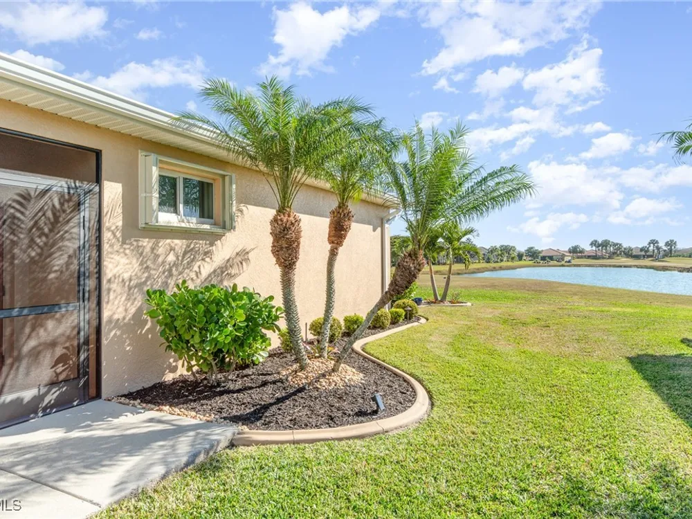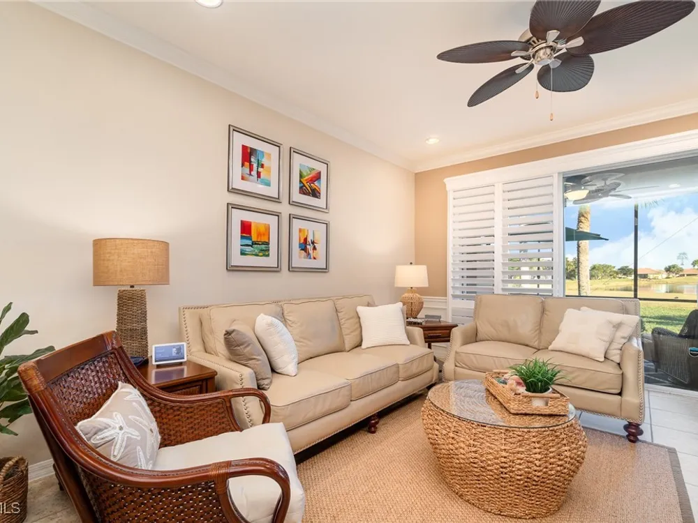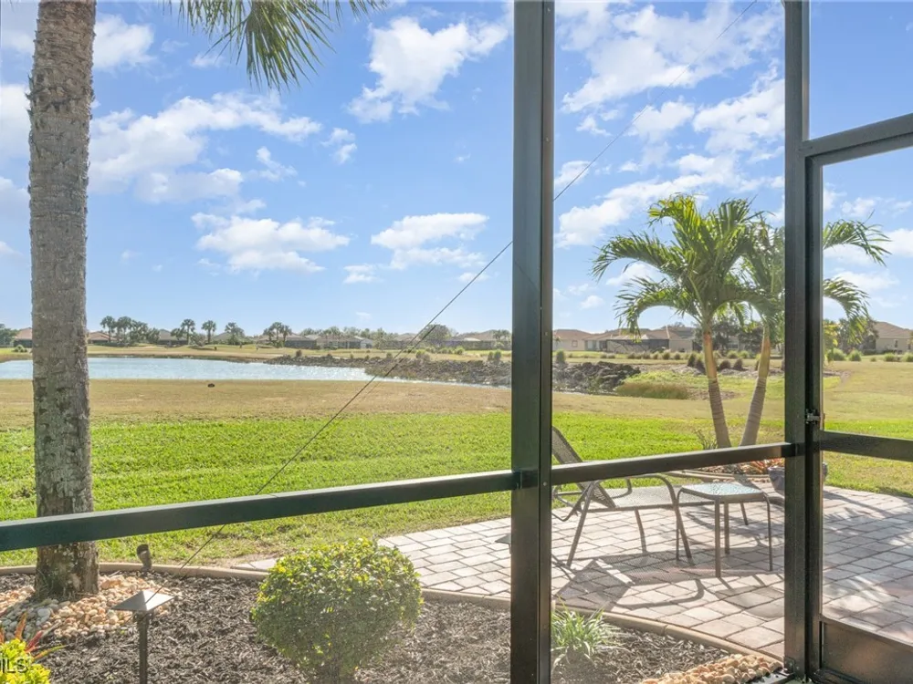 Experience the Lifestyle in this One-of-a-Kind Villa! Unmatched water and golf course views, paired with high-end upgrades, set this stunning villa apart. Designed for the most discerning homeowner, this immaculately upgraded 2-bedroom + den, 2-bath home offers a perfect balance of luxury and comfort that is truly rare to find. Inside, elegant wainscoting, crown molding throughout, and plantation shutters on every window create a refined and timeless aesthetic. New quartz countertops, upgraded appliances, and premium 42” cabinetry enhance both style and functionality. The open-concept design makes entertaining effortless, with clear sightlines from the kitchen to the dining and living areas, creating a seamless flow that extends to the lanai and patio. Whether hosting guests or simply taking in the breathtaking views, this home is designed for connection and relaxation. The den provides a versatile space, ideal for a home office or an additional guest area. The spacious primary suite features two walk-in closets, an ensuite with double vanities, and an abundance of natural light. Step outside to your extended screened-in lanai or unwind on your large outdoor pavered patio, where stunning golf course and water views provide a tranquil retreat. The 2-car garage with lifestyle screen offers extended living space to enjoy the Florida weather and your friends & neighbors. Updated landscaping adds an extra layer of curb appeal, enhancing the home’s beauty and creating a peaceful, park-like atmosphere. Located on a quiet, lightly traveled street in the heart of the community, this villa offers a serene setting with friendly neighbors nearby. Ideal for both seasonal and full-time residents, this villa delivers an elevated lifestyle in a gated community with top-tier amenities. Whether you're looking for a winter escape or year-round resort-style living, this home offers exceptional value, unparalleled views, and premium upgrades. Don’t miss this rare opportunity!