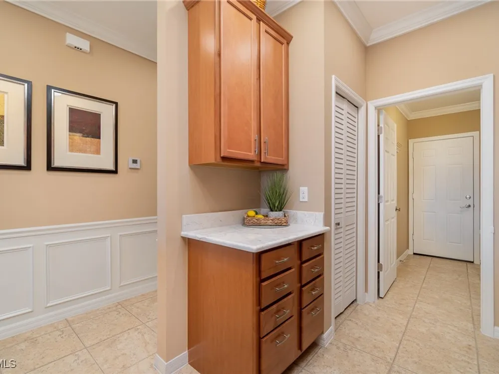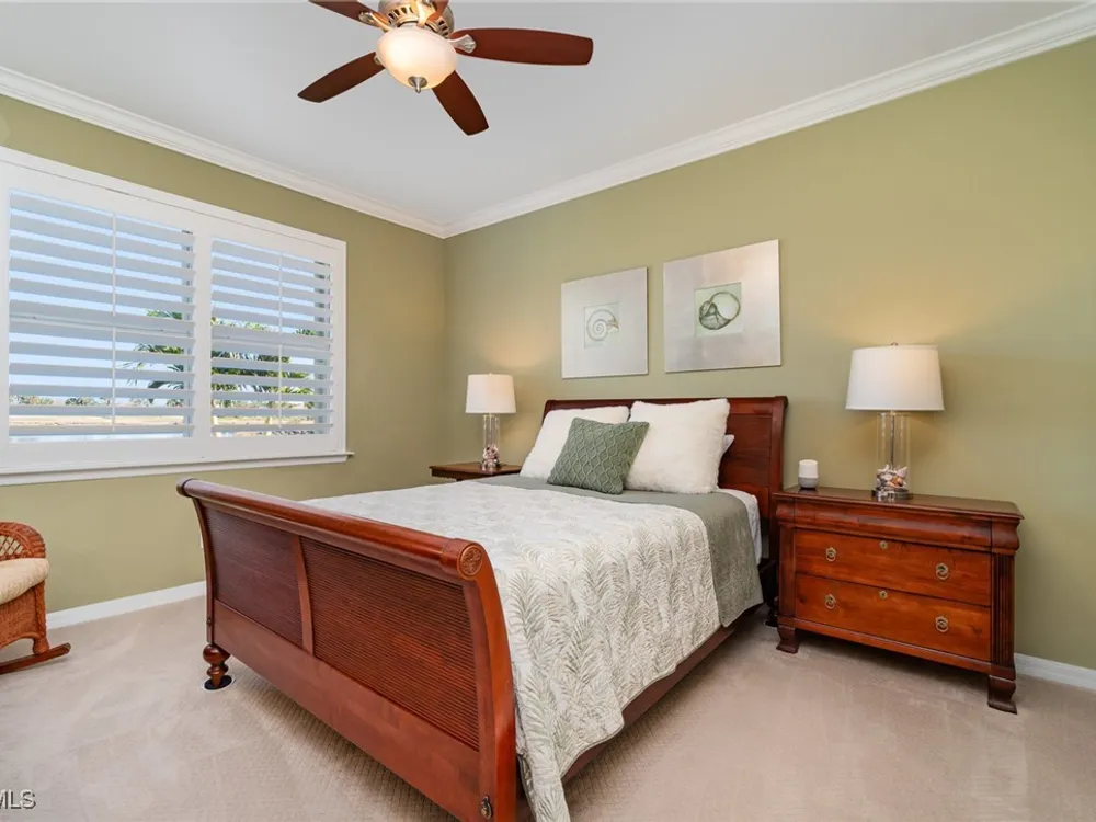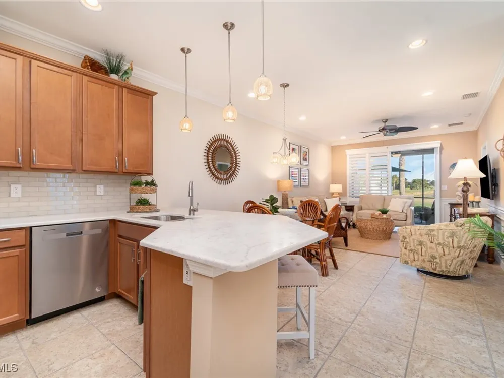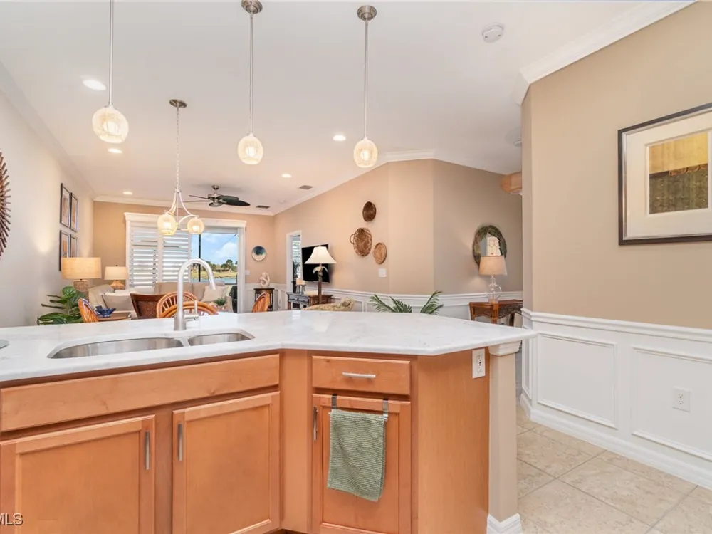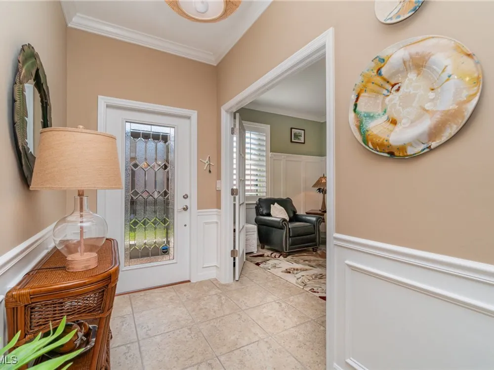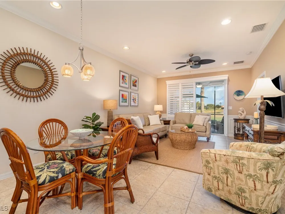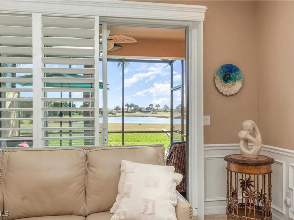 Experience the Lifestyle in this One-of-a-Kind Villa! Unmatched water and golf course views, paired with high-end upgrades, set this stunning villa apart. Designed for the most discerning homeowner, this immaculately upgraded 2-bedroom + den, 2-bath home offers a perfect balance of luxury and comfort that is truly rare to find. Inside, elegant wainscoting, crown molding throughout, and plantation shutters on every window create a refined and timeless aesthetic. New quartz countertops, upgraded appliances, and premium 42” cabinetry enhance both style and functionality. The open-concept design makes entertaining effortless, with clear sightlines from the kitchen to the dining and living areas, creating a seamless flow that extends to the lanai and patio. Whether hosting guests or simply taking in the breathtaking views, this home is designed for connection and relaxation. The den provides a versatile space, ideal for a home office or an additional guest area. The spacious primary suite features two walk-in closets, an ensuite with double vanities, and an abundance of natural light. Step outside to your extended screened-in lanai or unwind on your large outdoor pavered patio, where stunning golf course and water views provide a tranquil retreat. The 2-car garage with lifestyle screen offers extended living space to enjoy the Florida weather and your friends & neighbors. Updated landscaping adds an extra layer of curb appeal, enhancing the home’s beauty and creating a peaceful, park-like atmosphere. Located on a quiet, lightly traveled street in the heart of the community, this villa offers a serene setting with friendly neighbors nearby. Ideal for both seasonal and full-time residents, this villa delivers an elevated lifestyle in a gated community with top-tier amenities. Whether you're looking for a winter escape or year-round resort-style living, this home offers exceptional value, unparalleled views, and premium upgrades. Don’t miss this rare opportunity!
