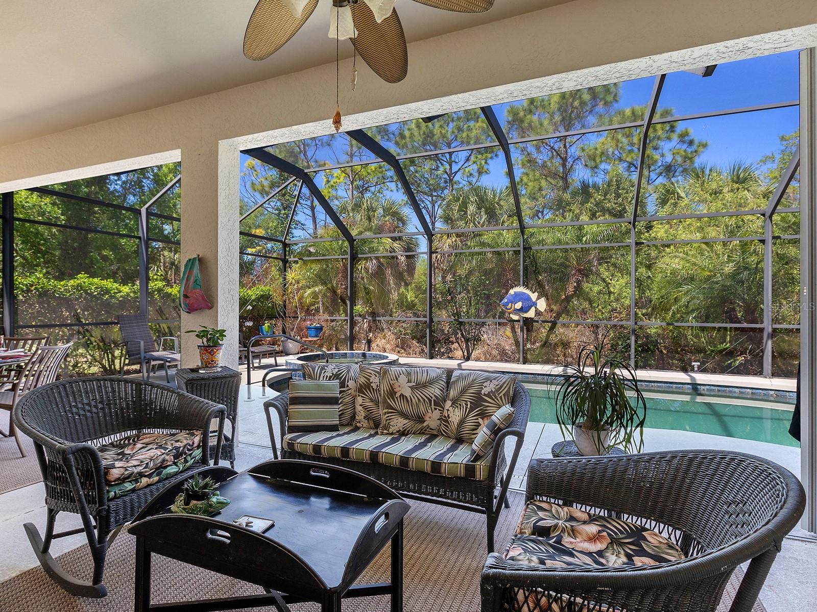 Welcome to Venetian Falls, a highly sought-after active 55+ community where resort-style living meets everyday comfort. Perfectly positioned on a serene preserve lot, this beautifully maintained home offers both privacy and picturesque views. Featuring the popular Florence floor plan, this residence includes two spacious bedrooms, two bathrooms, plus a versatile den—ideal for a home office or guest space. Tile flooring flows throughout the home, providing a seamless look that’s both stylish and easy to maintain—perfect for Florida living. The open-concept layout is enhanced by elegant crown and chair rail moldings, creating a refined yet inviting atmosphere throughout the main living areas. The updated primary bathroom provides a modern retreat, while the home’s thoughtful design ensures both comfort and functionality. Step outside to your PRIVATE swimming pool, perfect for relaxing or entertaining year-round in the Florida sunshine. A BRAND-NEW ROOF installed in 2026 comes with a transferable warranty, offering peace of mind for years to come. Additional updates include accordion shutters on all windows and doors, HVAC 2024, water heater 2023, washer 2026, surround sound, and GE kitchen appliances 2021. Venetian Falls is known for its exceptional amenities, including a gated entrance, maintenance-free lawn care, resort-style swimming pool and separate lap pool, a state-of-the-art fitness center, internet café, an arts and crafts room, and an active lifestyle program led by a dedicated activity director. Residents also enjoy on-site management. No CDD fees. Experience the perfect blend of active living, luxury, and community in Venetian Falls—your ideal place to call home. Conveniently located near Venice beaches, shopping, dining, and the Venice Theatre and Art Center.