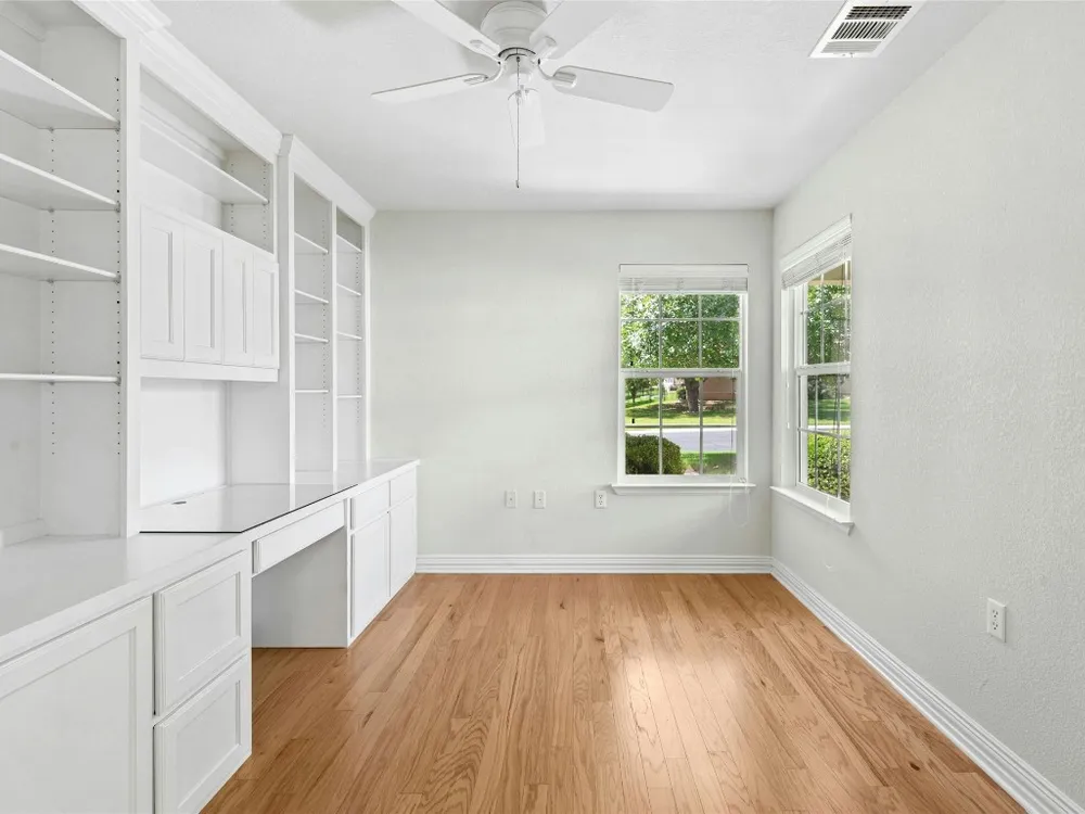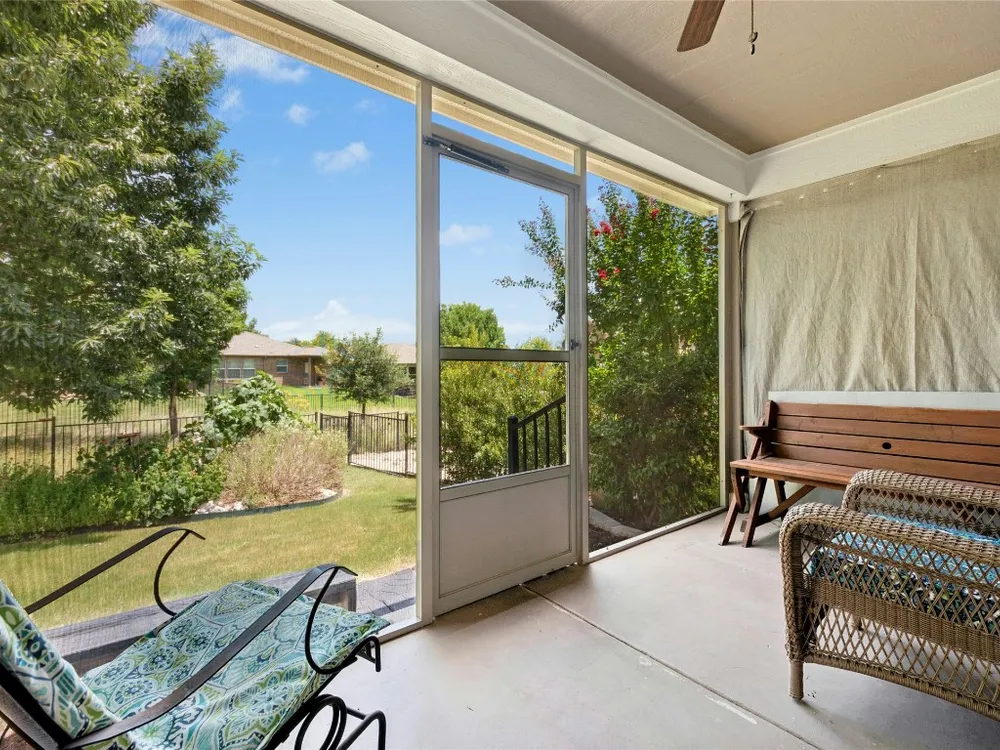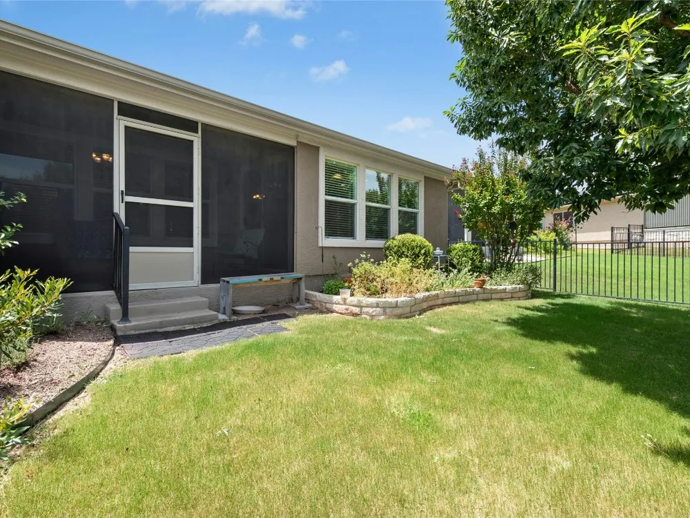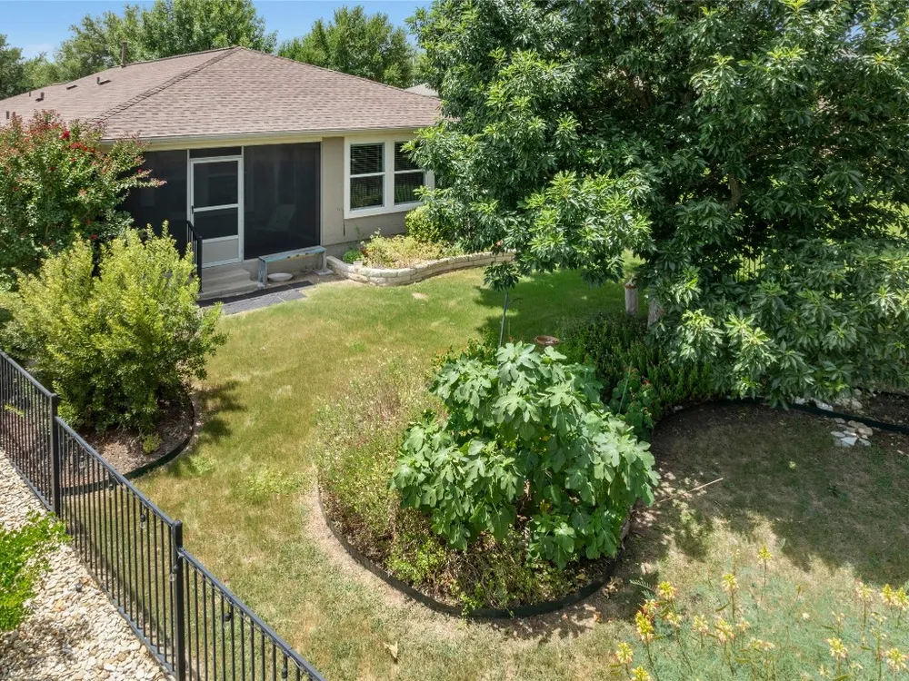 This well-maintained Pine Spring floor plan offers serene backyard greenery and a thoughtfully designed layout. Hardwood flooring extends throughout the living room, both bedrooms, and the office—completely carpet-free for easy maintenance. The kitchen features granite countertops, pull-out cabinet trays, a gas range, and black appliances with a charming breakfast area that overlooks the backyard and adjacent greenspace. Tray ceilings in both the living room and primary bedroom add spaciousness. A versatile office, hobby room or third bedroom is accessed through double doors and includes built-in desk space and display shelving. Enjoy outdoor living on the covered, screened-in back porch, which faces north and backs to a natural ribbon greenbelt for added privacy and views. The garage is particularly functional, featuring floor-to-ceiling built-in storage along with overhead hanging racks for organization. 2020 Roof. 2017 Navien Tankless Water Heater. 2011 Lennox A/C.