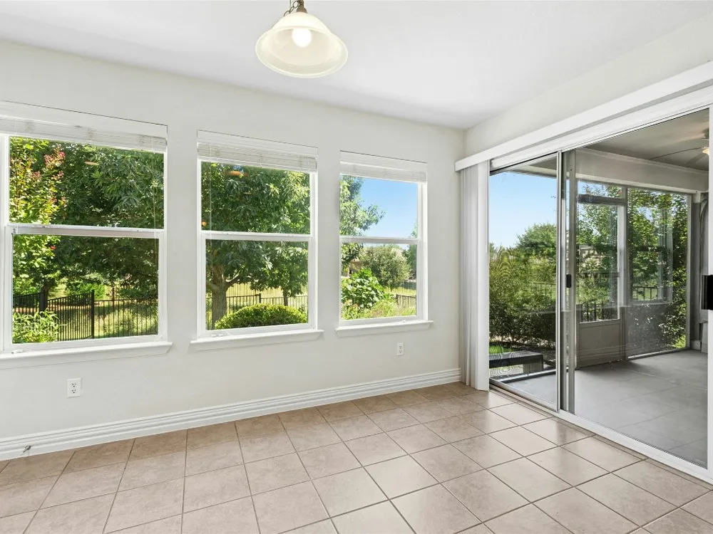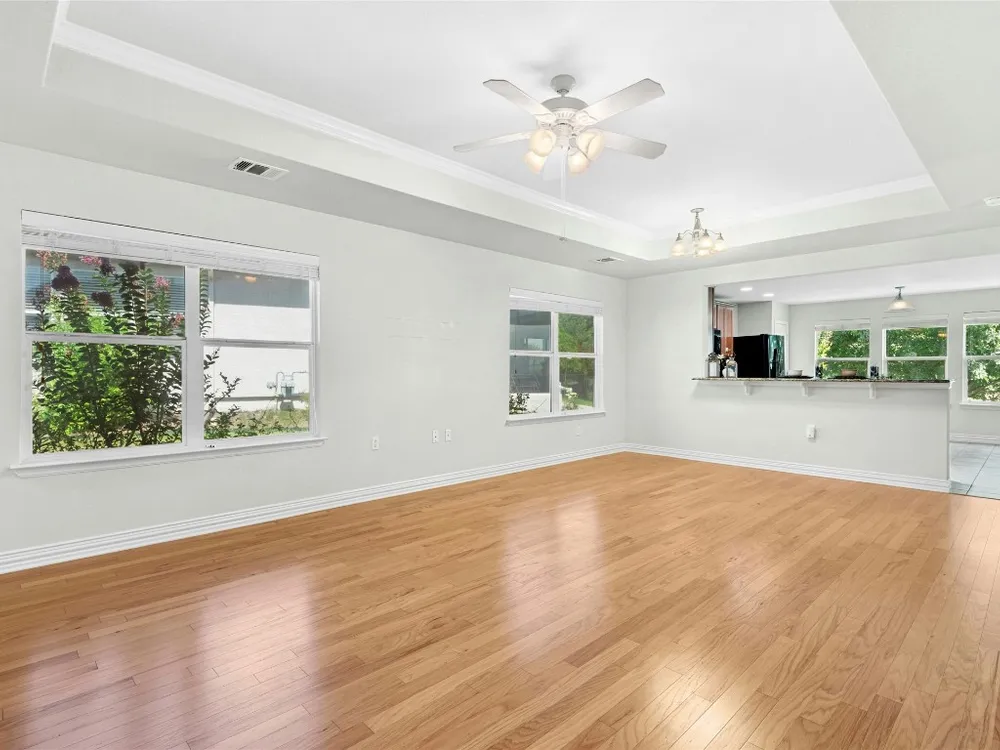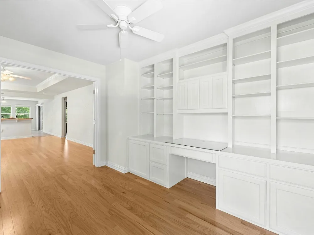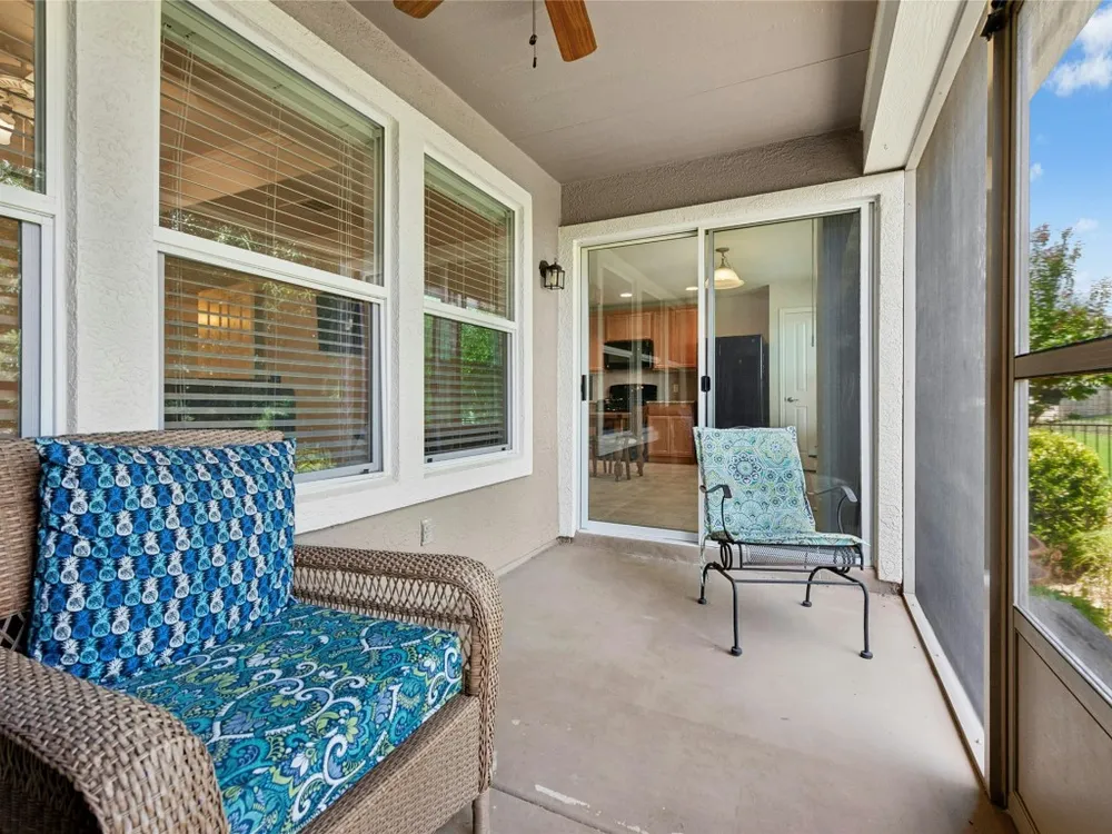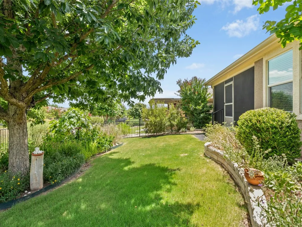 This well-maintained Pine Spring floor plan offers serene backyard greenery and a thoughtfully designed layout. Hardwood flooring extends throughout the living room, both bedrooms, and the office—completely carpet-free for easy maintenance. The kitchen features granite countertops, pull-out cabinet trays, a gas range, and black appliances with a charming breakfast area that overlooks the backyard and adjacent greenspace. Tray ceilings in both the living room and primary bedroom add spaciousness. A versatile office, hobby room or third bedroom is accessed through double doors and includes built-in desk space and display shelving. Enjoy outdoor living on the covered, screened-in back porch, which faces north and backs to a natural ribbon greenbelt for added privacy and views. The garage is particularly functional, featuring floor-to-ceiling built-in storage along with overhead hanging racks for organization. 2020 Roof. 2017 Navien Tankless Water Heater. 2011 Lennox A/C.