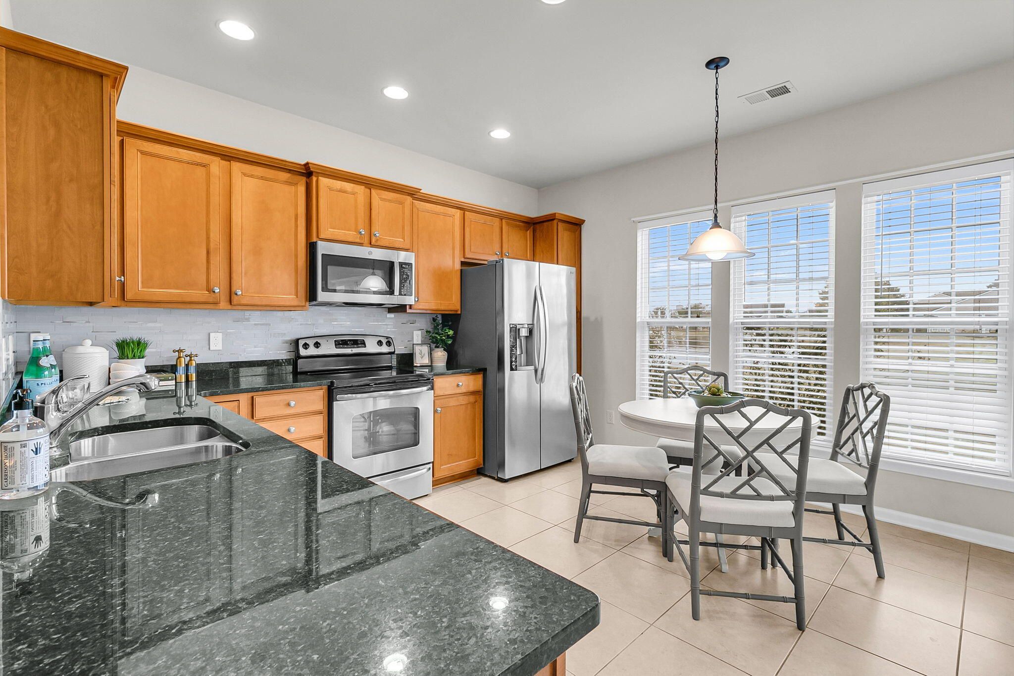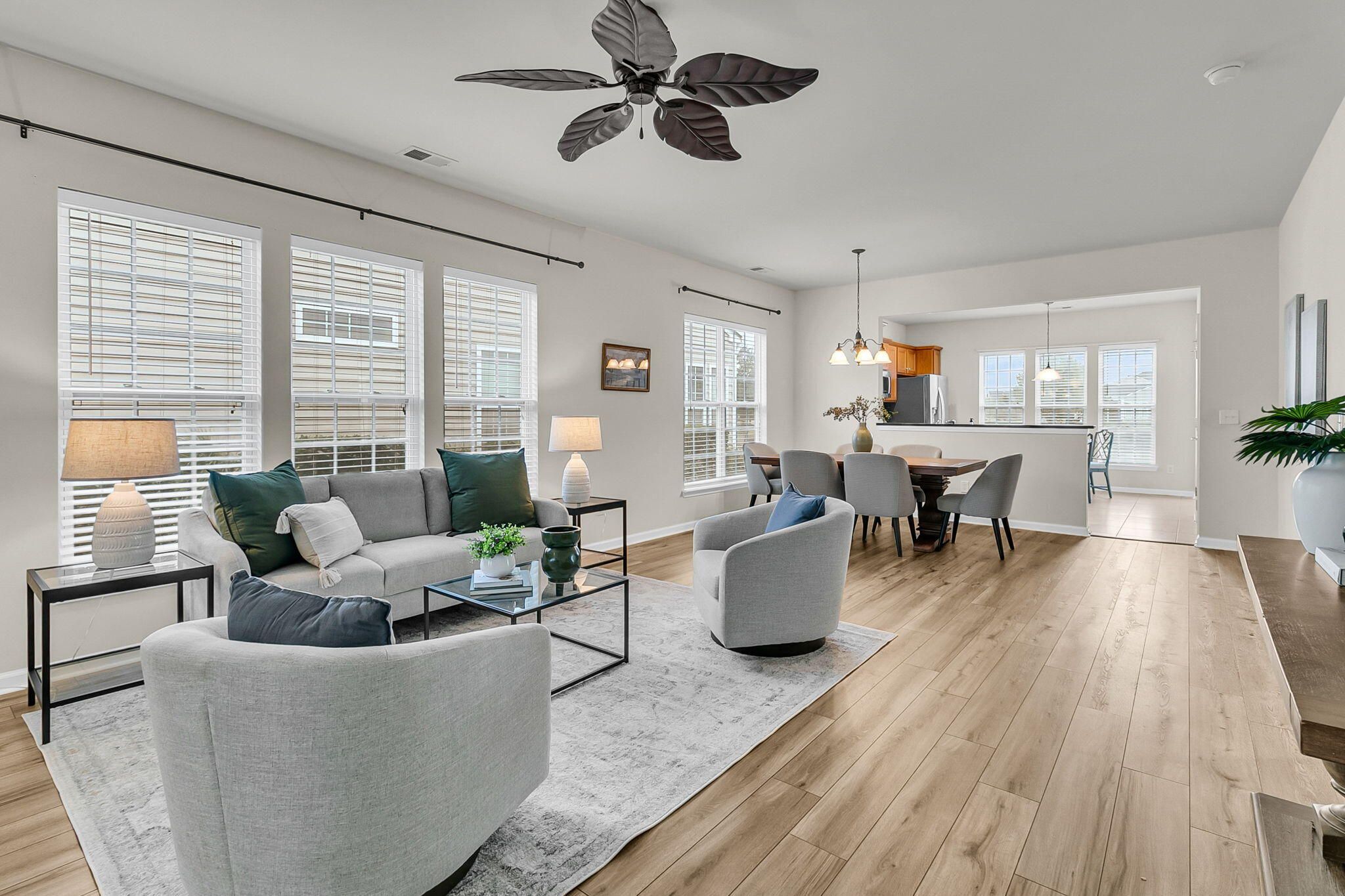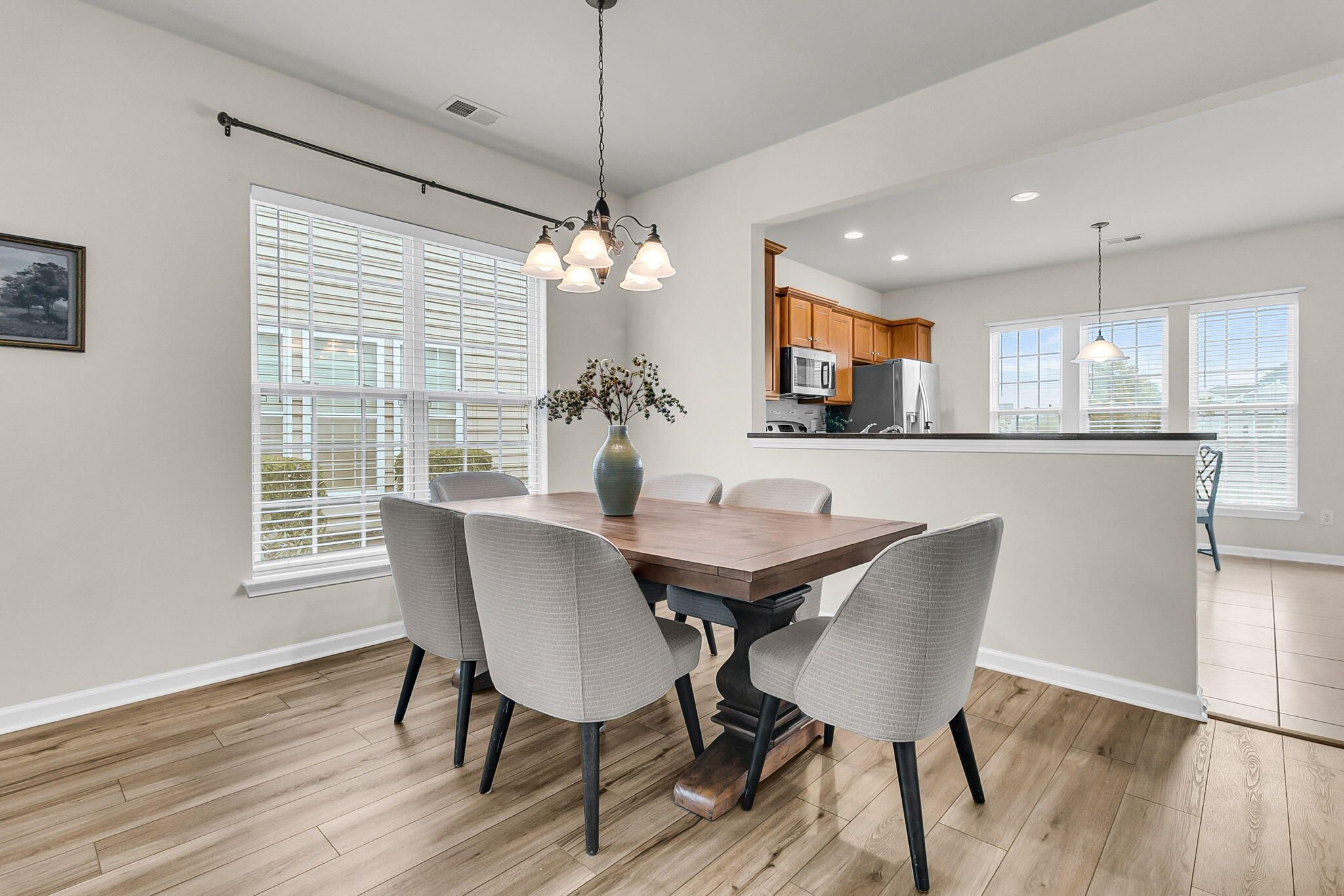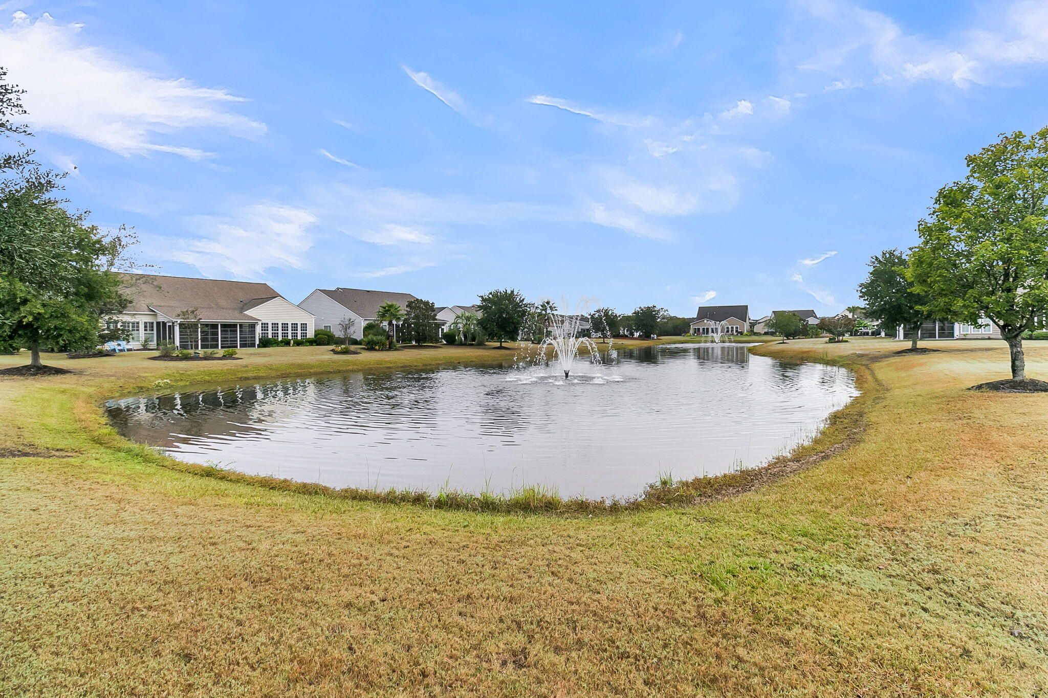 Popular Pine Spring model in Charleston's Active Adult community, Del Webb Cane Bay! This home features 3 bedrooms, 2 baths, sunroom, and patio on a tranquil lagoon homesite! As you walk in you're greeted by tile in the foyer and Luxury Vinyl Plank flooring that carries throughout the main living areas, den/office, and bedrooms. Just off the foyer, you will find a flex space with glass French doors and charming bay window that could be used as a den, office, or 3rd bedroom. Open-concept living with combined great room and dining room. Fully equipped kitchen featuring Maple cabinets, granite countertops, stainless steel appliances, and glass tile backsplash. Entertaining made easy with the kitchen overlooking the great room/dining room combination and also flowing into the sunroom. From..there, two sliding glass doors take you outside to a exterior patio with beautiful lagoon view. The primary suite is tucked in the back corner of the home and is complete with dual sinks, walk-in shower, tile floors, and a large walk-in closet. The second bedroom and bath are off a separate hallway, offering guests plenty of privacy. Don't miss out on this opportunity to own in Del Webb Cane Bay, Charleston's premier Active Adult community with incredible amenities, over 150 established clubs and activity groups within golf cart distance to shopping and restaurants, you'll have everything you're looking for in this established lifestyle community. Please book your showing today!