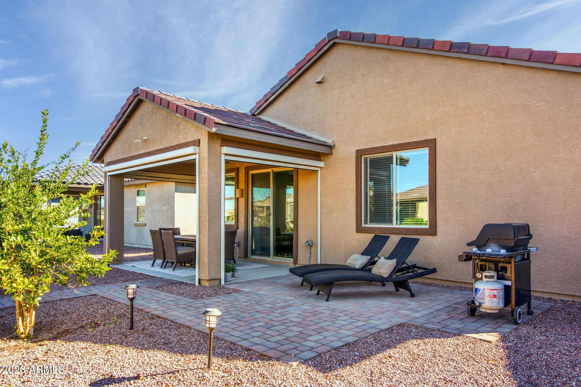 BETTER THAN NEW!! In like new condition with so many upgrades! Beautiful high end front security screen door that allows natural light and gentle breezes. Automatic sun shades on back patio that keep things cool in the summer and yet offer a cozy outdoor room in the cooler months. Professionally landscaped back yard with paver seating area, accent lighting and sidewalk to walk path. High end ceiling fans in living areas and bedrooms. Kitchen features staggered cabinets, beautiful granite countertops and RO water to both refrigerator and spigot at kitchen sink. Soft water tank is owned and already in place. Cozy front seating area perfect for taking in the morning sunrises and back patio offers gorgeous sunsets! Sun screens for all windows (currently stored in garage). Beautiful neutral designer pallet will work with any decor. This home is truly move-in ready w/ thousands in upgrades! Some furniture available on separate bill of sale. Province is an award-winning 55+ Active Adult Community with lakes and greenbelts! The values here are incredible compared to other 55+ communities. Province has a resort-style pool, over 25 miles of walking paths, catch and release fishing, 9 pickleballs courts, tennis, bocce ball, putting green, 32,000 sf clubhouse with fitness center, library, billiards, crafts, sewing, media center, town hall with dances and entertainment! So much fun! We're livin' the dream! Retire like you mean it!
