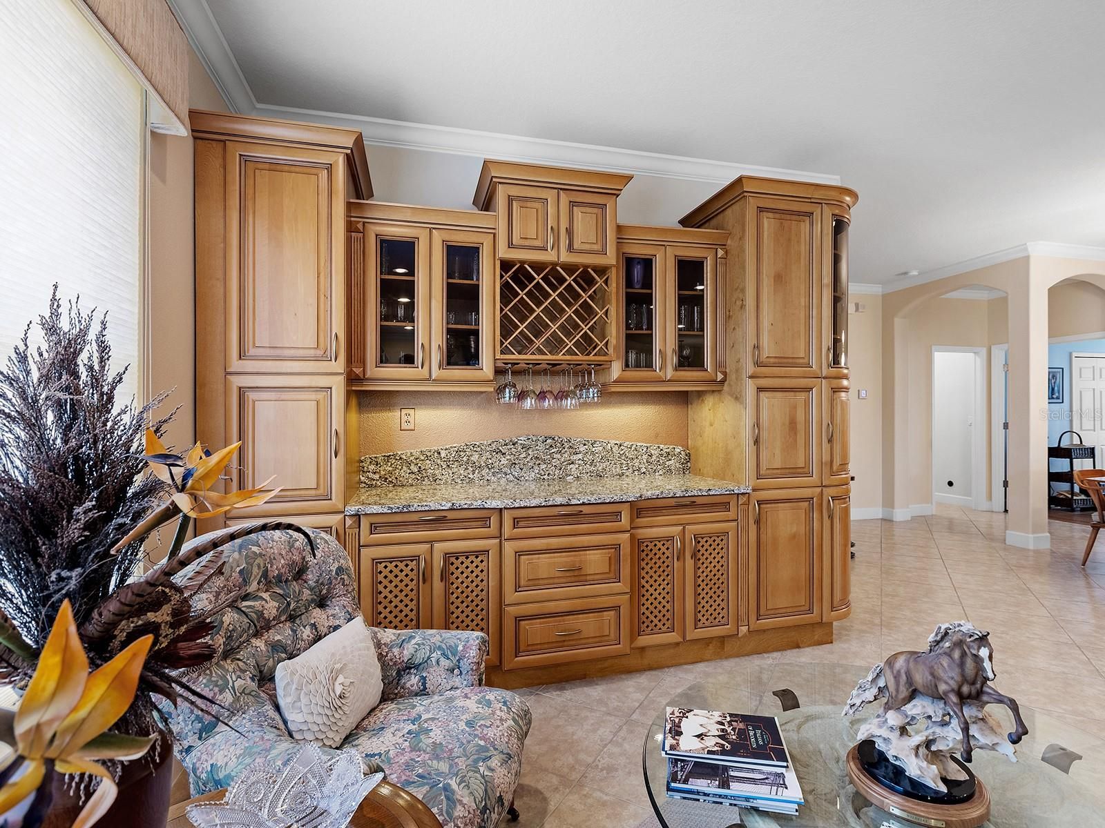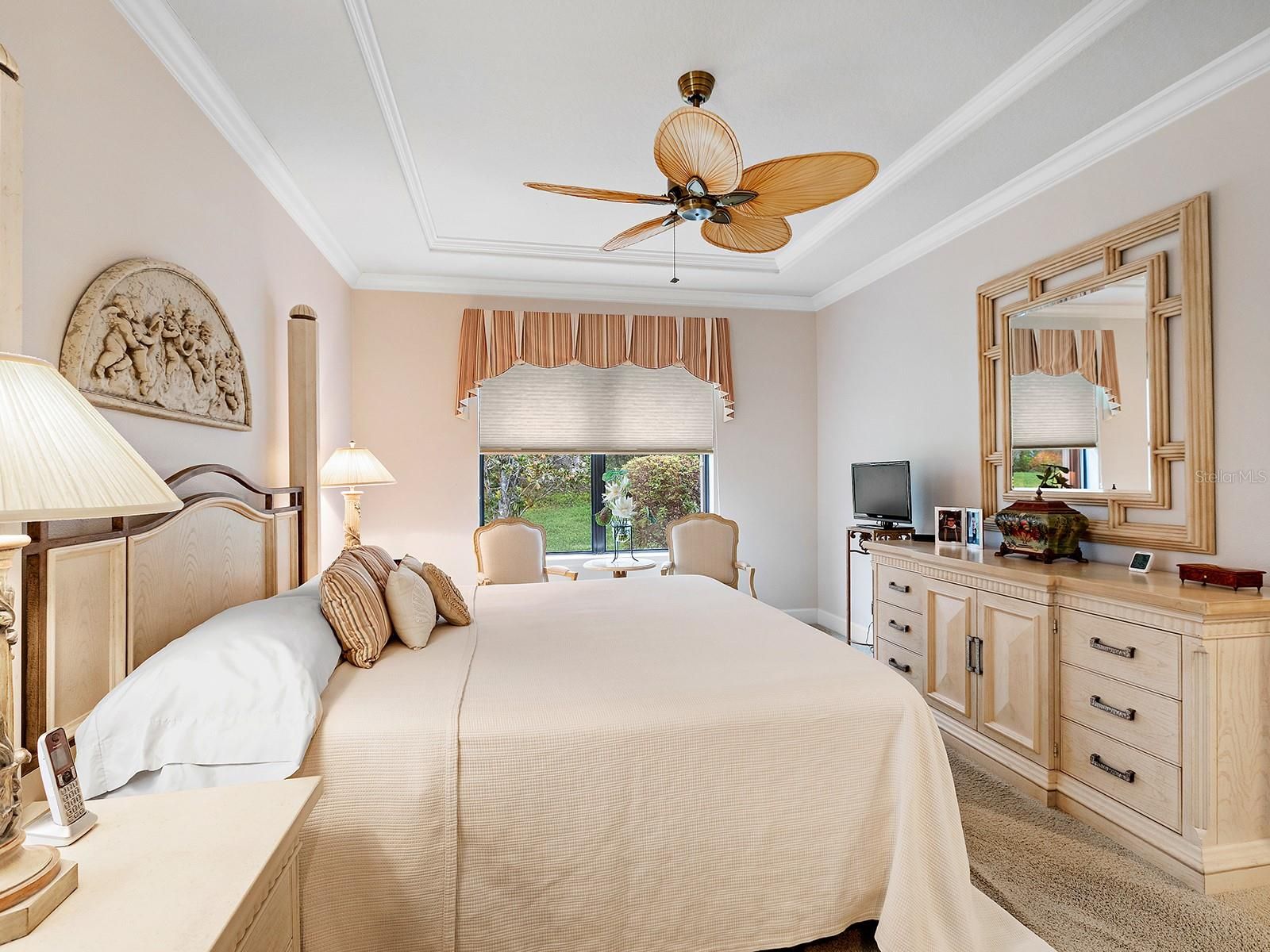 - Built-in Features, Ceiling Fan(s), Crown Molding, Eat-in Kitchen, High Ceilings, Open Floorplan, Solid-Wood Cabinets, Split Bedrooms, Stone Counters, Walk-In Closet(s), Window Treatments