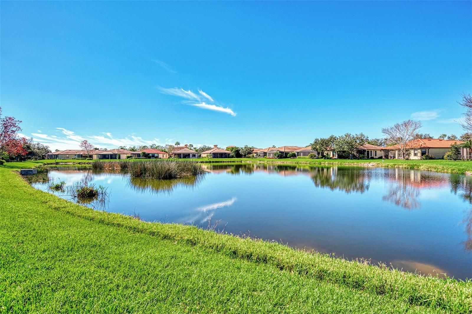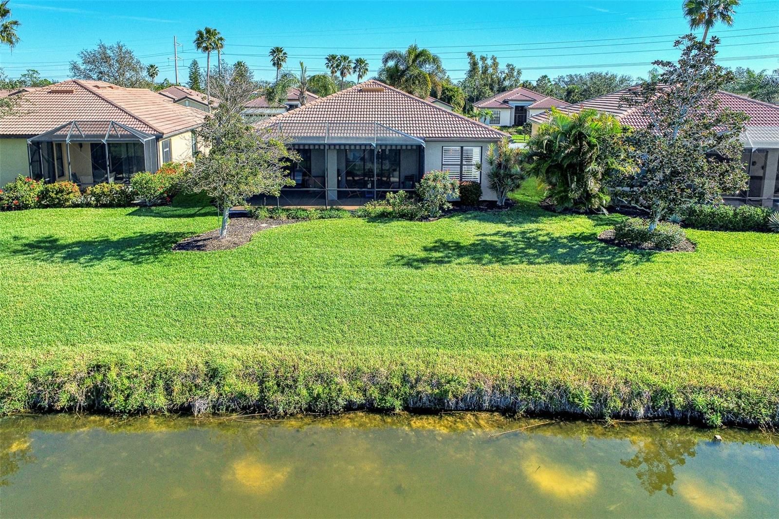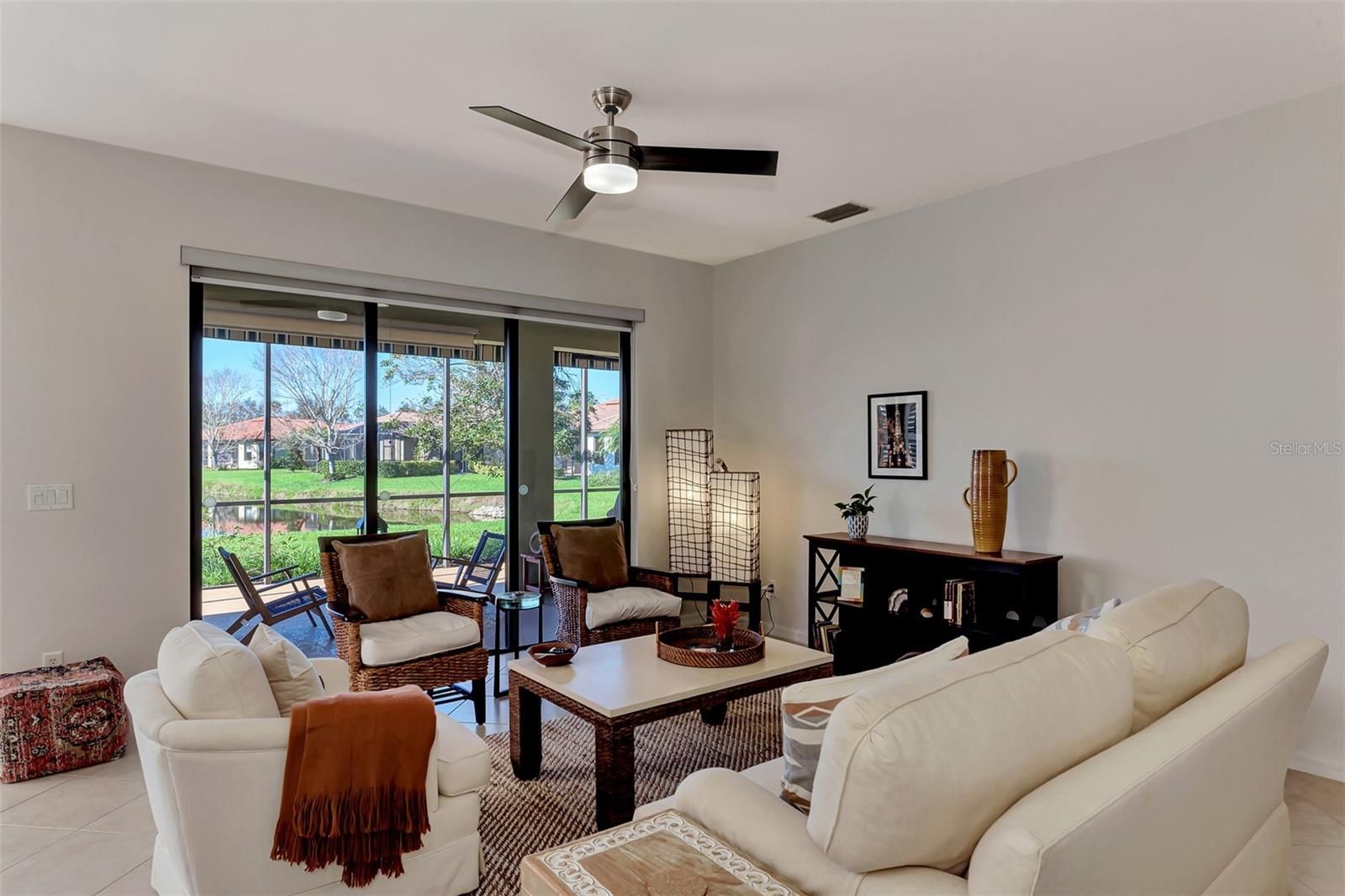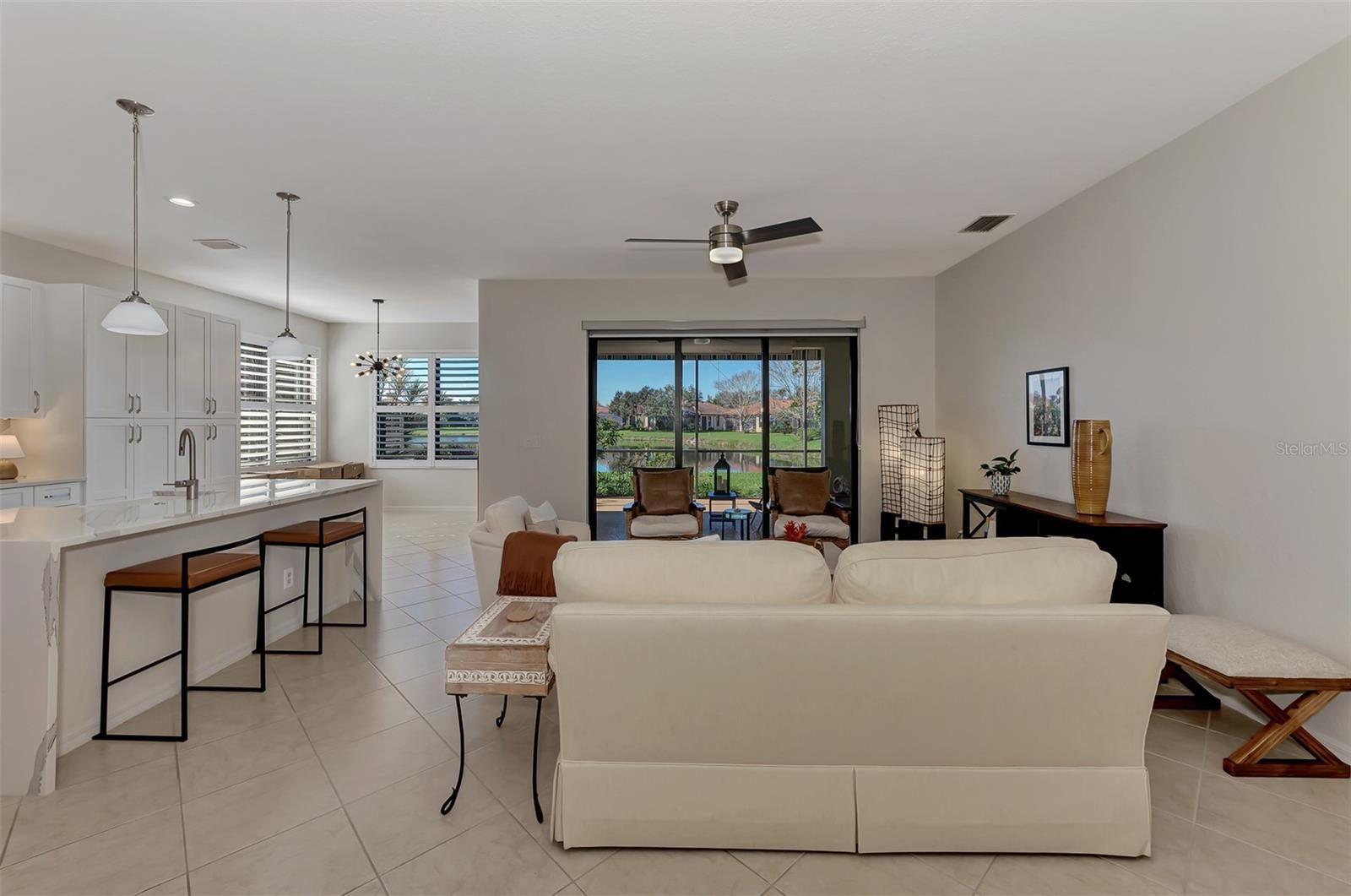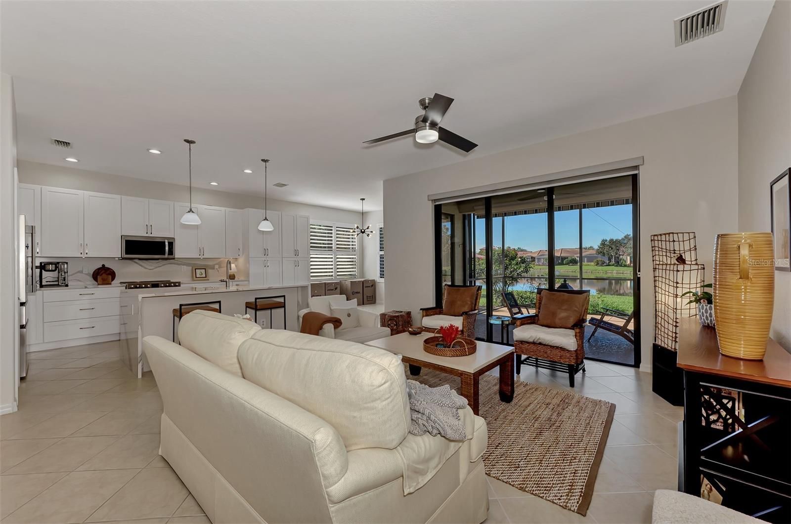 Dramatic New Price Alert ! Discover lakeside living at its finest in this stunning Florence model home, nestled in the sought-after 55+ gated community of Venetian Falls! This impeccably maintained 2-bedroom, 2-bathroom residence, with a versatile office/den, offers 1,916 sq. ft. of bright, open living space designed for comfort and elegance. Built in 2006, this home boasts modern upgrades and timeless charm, perfect for those seeking a vibrant yet serene lifestyle. Step inside to a light-filled interior with no carpets—just beautiful tile flooring throughout the main areas. The dream kitchen is a chef’s delight, featuring a quartz waterfall-edge island, high-end appliances, and custom cabinetry, ideal for entertaining or everyday meals. The open-concept living area flows seamlessly to an extended lanai with automatic awnings, offering breathtaking lake views and the perfect spot for morning coffee or evening sunsets. The primary suite is a true retreat, complete with custom closets and an upgraded spa-inspired bathroom. Additional highlights include built-in shelving in the office, custom window treatments, plantation shutters, and stylish custom fans and lighting throughout. Sliders at the back of the home enhance the indoor-outdoor connection, inviting you to enjoy the tranquil waterfront setting. This home also features a two-car garage, low HOA fees (with no CDD fees), and includes landscaping, basic cable, and high-speed internet for effortless living. The vibrant Venetian Falls community, with 700 homes, offers a nearby clubhouse, on-site management, and a host of amenities to enjoy an active and social lifestyle. Don’t miss your chance to own this move-in-ready masterpiece in a premier 55+ community, where lakefront luxury meets modern convenience. Schedule your private tour today and make this dream home yours!