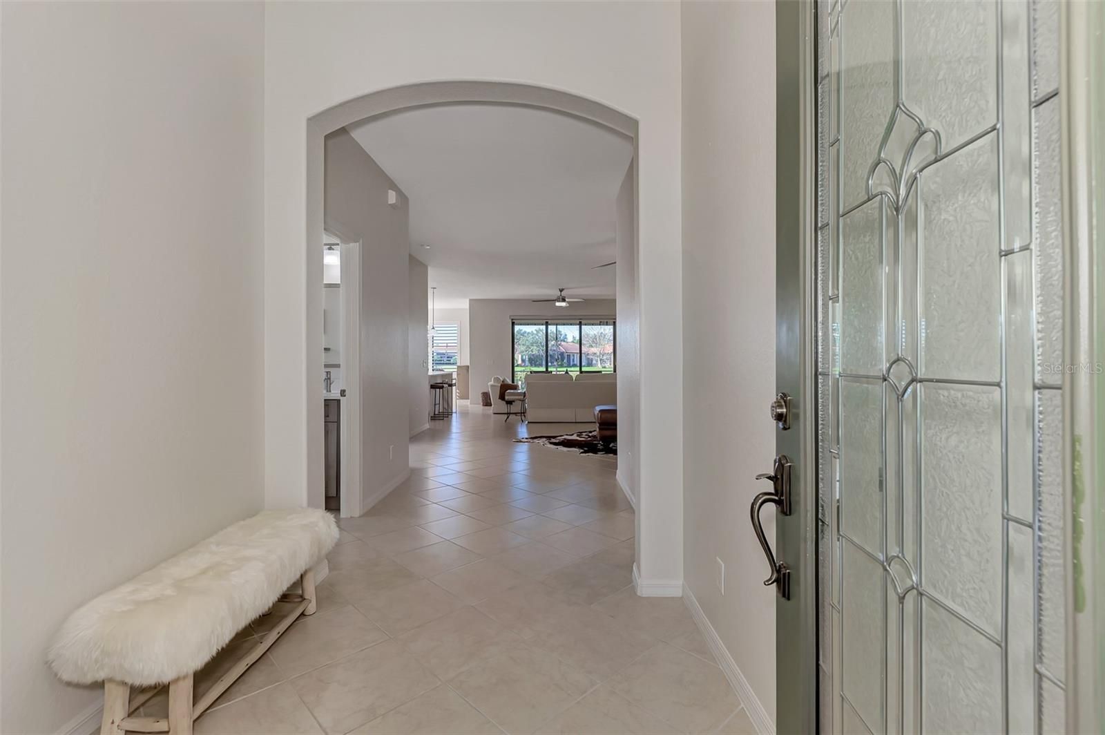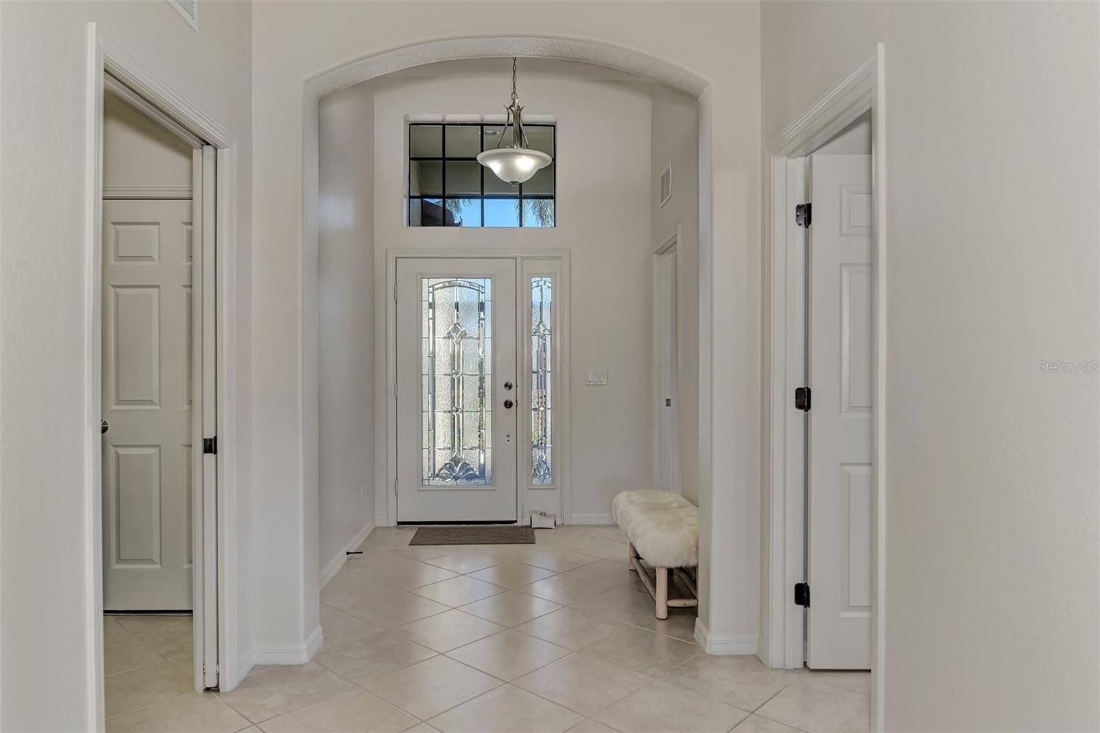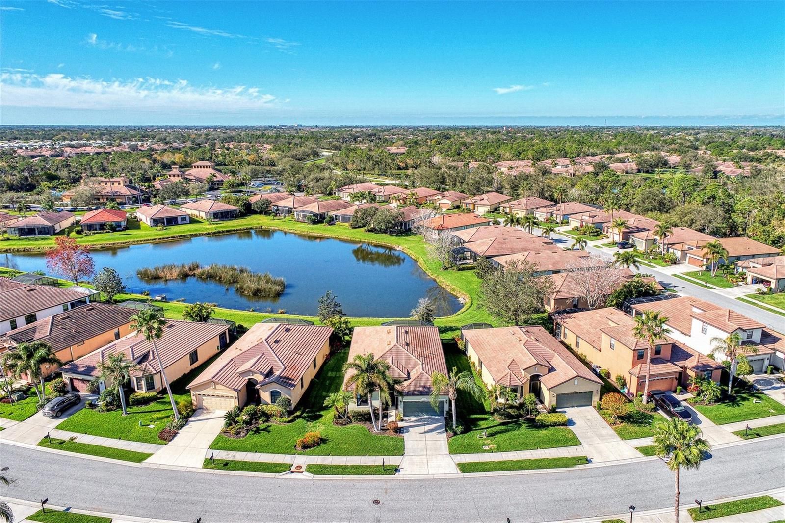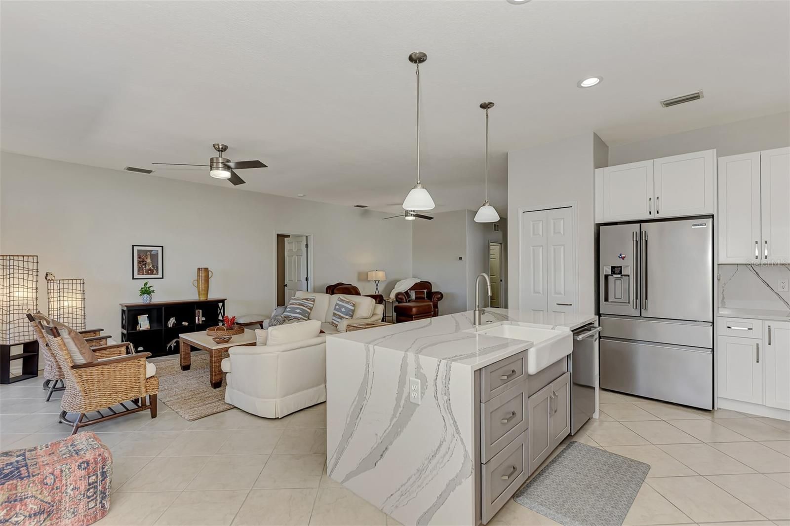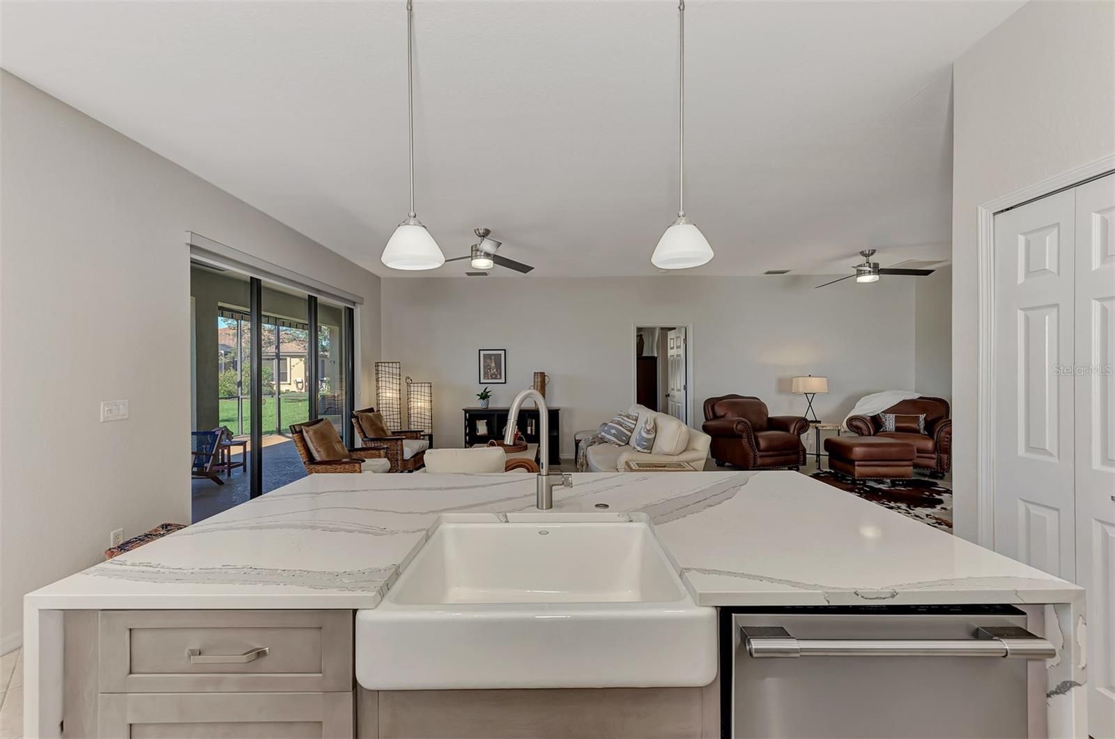 Dramatic New Price Alert ! Discover lakeside living at its finest in this stunning Florence model home, nestled in the sought-after 55+ gated community of Venetian Falls! This impeccably maintained 2-bedroom, 2-bathroom residence, with a versatile office/den, offers 1,916 sq. ft. of bright, open living space designed for comfort and elegance. Built in 2006, this home boasts modern upgrades and timeless charm, perfect for those seeking a vibrant yet serene lifestyle. Step inside to a light-filled interior with no carpets—just beautiful tile flooring throughout the main areas. The dream kitchen is a chef’s delight, featuring a quartz waterfall-edge island, high-end appliances, and custom cabinetry, ideal for entertaining or everyday meals. The open-concept living area flows seamlessly to an extended lanai with automatic awnings, offering breathtaking lake views and the perfect spot for morning coffee or evening sunsets. The primary suite is a true retreat, complete with custom closets and an upgraded spa-inspired bathroom. Additional highlights include built-in shelving in the office, custom window treatments, plantation shutters, and stylish custom fans and lighting throughout. Sliders at the back of the home enhance the indoor-outdoor connection, inviting you to enjoy the tranquil waterfront setting. This home also features a two-car garage, low HOA fees (with no CDD fees), and includes landscaping, basic cable, and high-speed internet for effortless living. The vibrant Venetian Falls community, with 700 homes, offers a nearby clubhouse, on-site management, and a host of amenities to enjoy an active and social lifestyle. Don’t miss your chance to own this move-in-ready masterpiece in a premier 55+ community, where lakefront luxury meets modern convenience. Schedule your private tour today and make this dream home yours!