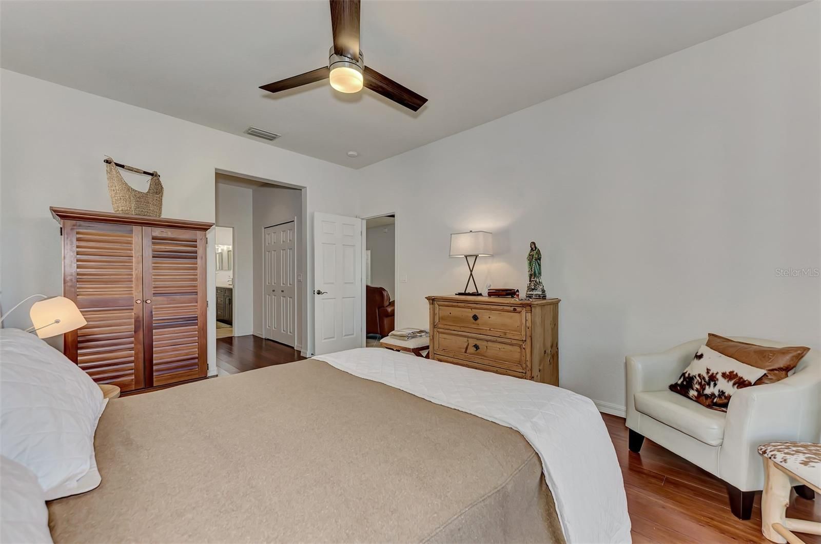 - Ceiling Fan(s), In-Wall Pest Control, Living/Dining Room, Open Floorplan, Main Level Primary, Solid-Wood Cabinets, Stone Counters, Walk-In Closet(s), Window Treatments