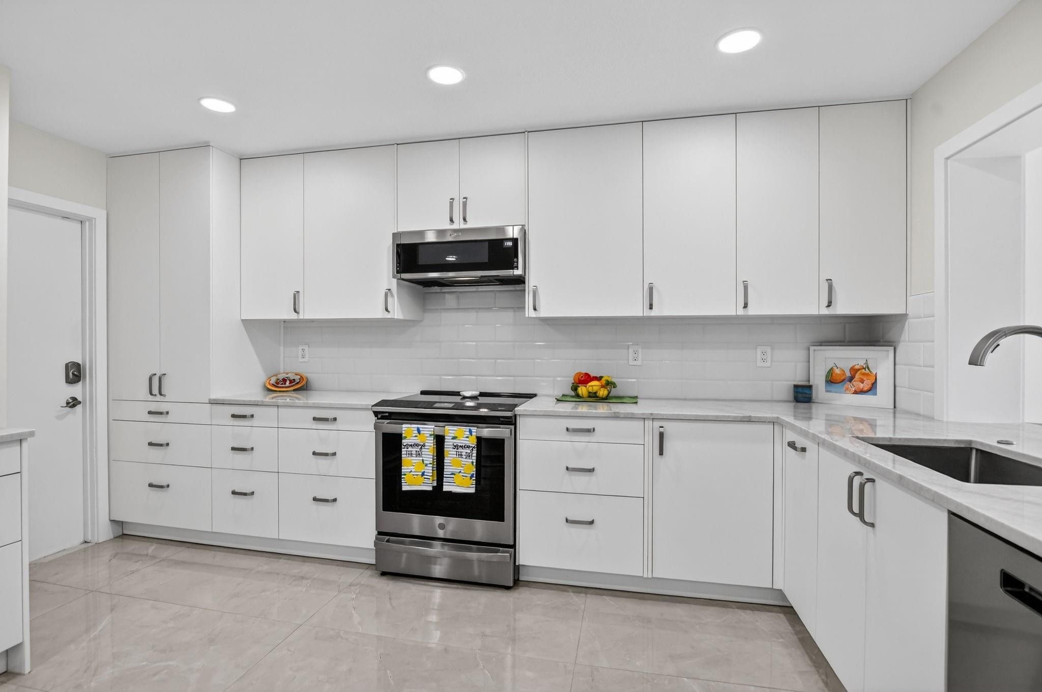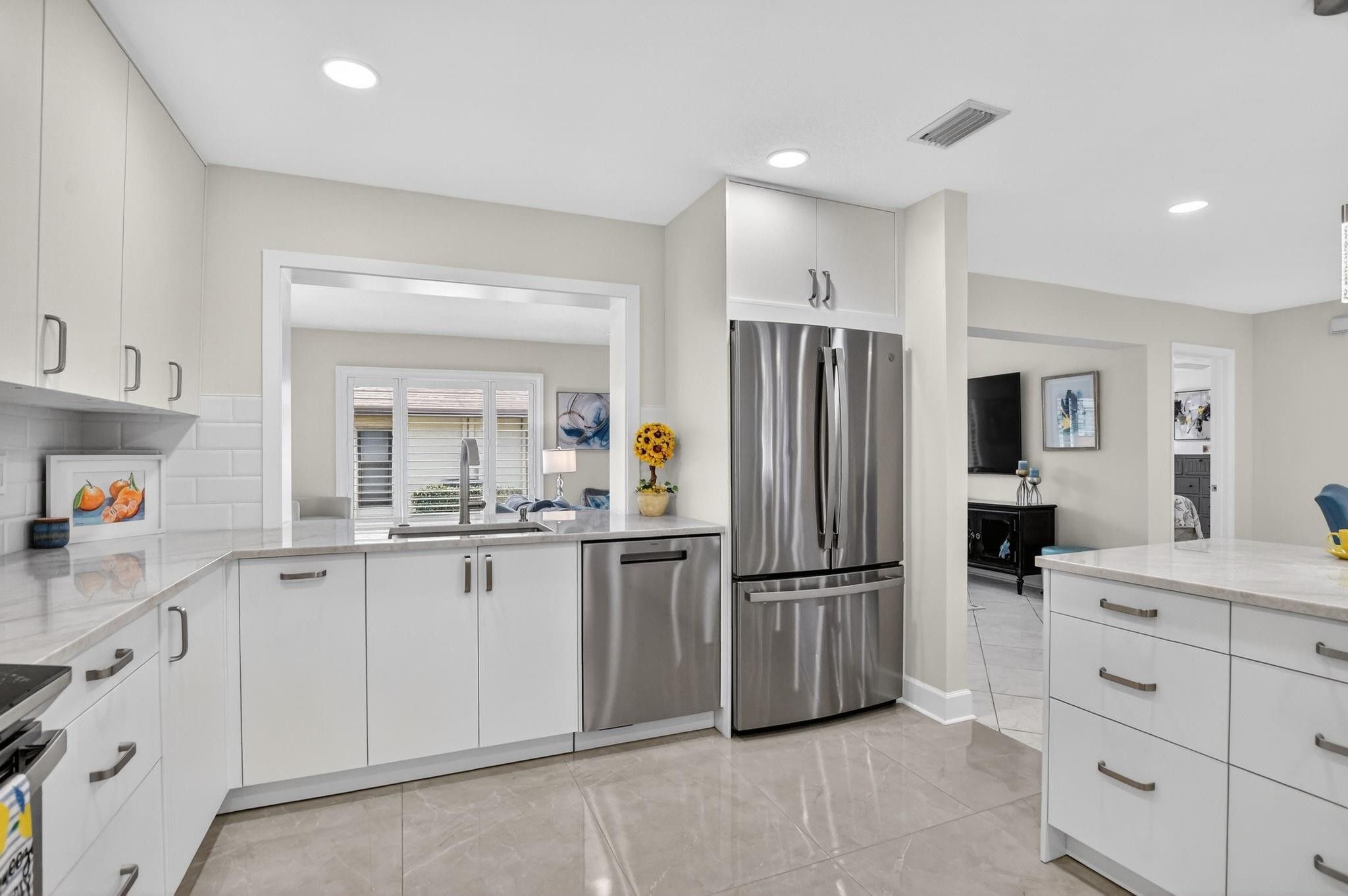 ONE OF A KIND! WOW 1,656sf! EXQUITELY REMODELED home w/ NO EXPENSE SPARED! 2/2 split BR wide-open floor plan. BRAND NEW KITCHEN & PRIMARY BATH. ALL IMPACT GLASS! Beveled glass entry into XL living areas adorned w/ knockdown ceiling & tile floors w/ 6" baseboards. Sprawl out in your DR for meals w/ guests. Designer 2025 kitchen w/ handcrafted custom cabinetry, quartzite countertops, subway tile backsplash, farmhouse sink, double pantry w/ pull out shelves, and new GE stainless appliances. Fall in love in your bright & spacious 16' x 11' primary suite w/ a walk-in closet & NEW, spa-inspired bath. Big corner guest BR features a w/in closet & NEW bath w/ frameless shower. HUGE FR is bathed in natural light. 2019 roof, epoxy garage floor. Desirable 55+ community of Meadows of Crystal Lake!